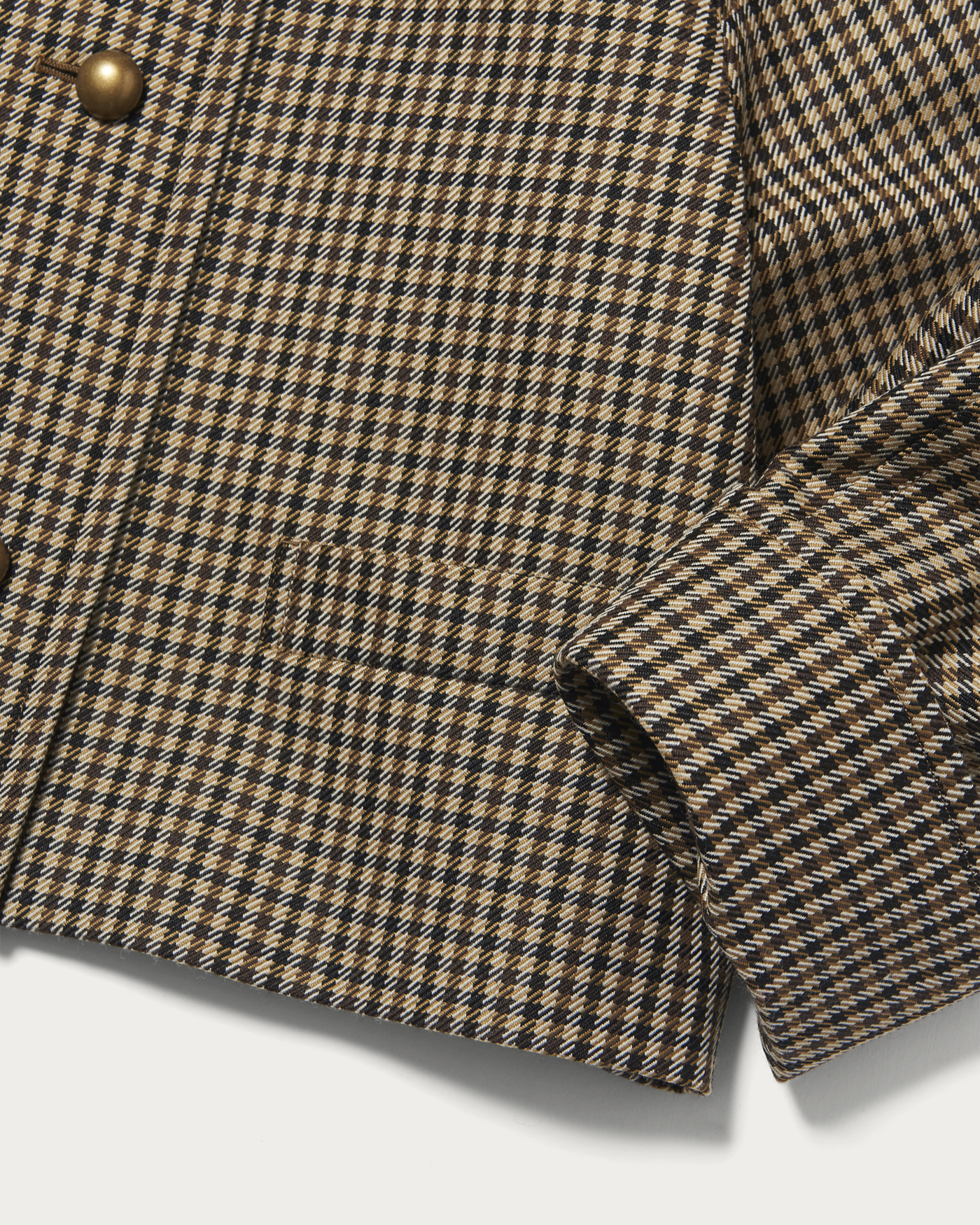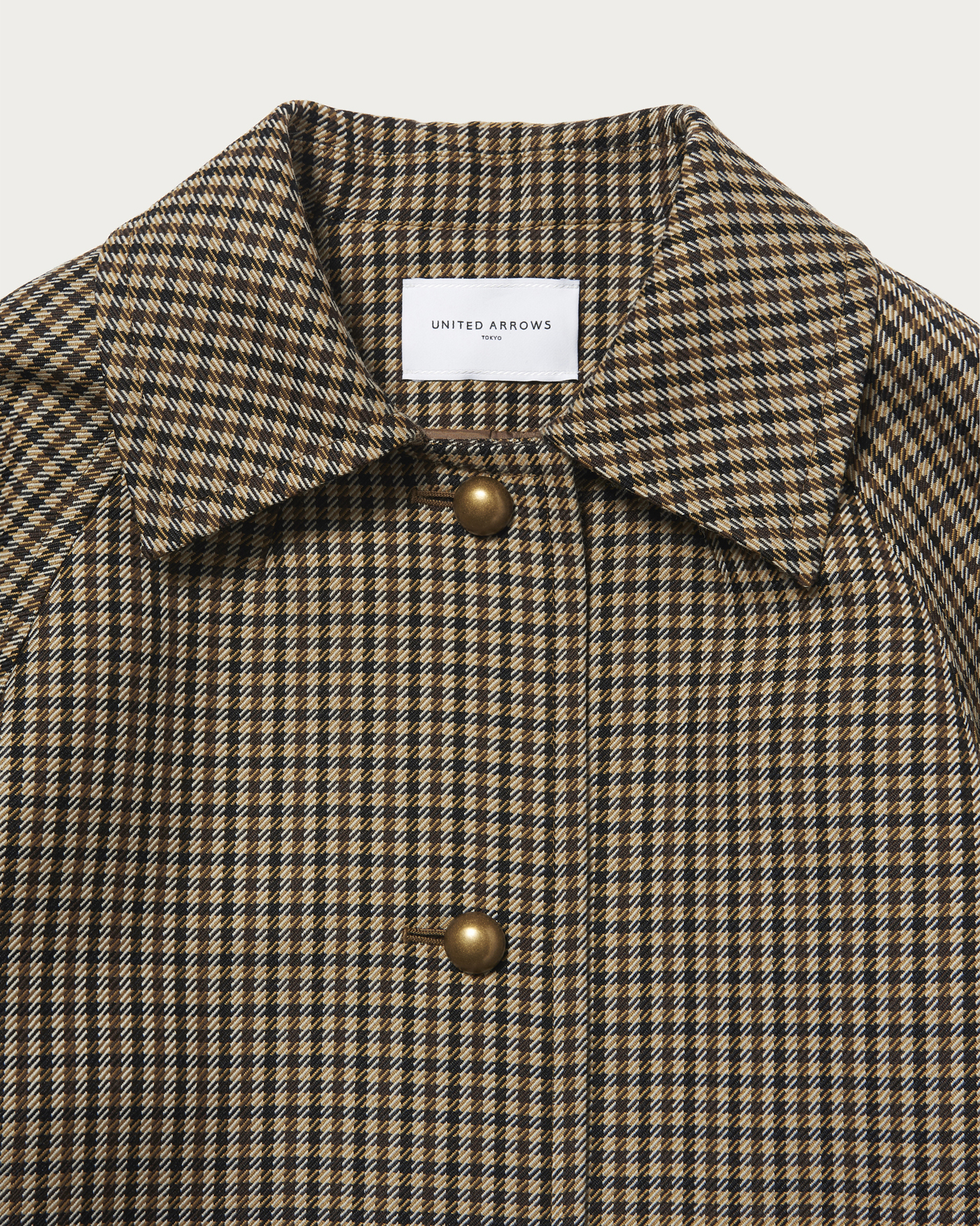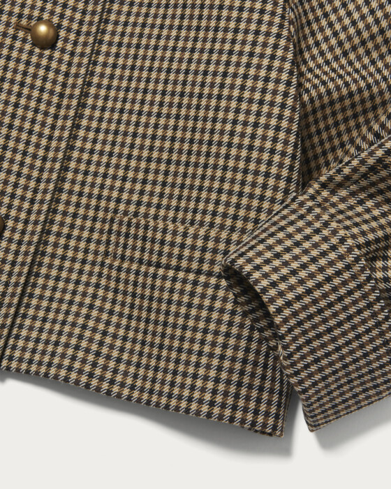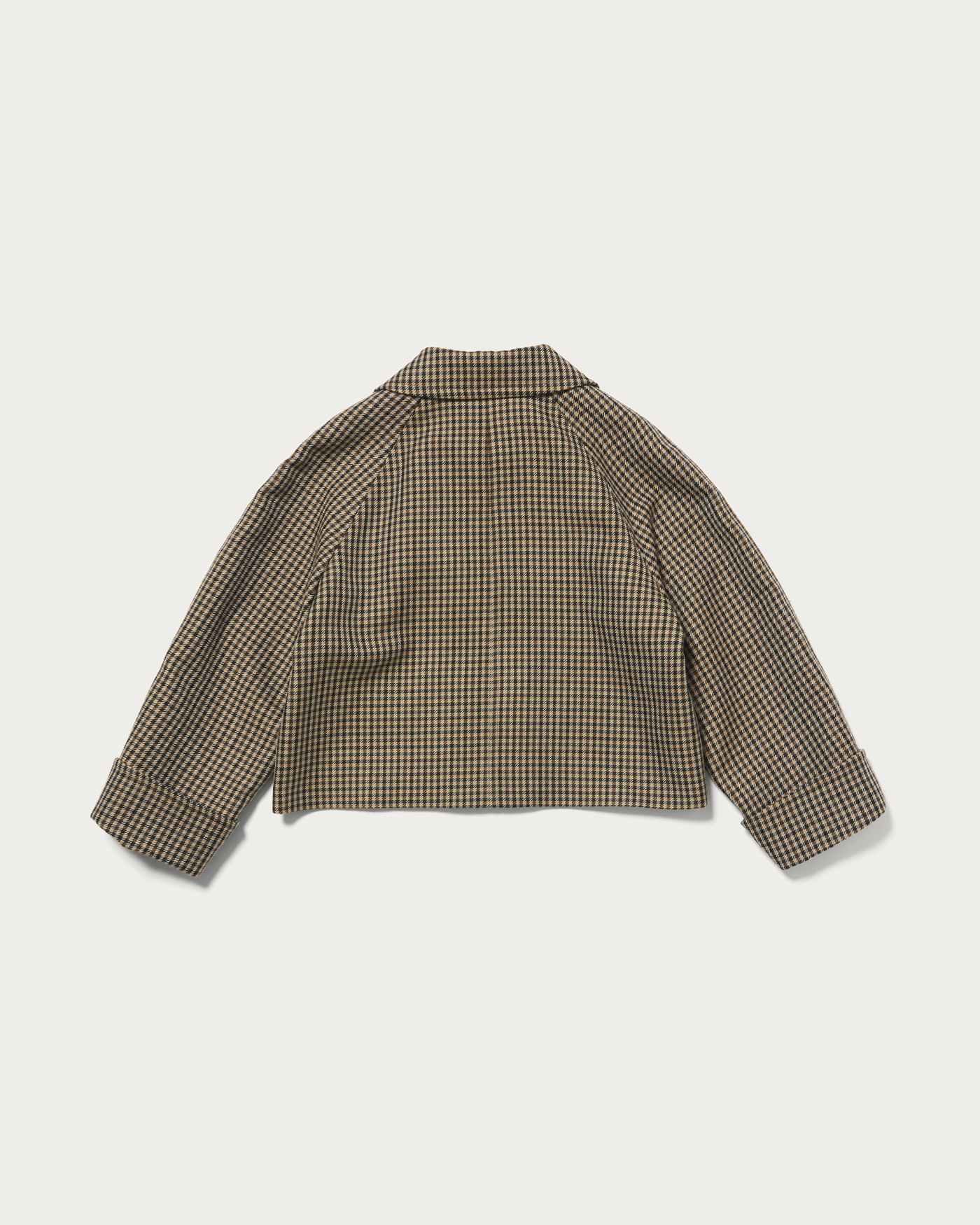 A short jacket with a stand collar that adds a fresh touch to your outfit. The oversized silhouette combined with the short length gives it a trendy look. It features a striking collar, three-dimensional metal buttons, and a trendy color pattern. Made from a wool blend fabric, this piece is perfect for wearing from early fall through a long season.