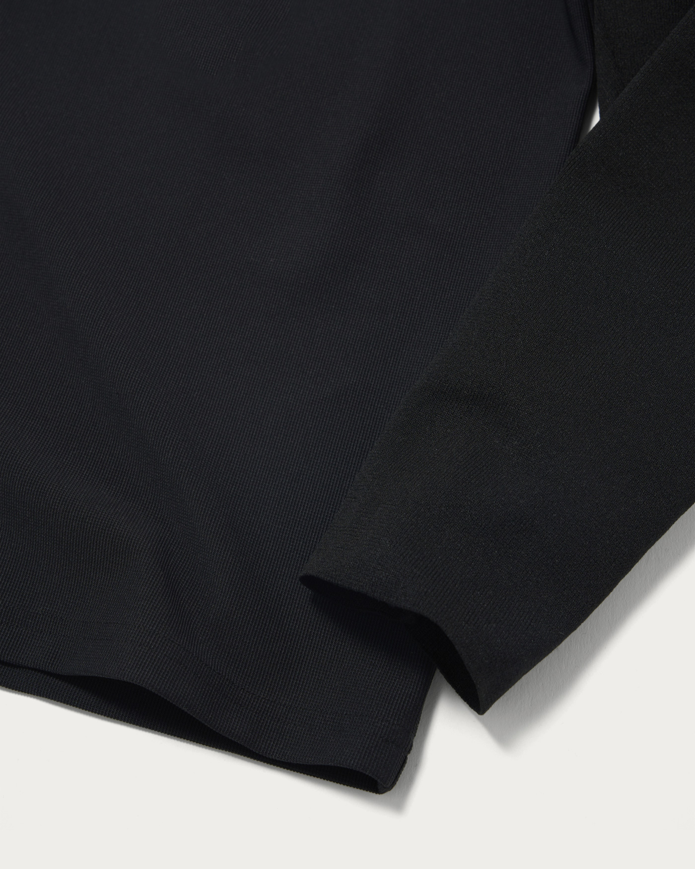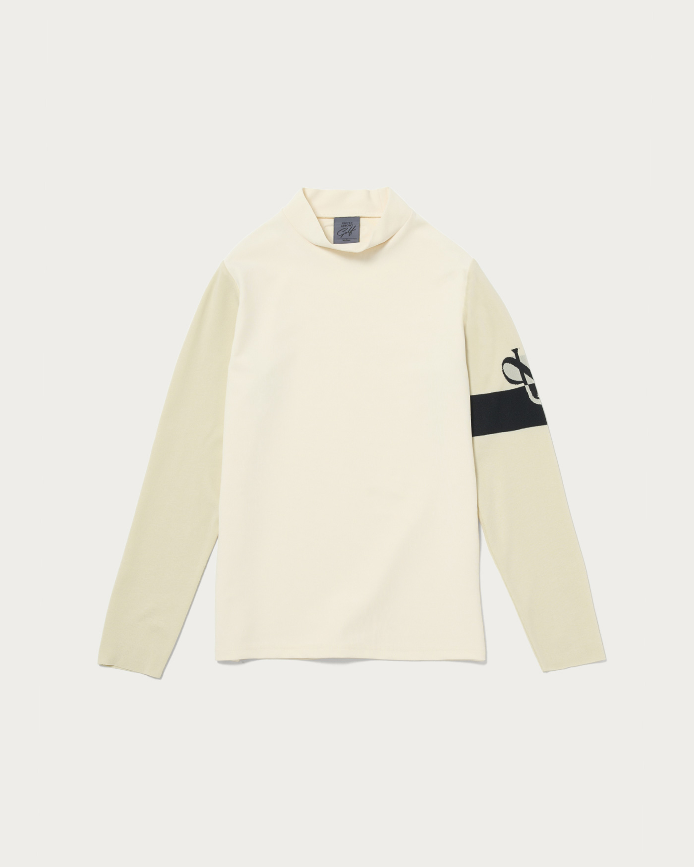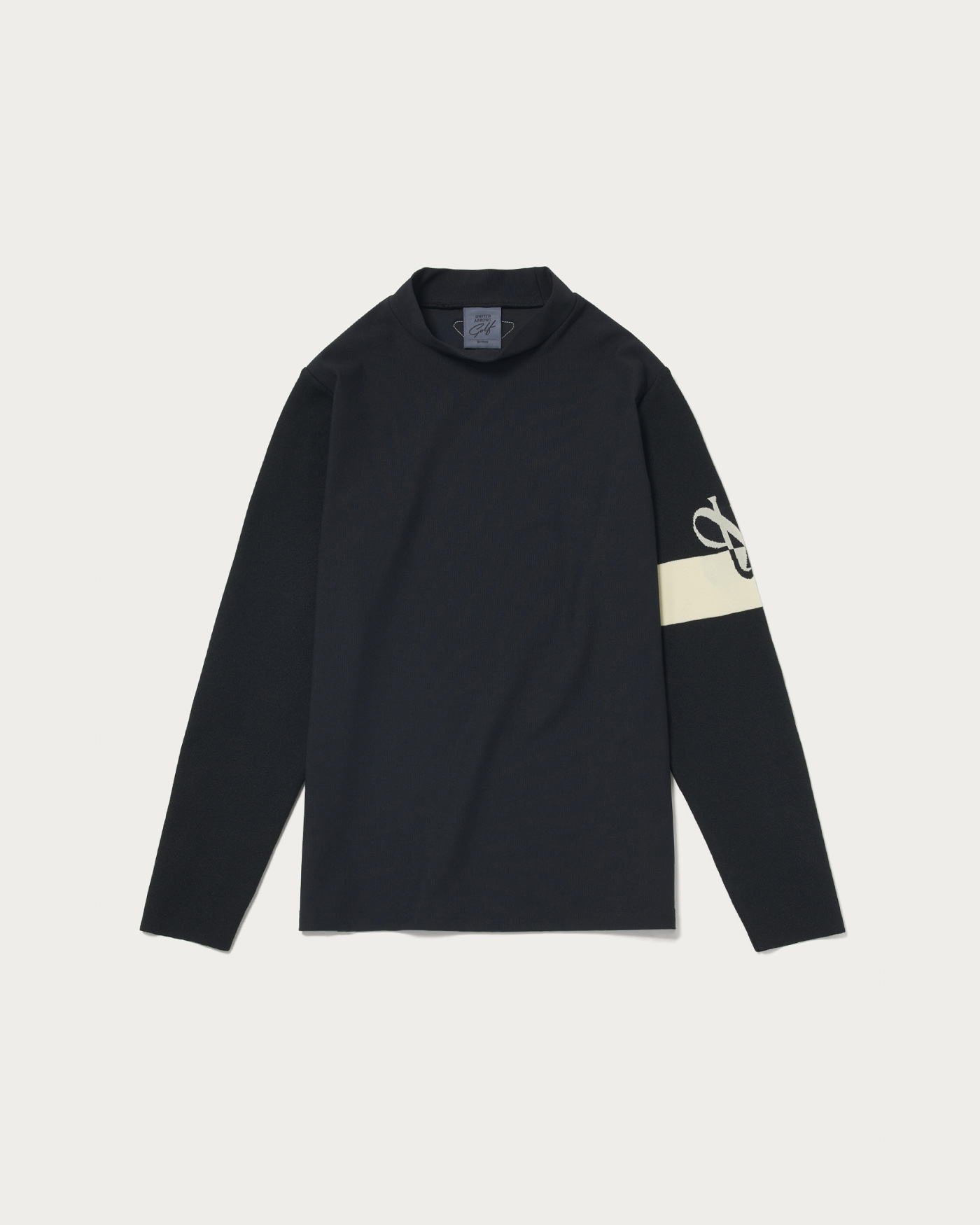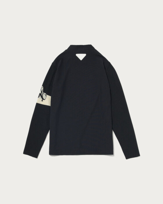 This season's top-recommended knitwear. Features an asymmetrical logo on the sleeves with a two-tone design. It has a moderate thickness and stretch, making it suitable to wear on its own. It can be paired with a wide range of bottoms, including wide or slim pants and skirts.