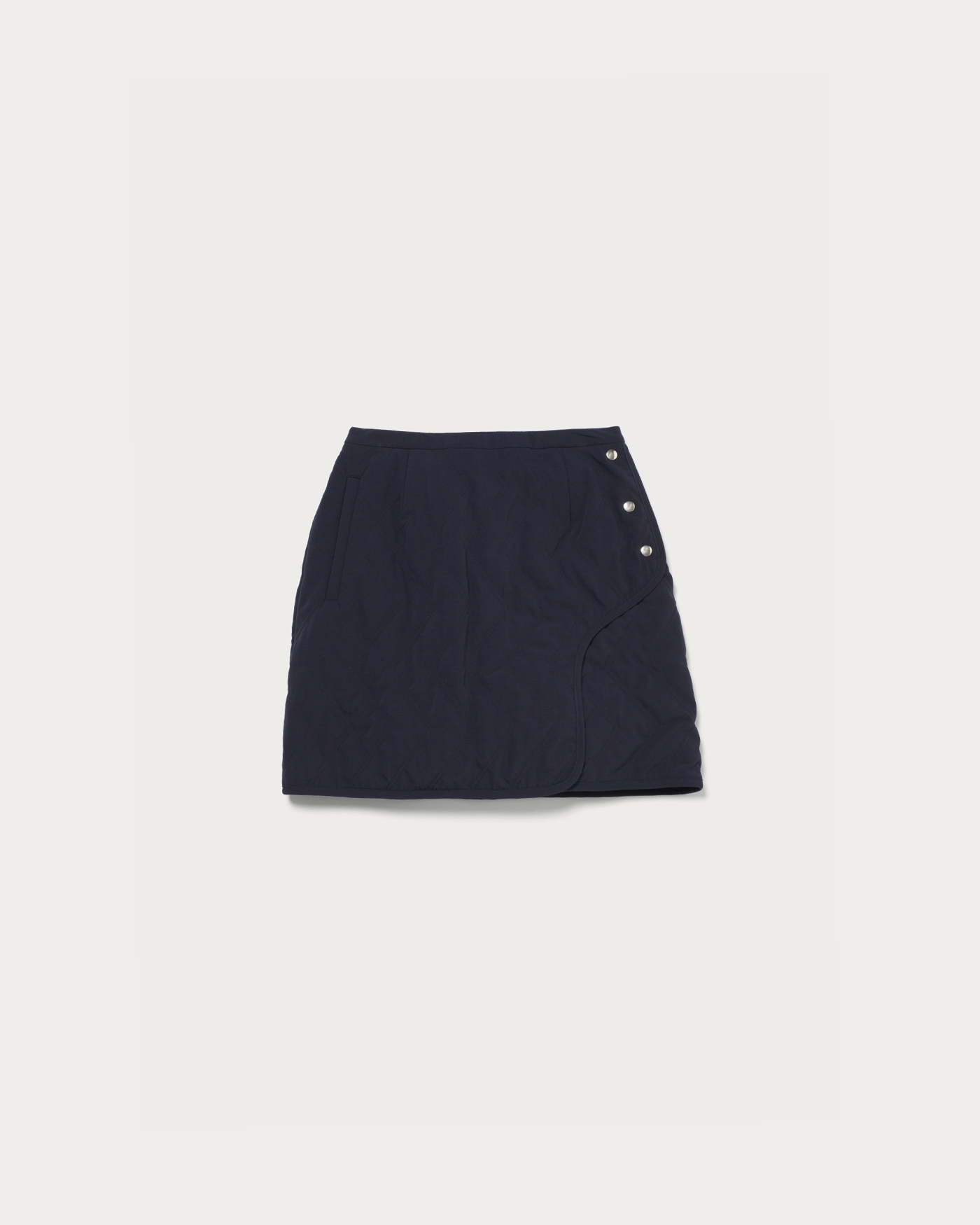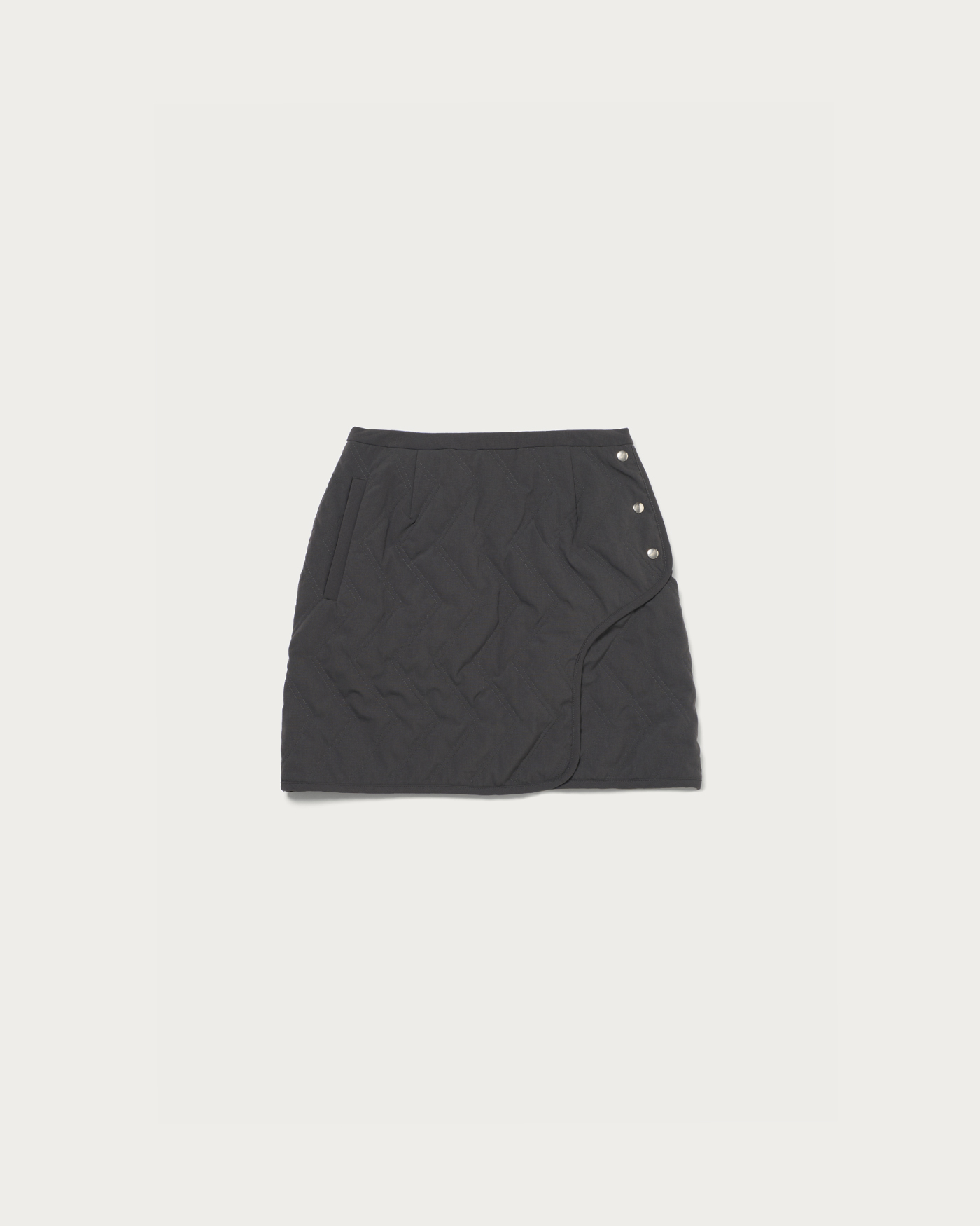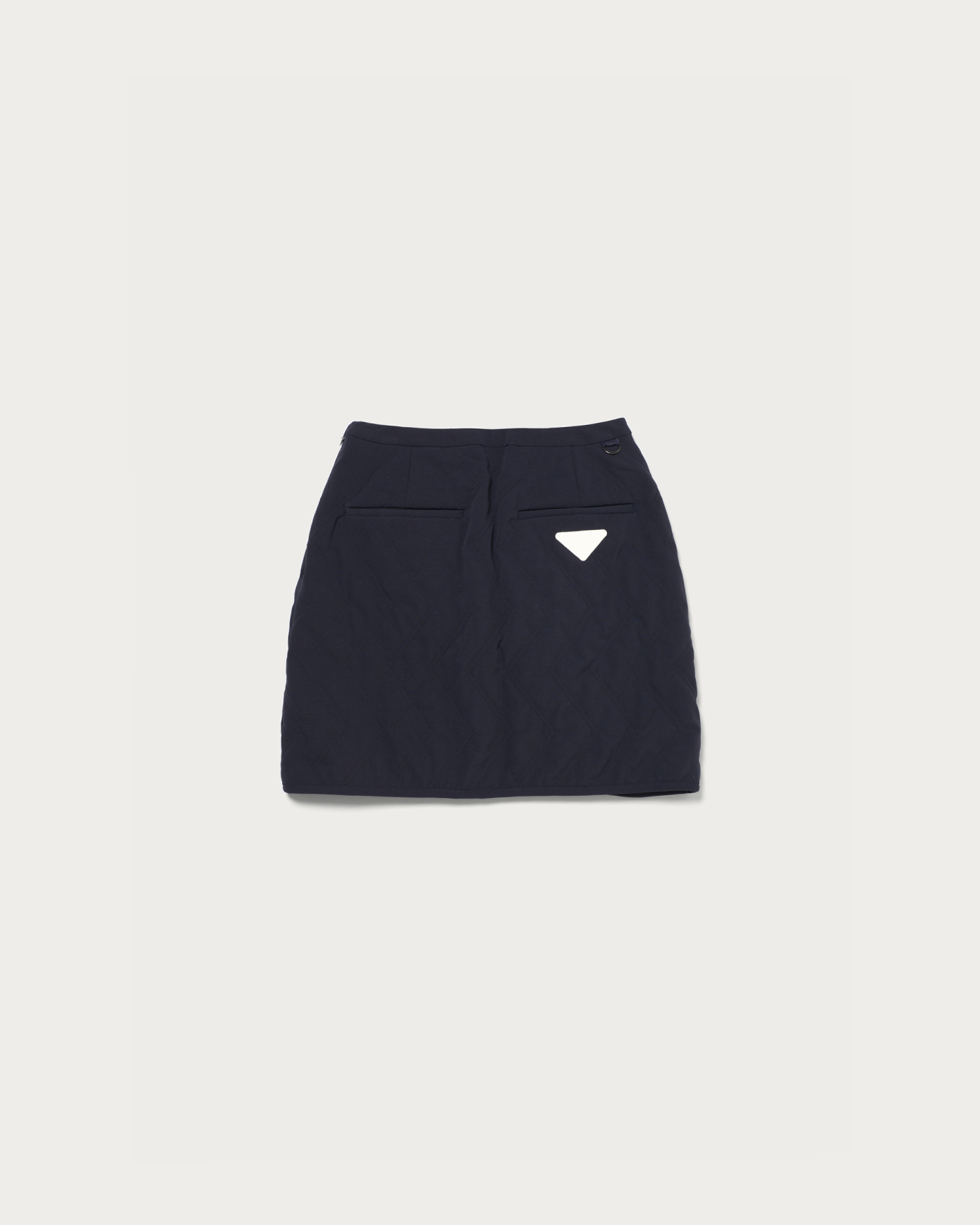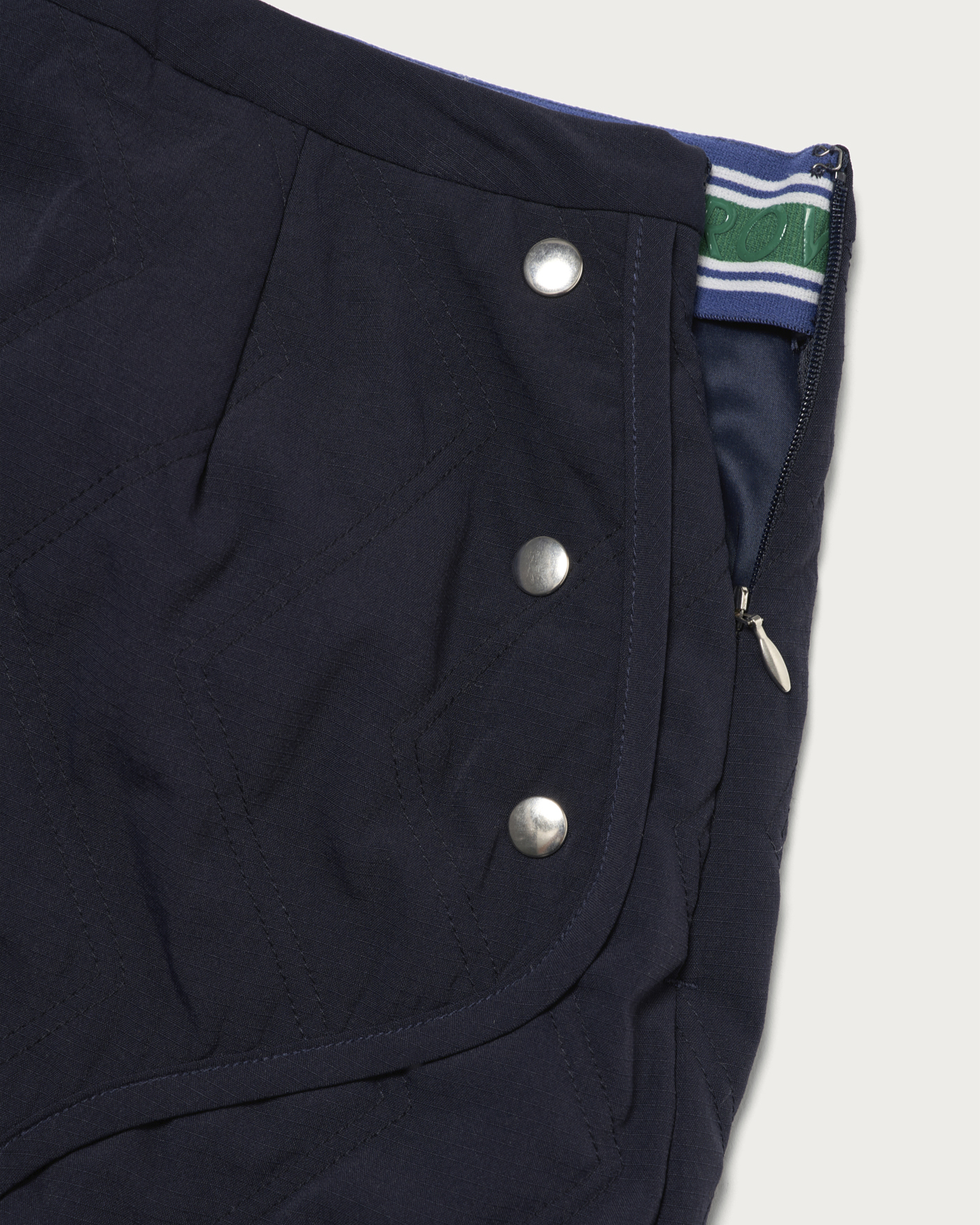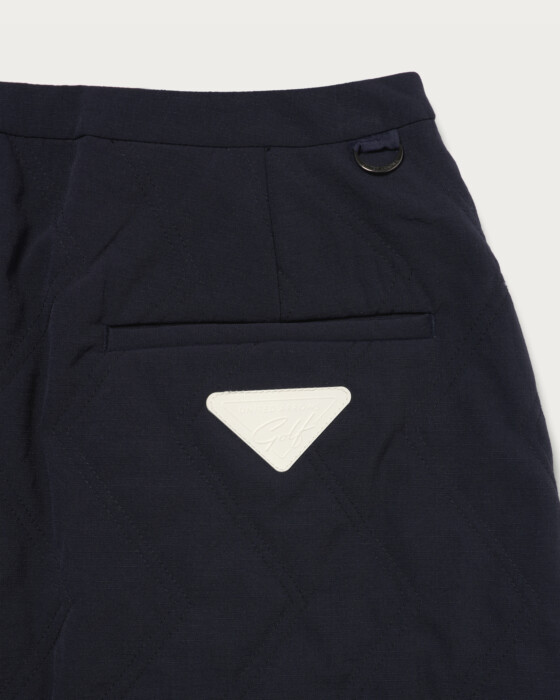 A trapezoid skort with padding, featuring a combination of different materials and a zigzag quilted stretch fabric. The moderate stretch ensures a comfortable fit that doesn't hinder movement during swings. The zigzag quilting adds a rich, textured appearance, enhancing its luxurious impression. Subtle button details on the sides add a touch of classic retro-sporty flair.