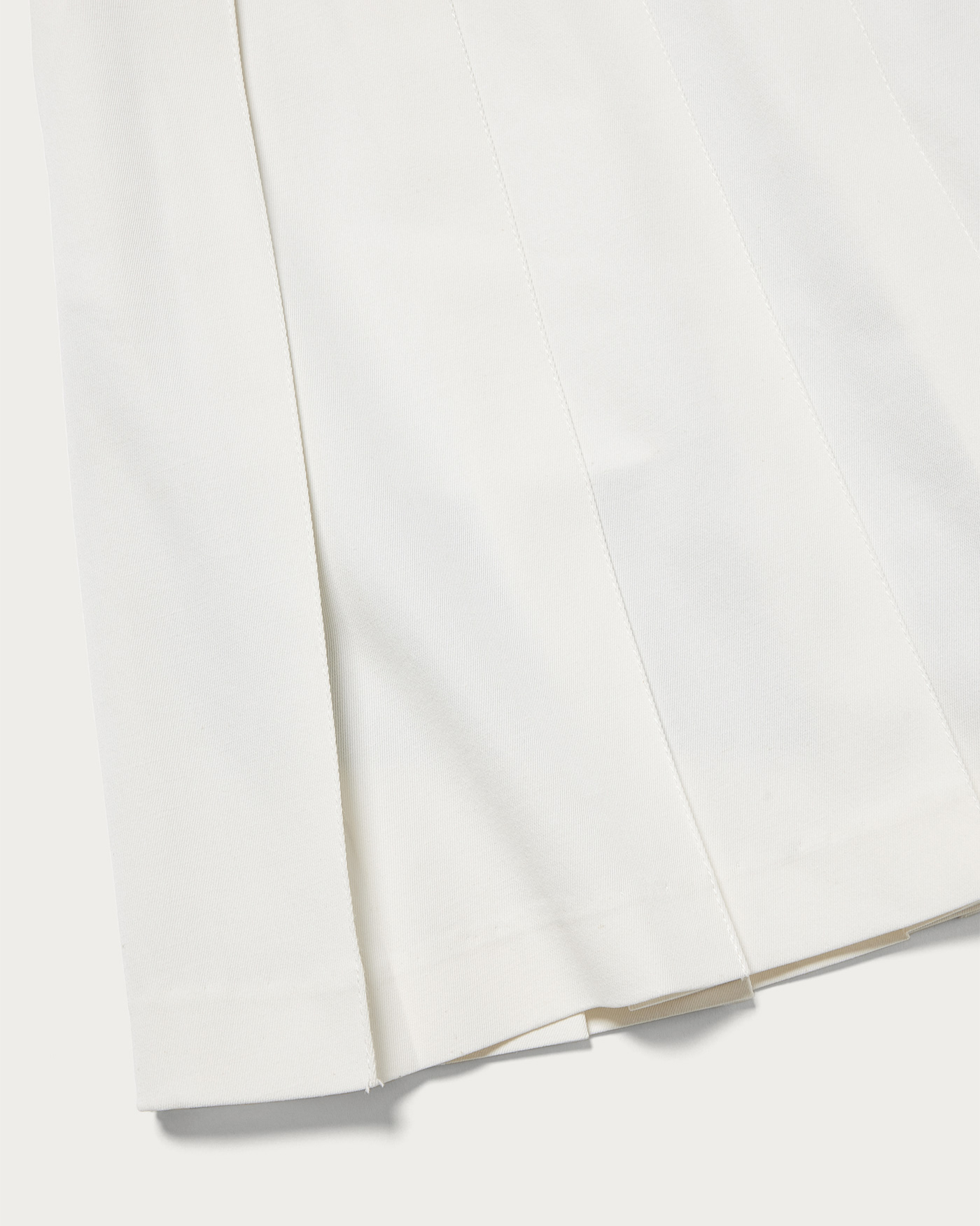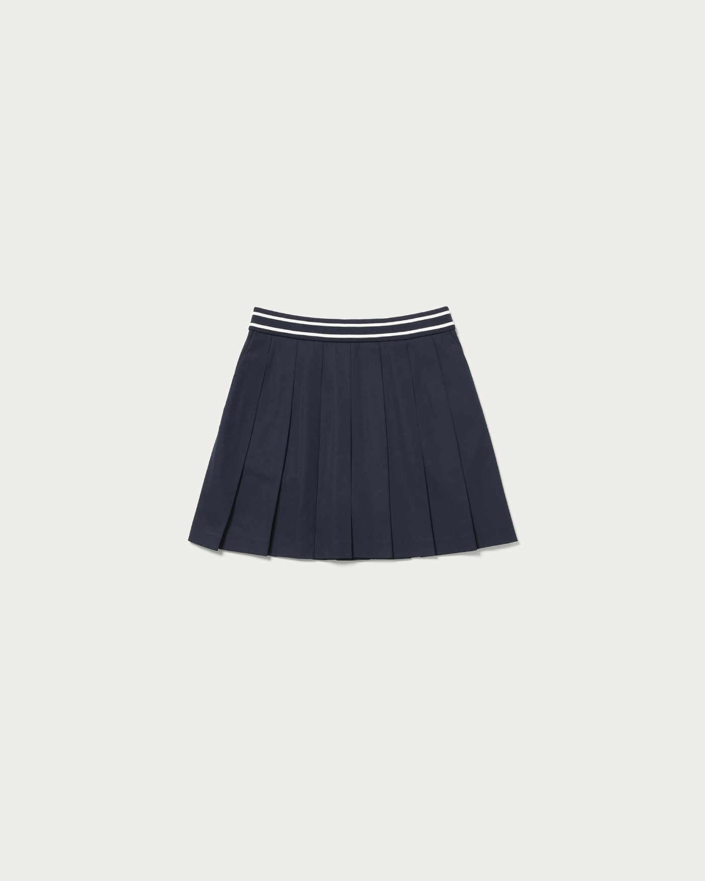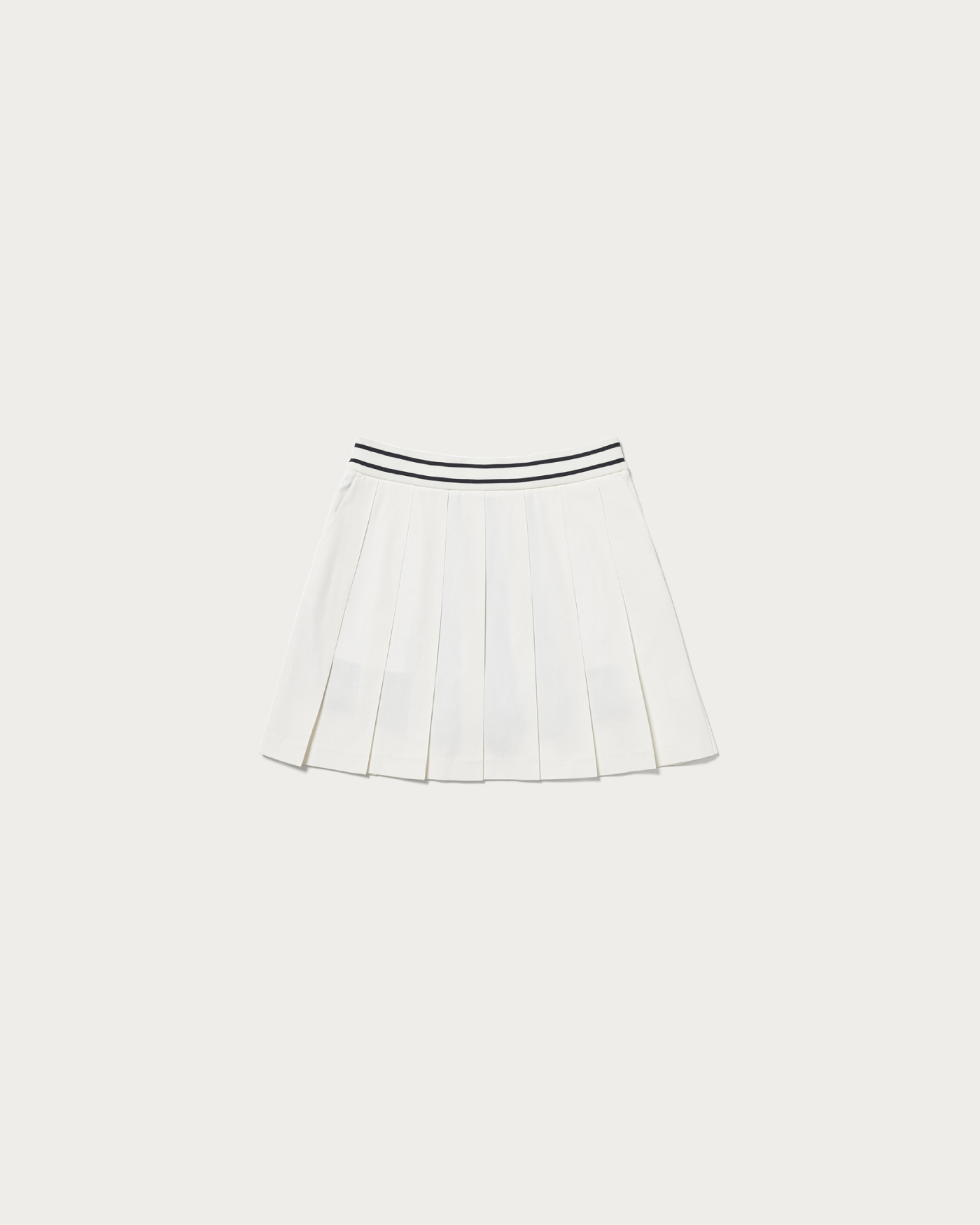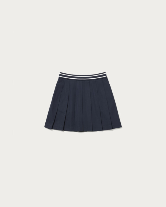 Pleated skirt made from high-performance twill fabric that excels in durability and water repellency. The integrated inner shorts provide both ease of movement and a sense of security. The ribbed waistband features a line design, adding a sporty accent that evokes the essence of club sports. The back style has an asymmetrical cut for a modern impression, and a brand icon patch is subtly placed below the left pocket for a discreet accent.