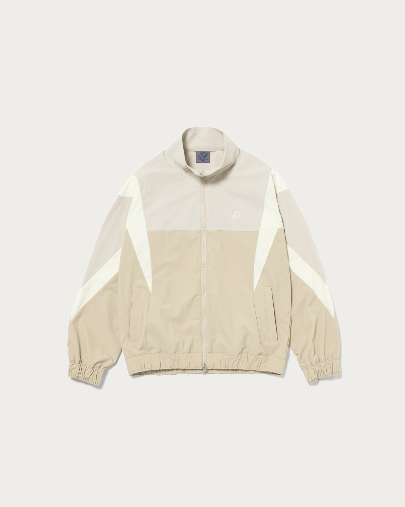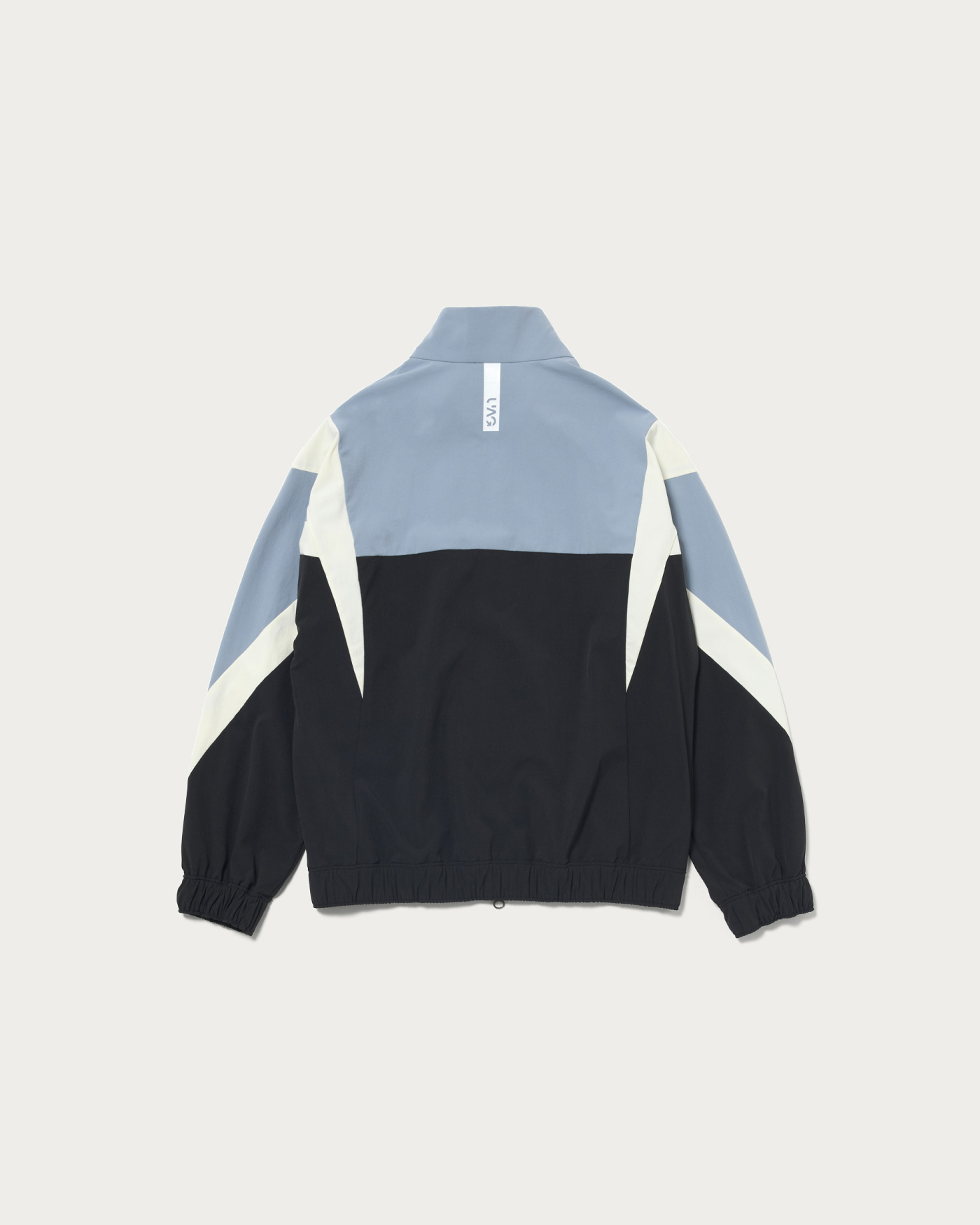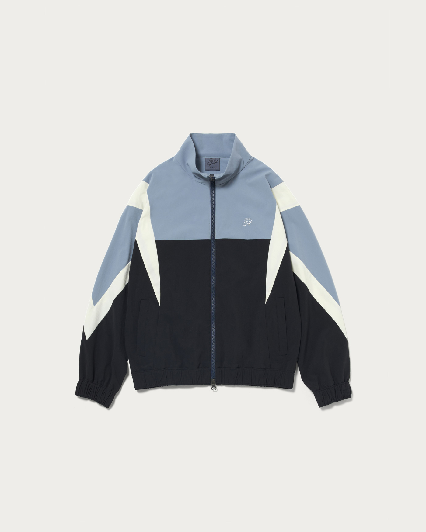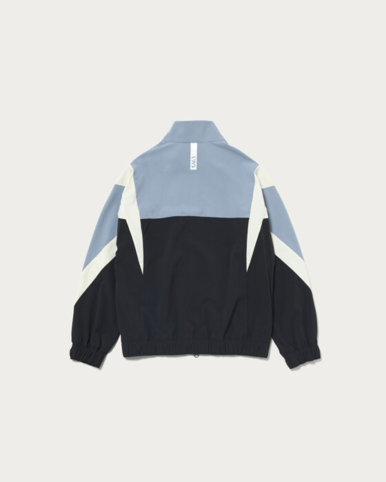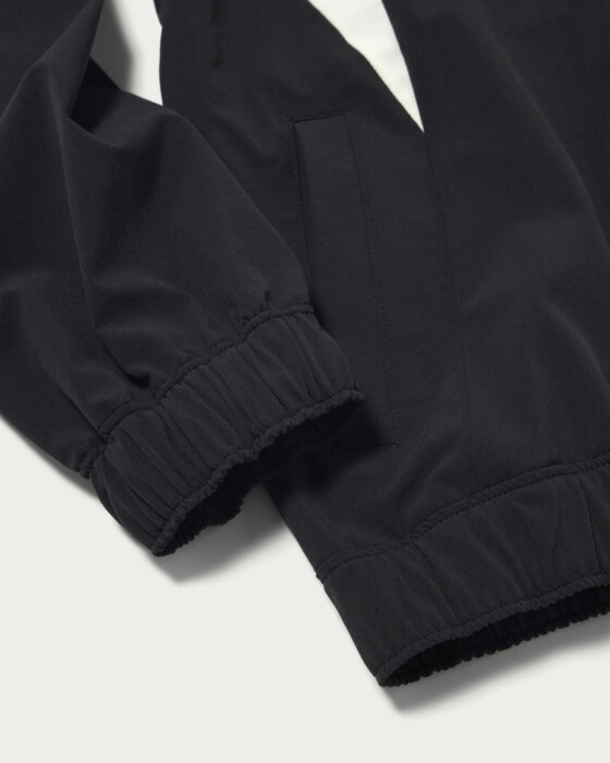 Ladies' blouson made with supple nylon 4-way stretch material. Featuring a stand-up collar and full-zip design for easy on and off. The cuffs and hem are equipped with elastic shirring, providing a comfortable hold while creating a natural sense of volume. The bold panel pattern gives an edgy impression, yet maintains a moderately sporty design. The brand logo is subtly placed on the chest, and a bar logo print on the back adds an accent.