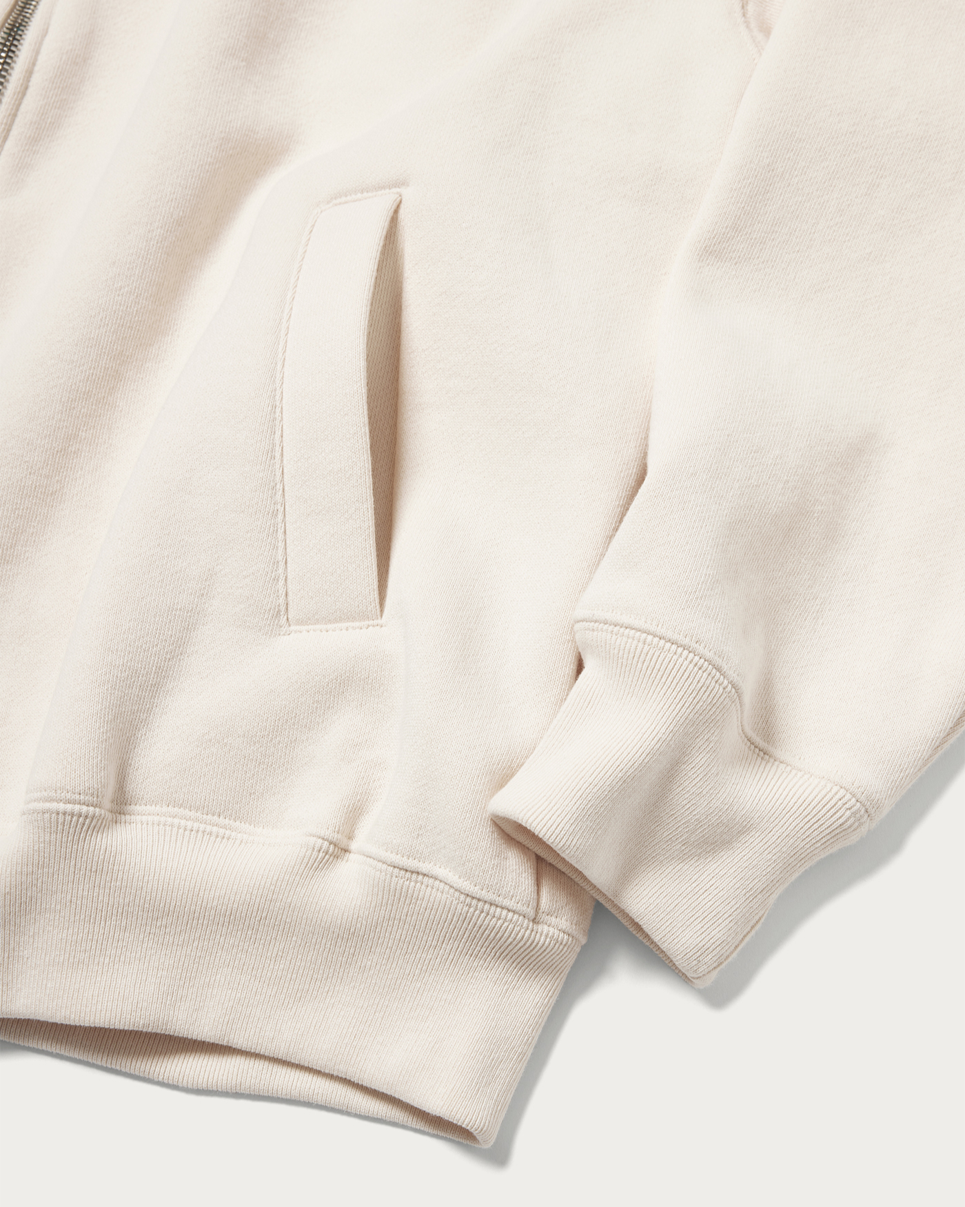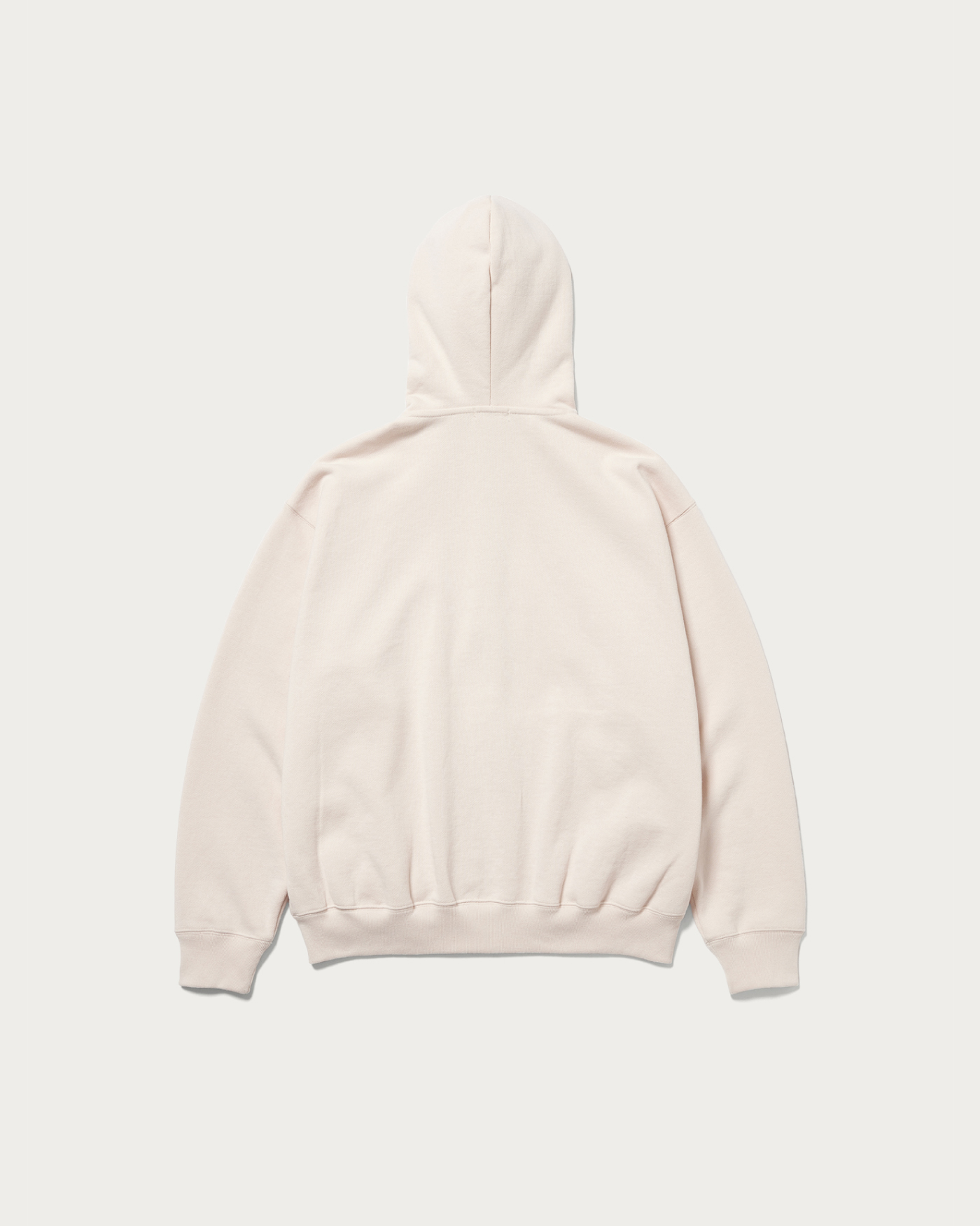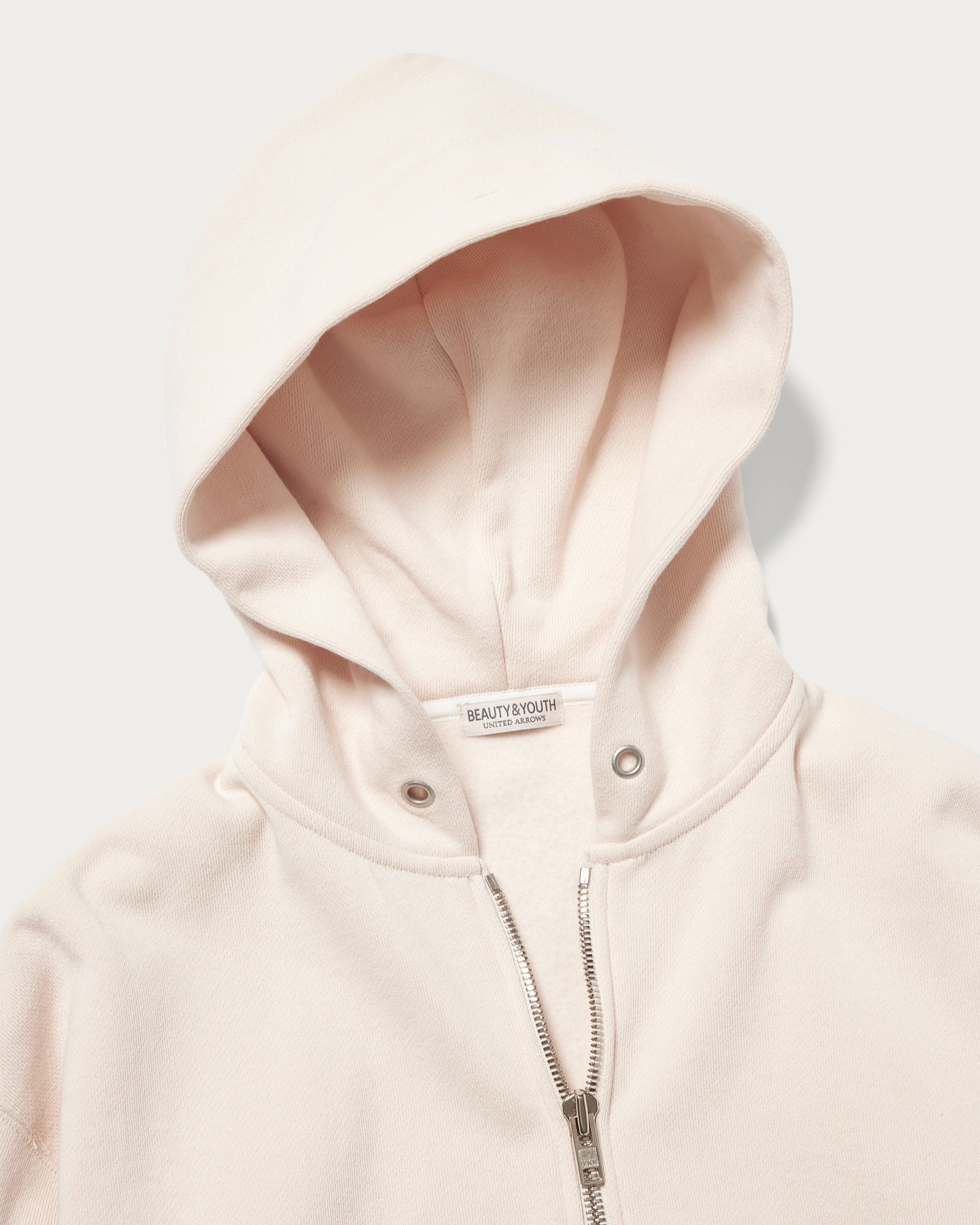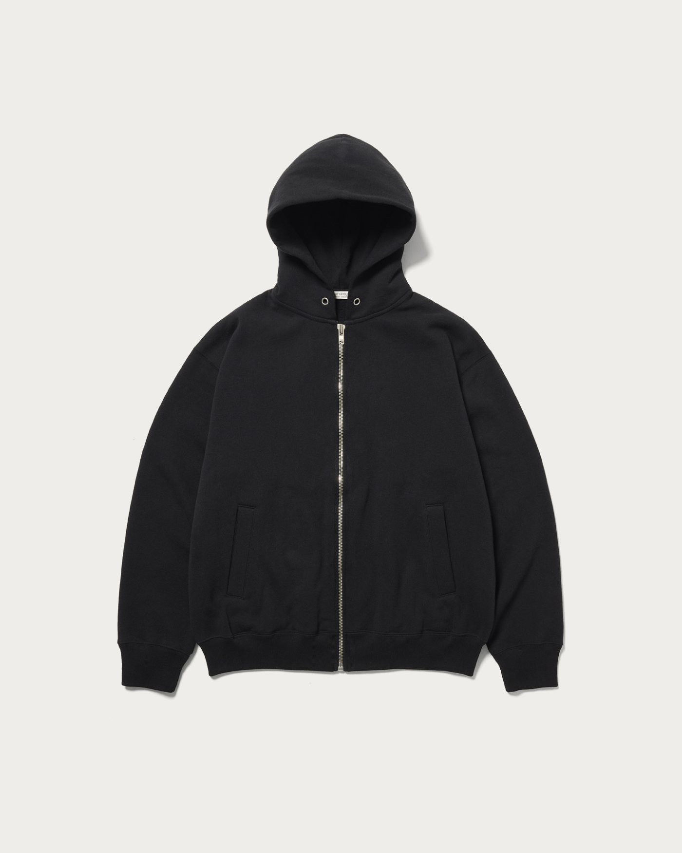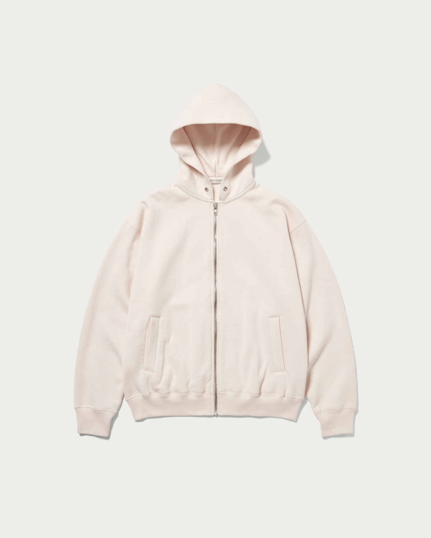 A classic zip hoodie reminiscent of vintage sweatshirts. The fabric is designed to have a brushed feel, as if it has been repeatedly washed and dried, giving it a deliberately dry texture. Additionally, features like the snug ribbed cuffs creating a rounded silhouette and the wavy front zipper give it a worn-in look despite being brand new. The short length and waist pockets are crafted to allow it to be worn like a blouson.