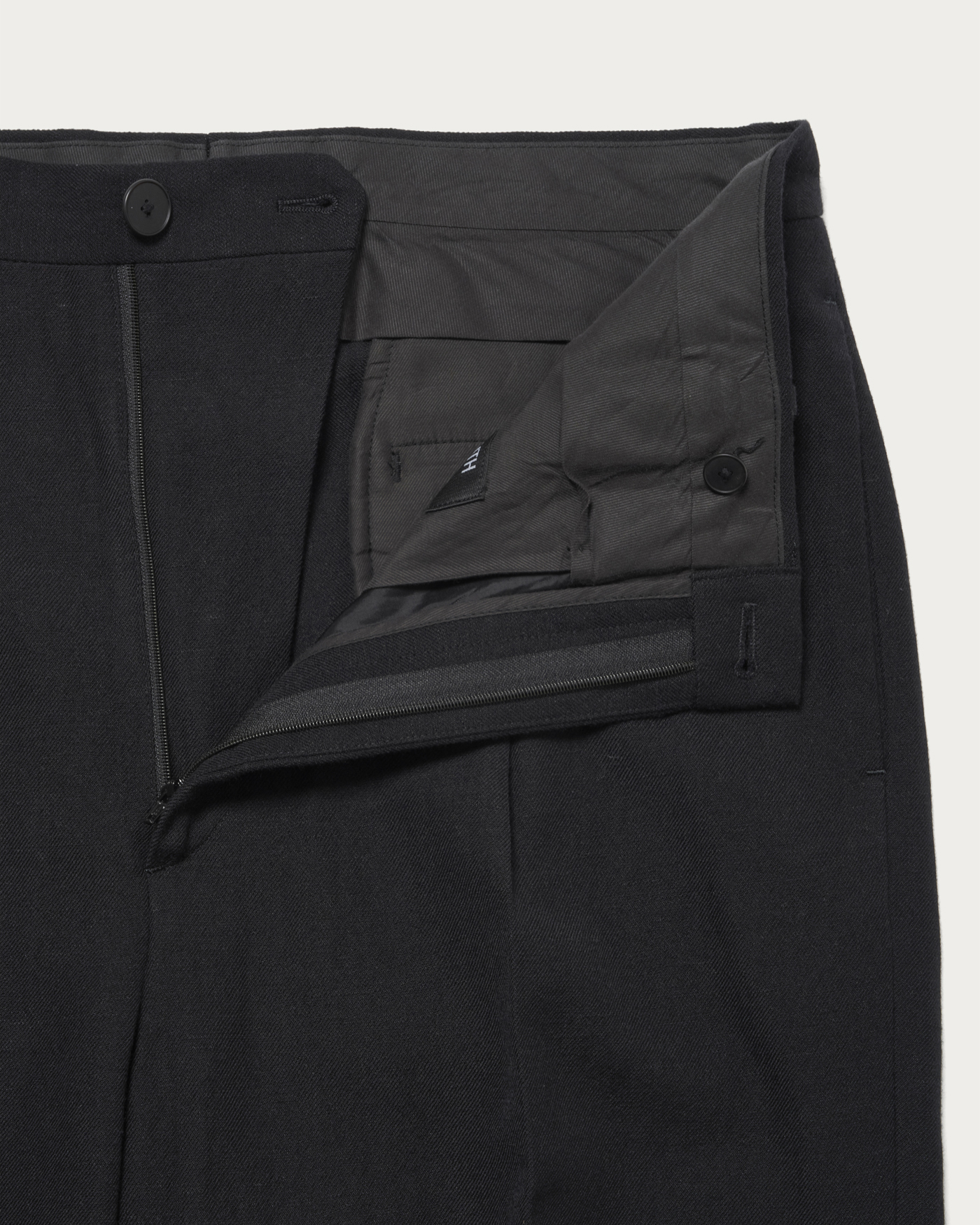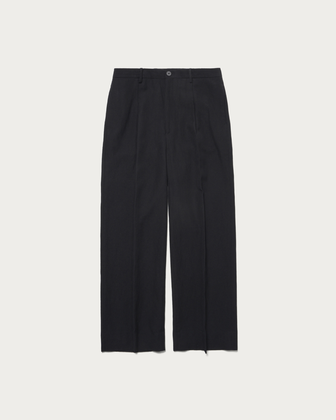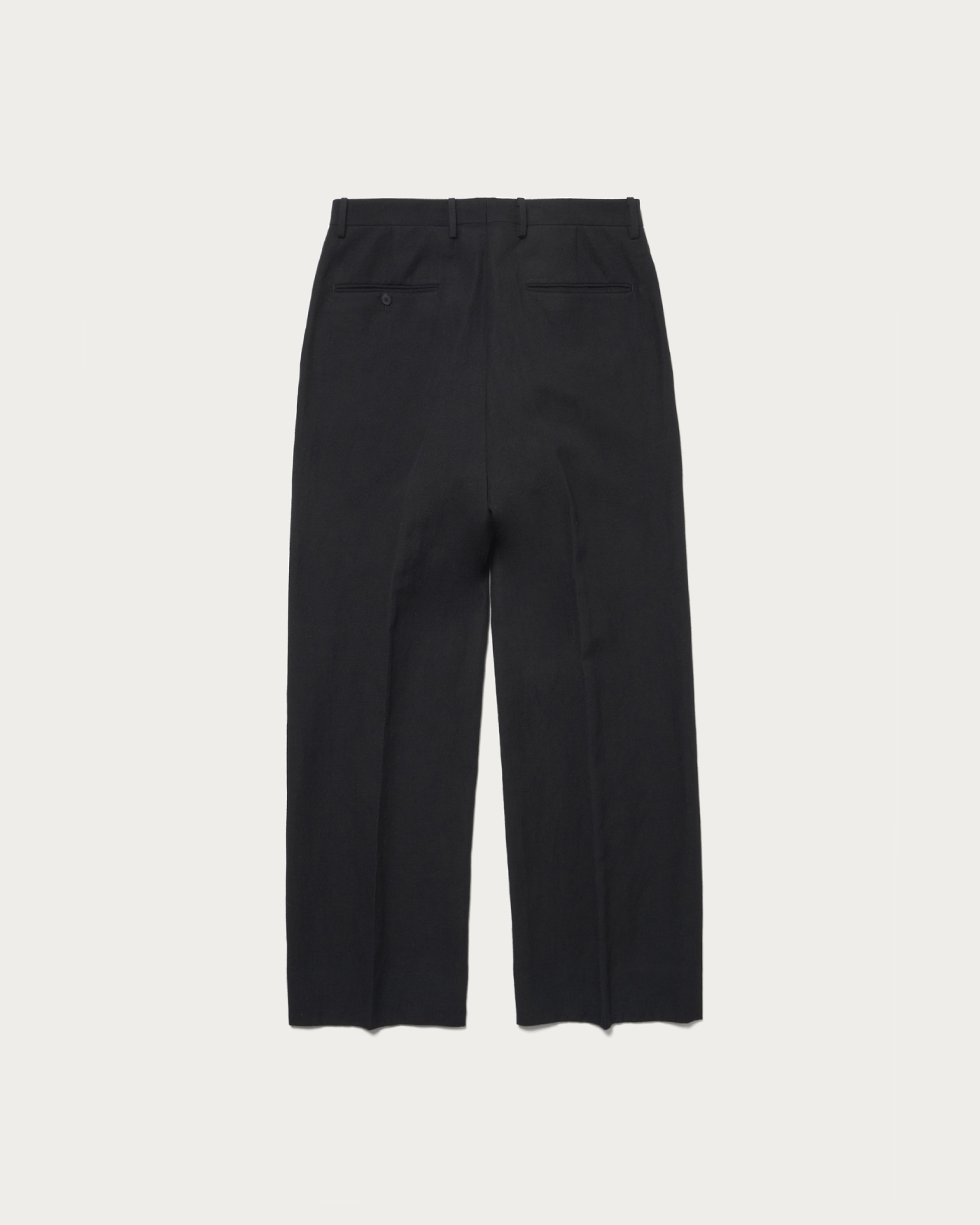 Slightly tapered wide slacks. Luxuriously crafted from a wool and linen blend fabric, these slacks are designed with a relaxed fit for a sophisticated urban look. Featuring luxurious buffalo buttons and a custom name tag, this piece exudes a sense of exclusivity. It can be worn as a set with a double-breasted jacket made from the same fabric.