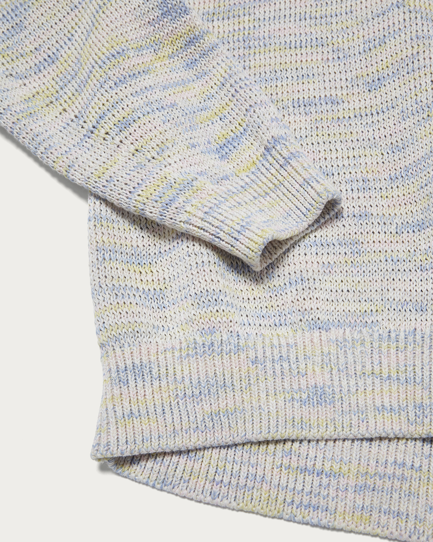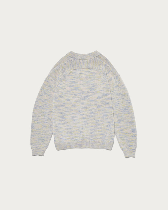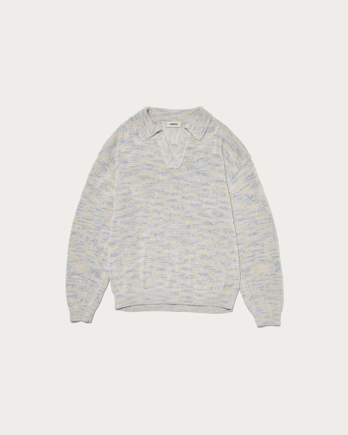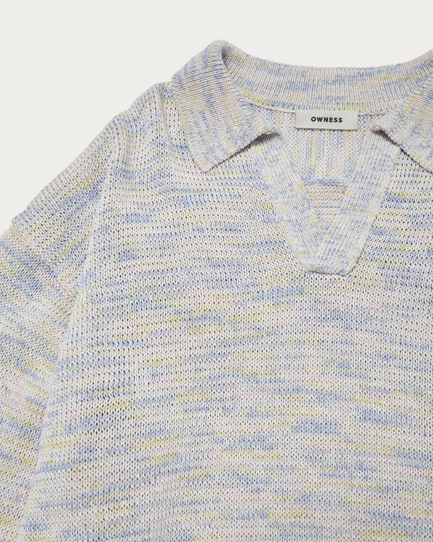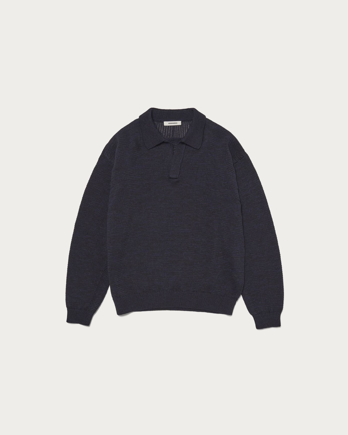 〈OWNESS〉, which launched last fall and winter, is a knitwear brand inspired by traditional wardrobes and reimagined with a modern twist. In its second season, the standout piece is the skipper knit polo. Available in two colors—navy and a mixed color—each piece is meticulously crafted from the selection of yarn to the final finish. The navy combines black and dark royal to achieve a rich, deep hue. The other option features a unique color achieved by dyeing a single thread with four different colors. The balloon silhouette, enhanced with ribbing at the hem and sleeves, along with set-in sleeves and saddle shoulders, ensures a comfortable, stress-free fit.
