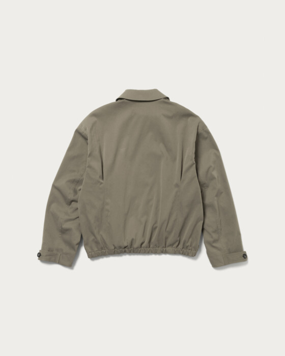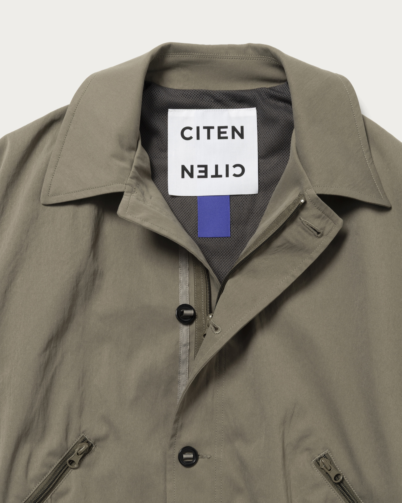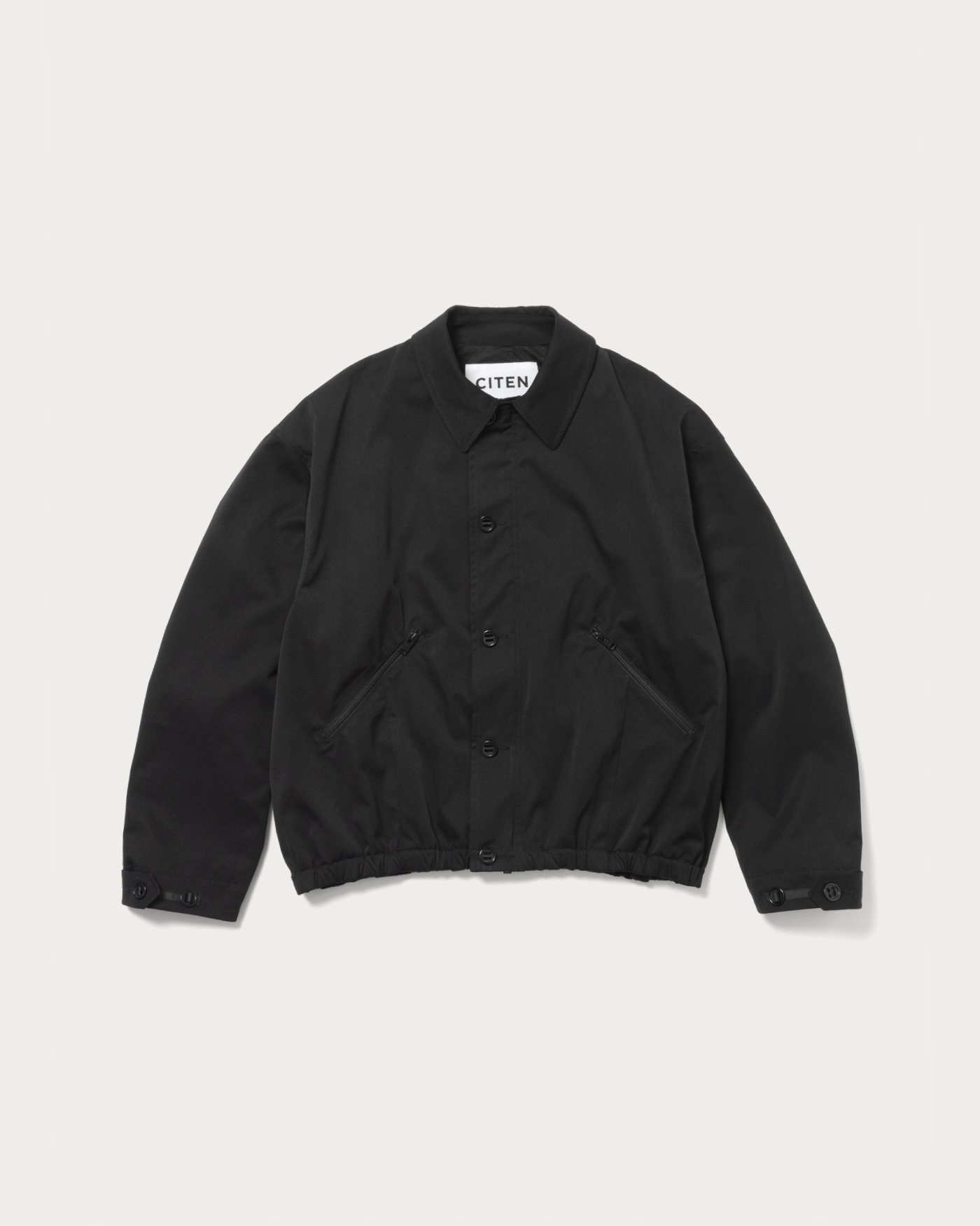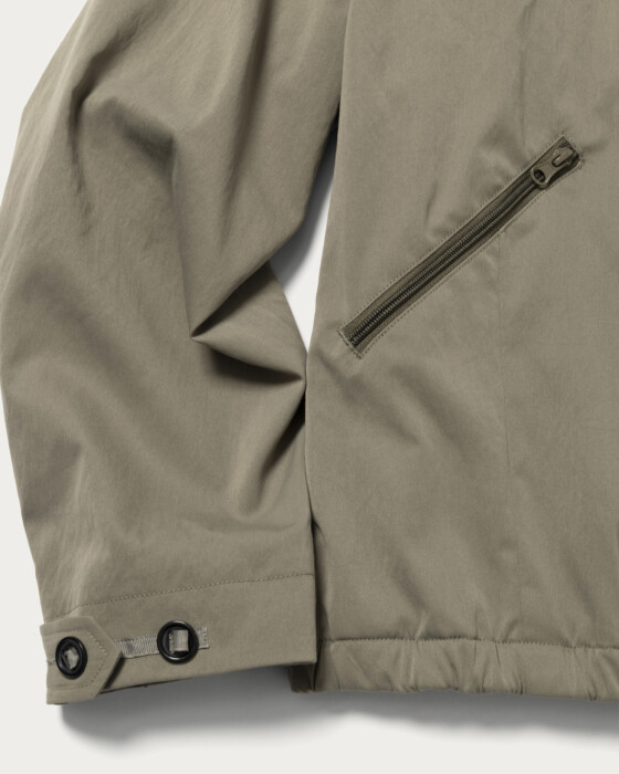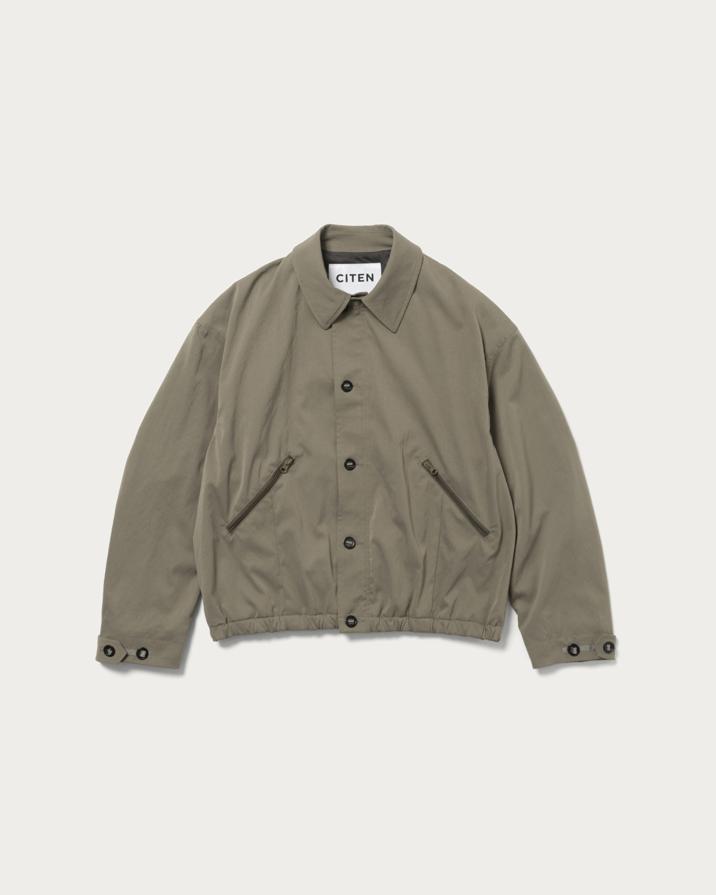 A parachute blouson made from polyester material known for its soft touch. Based on vintage archives, it has been adapted into a modern silhouette characteristic of CITEN. The design features a perfectly balanced collar that is not too large, a button design on the front, and darts extending from the pockets, all expressed in a harmonious balance.
