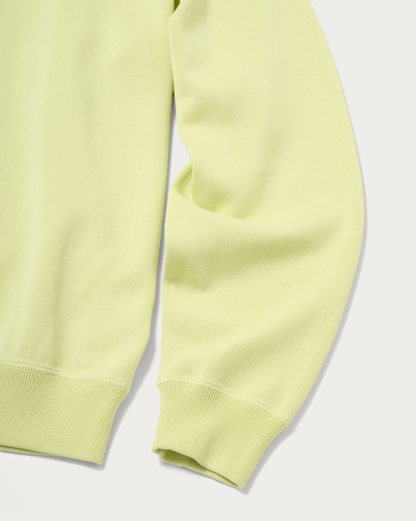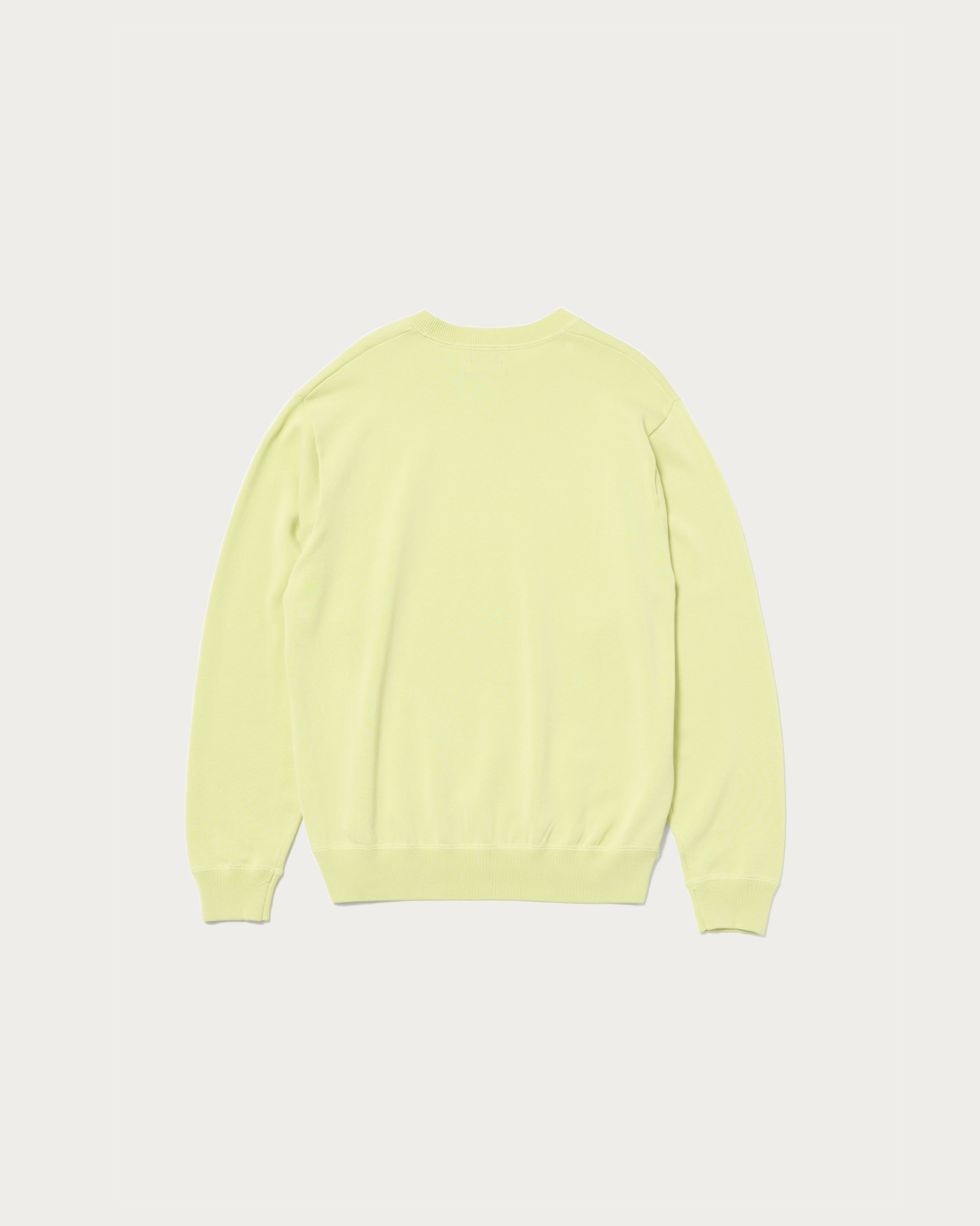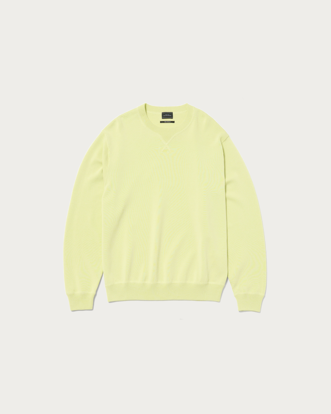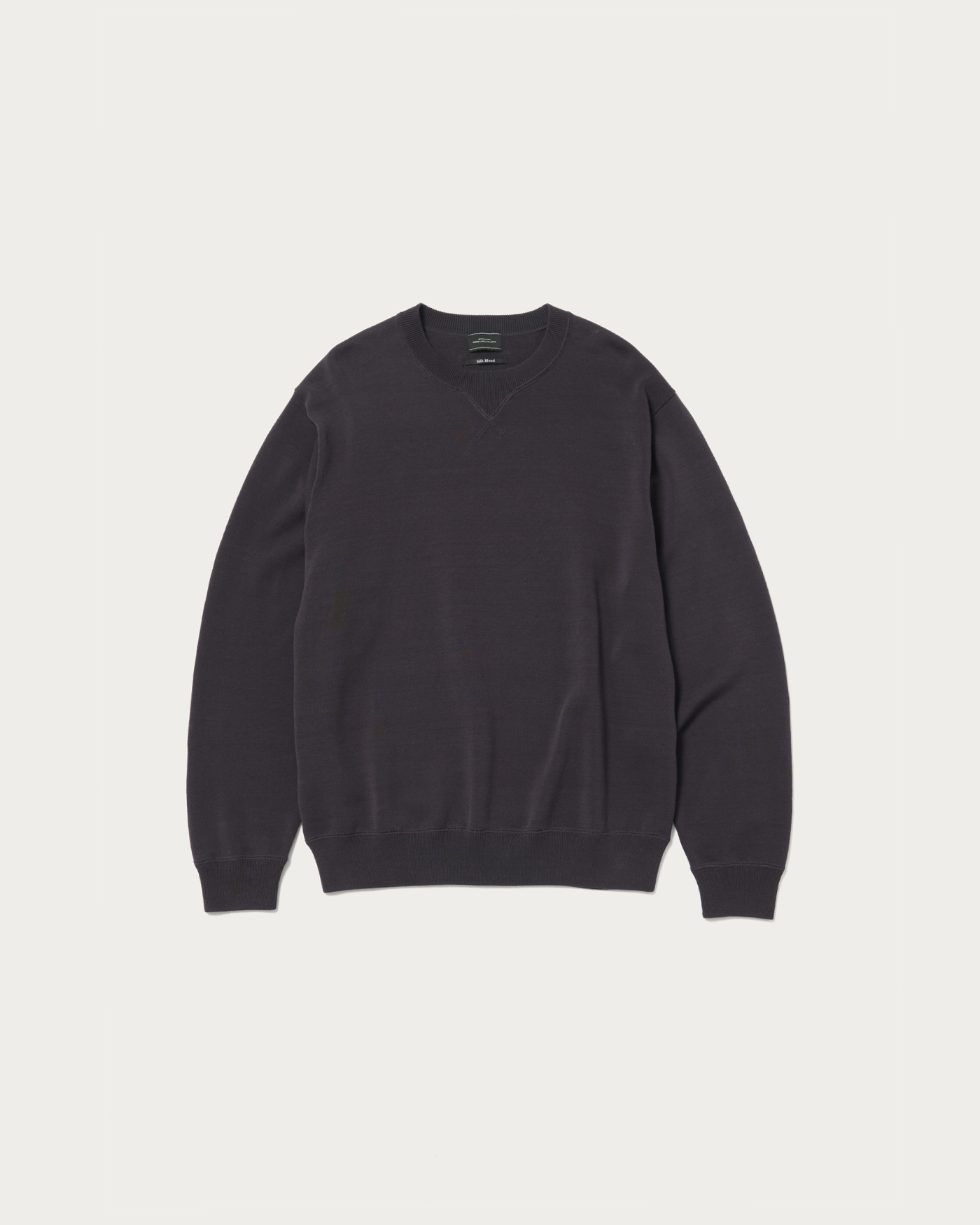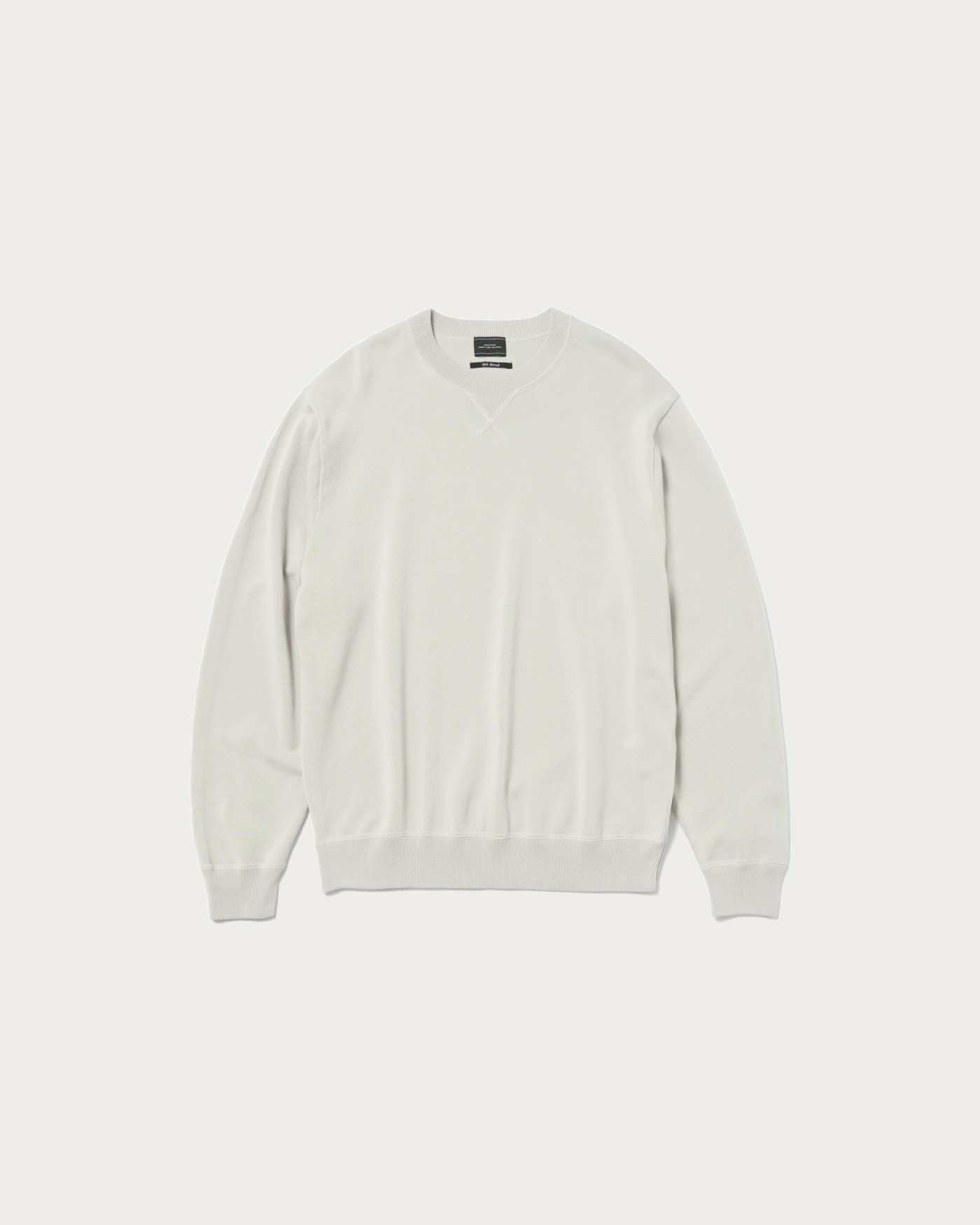The knit features a design that incorporates details typically used in cut-and-sew garments, such as a V-gusset at the neck and triple-needle stitching. The material is made from a blend of cotton and silk yarn, achieving an elegant texture that combines the softness of cotton with the luster and suppleness of silk.