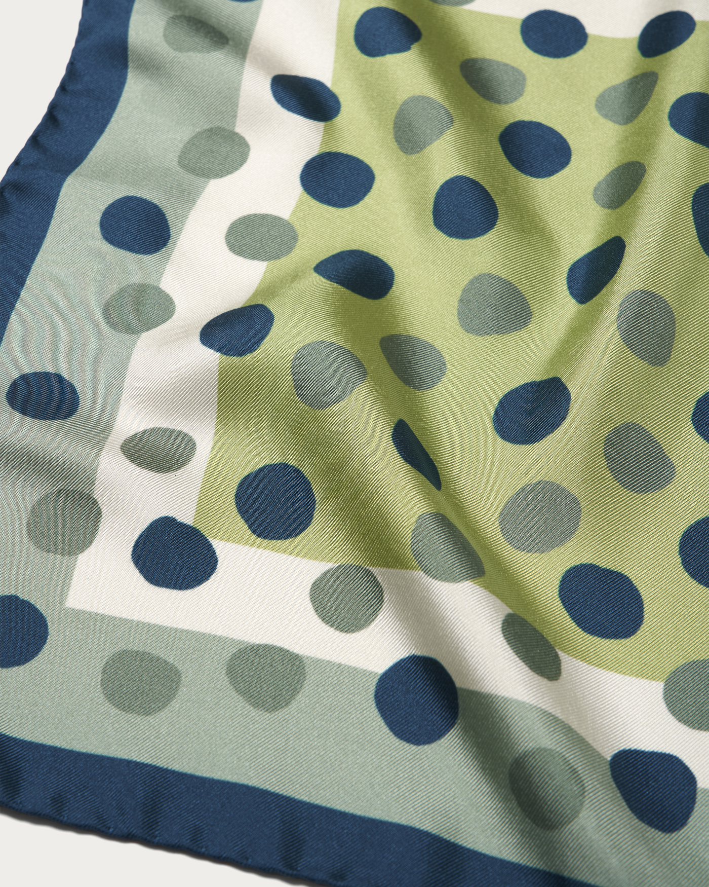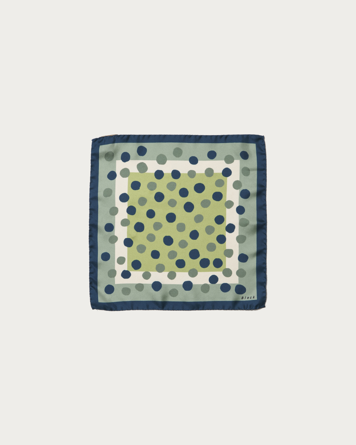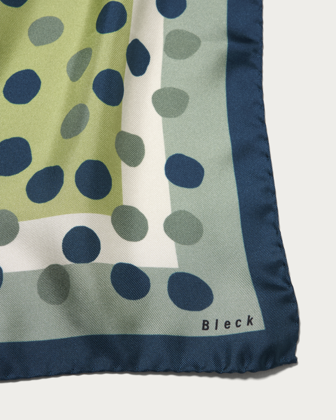 A pocket square made from 100% silk twill material by the Italian factory brand Bleck. The dot design features a modern color scheme that stands out against a backdrop of chic elegance, complemented by a high-quality sheen and supple texture. It's a piece that adds just the right touch of playful sophistication to your styling.