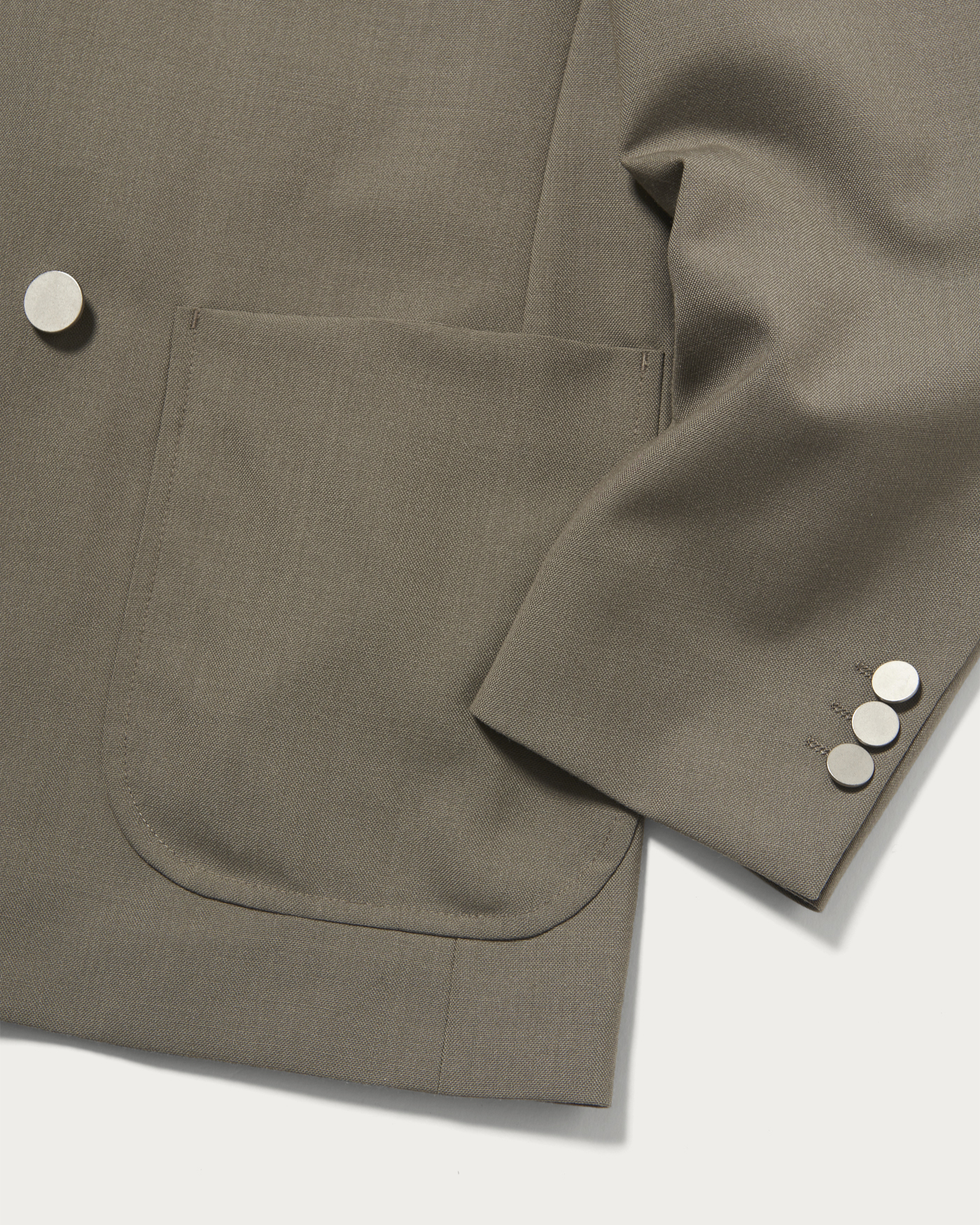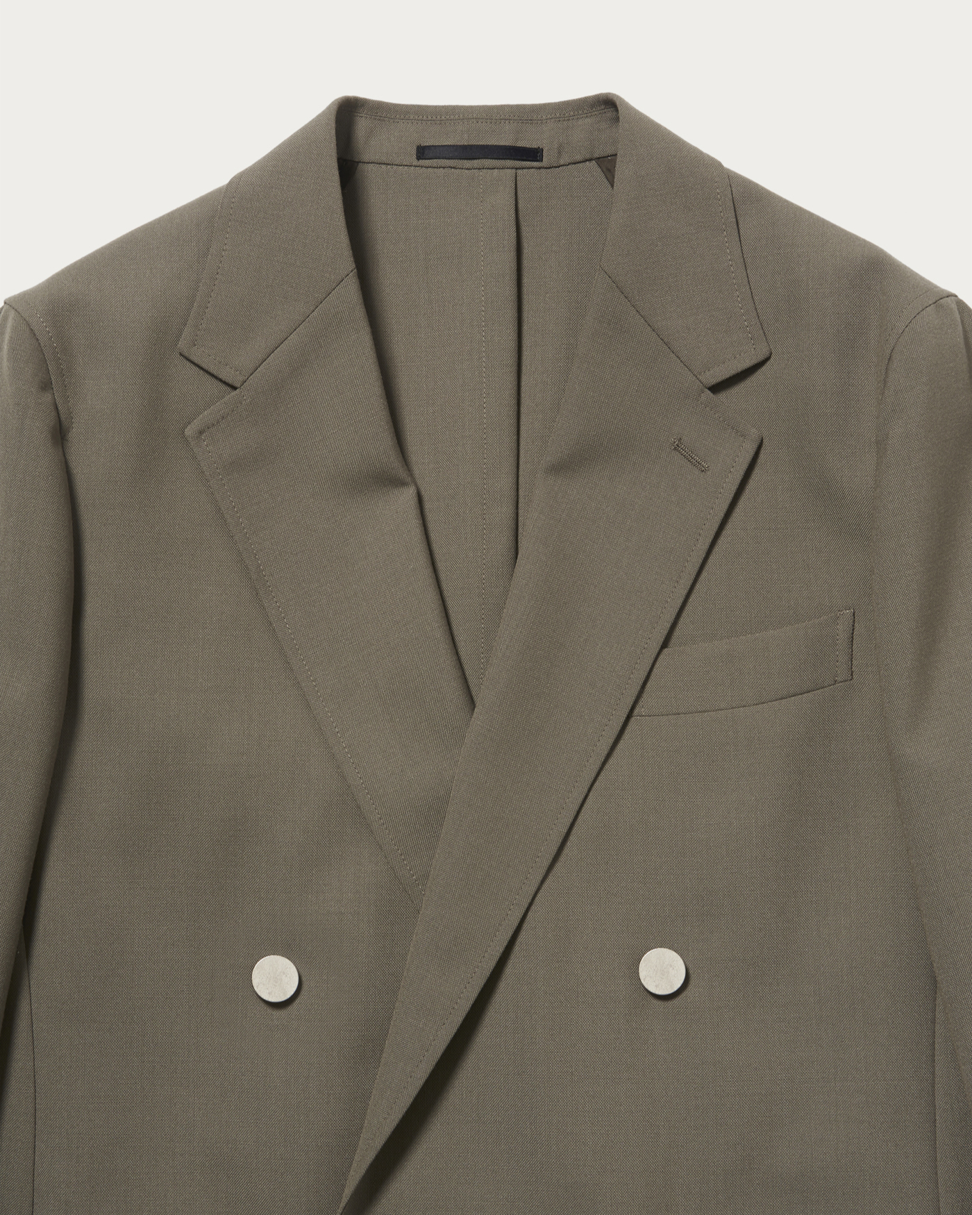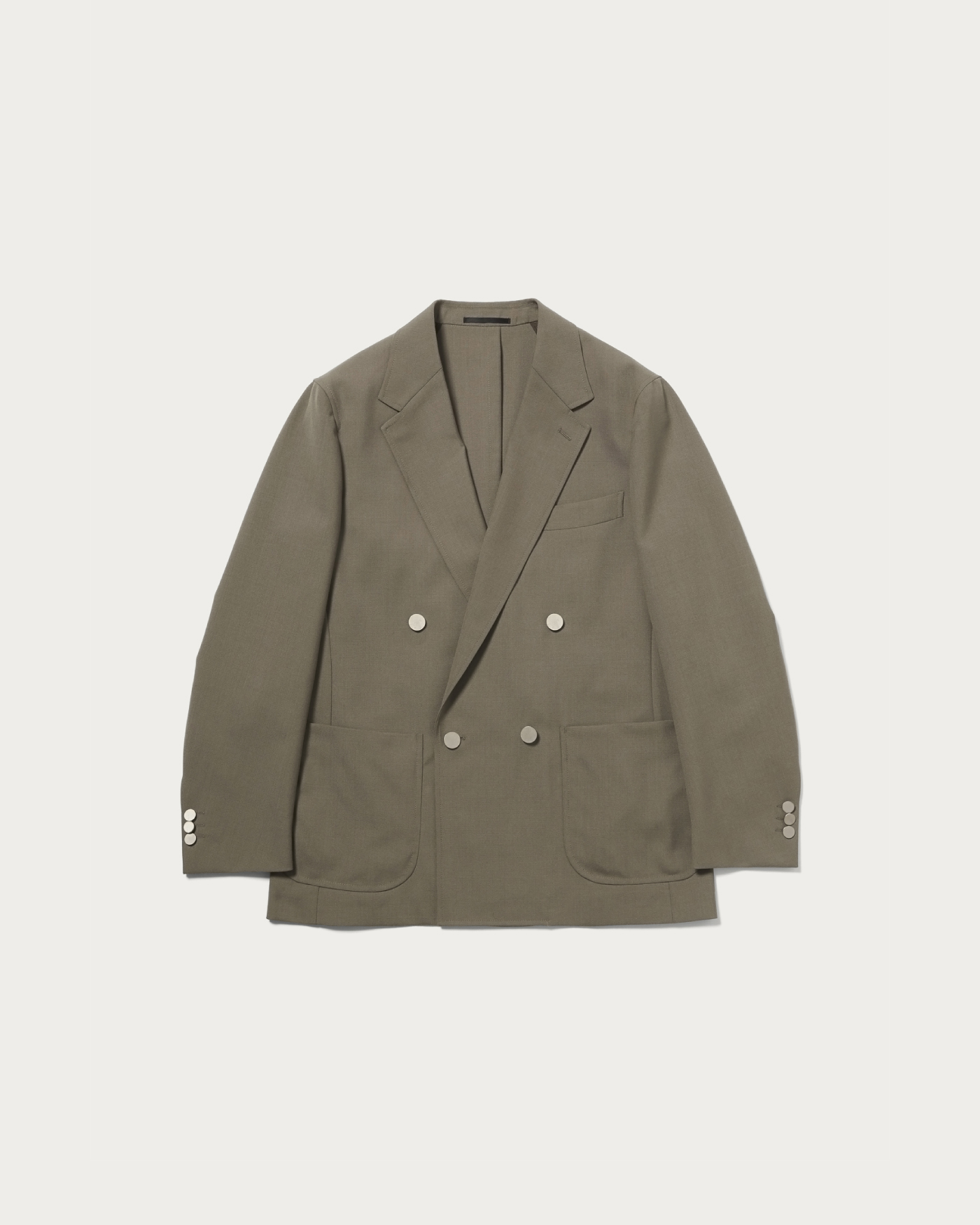 A double-breasted jacket with a relaxed silhouette and a four-button design. The cuffs feature three buttons, and the side vents add a lively touch. In addition to the half-lined construction, it includes two patch pockets and flat silver buttons, achieving a perfectly relaxed balance. The material is a polyester and wool blend fabric. The standout texture from the thick yarn gives it a vintage-like appearance, making it an attractive piece.