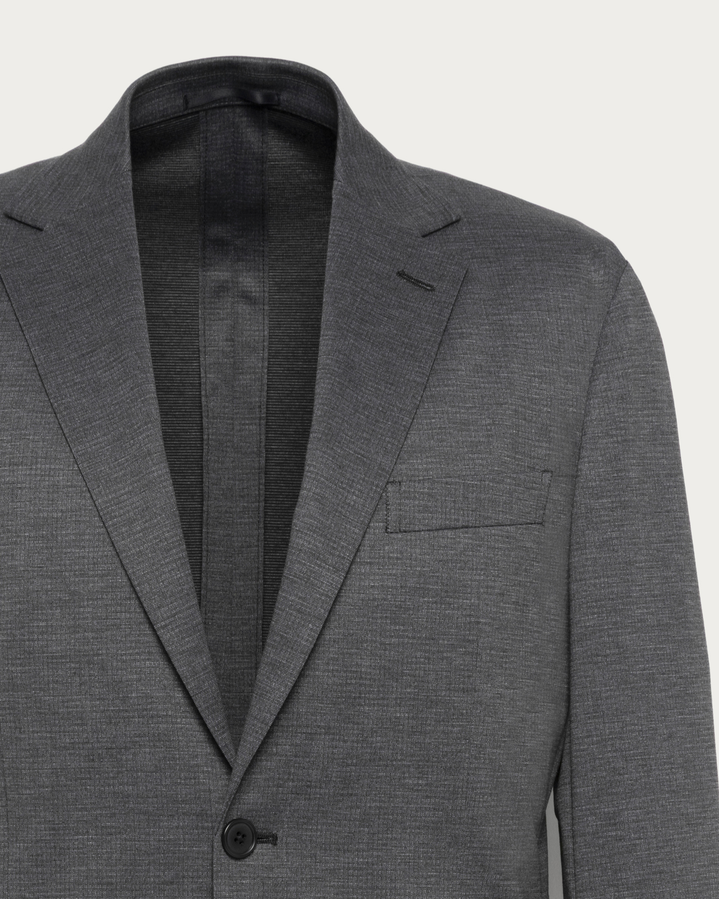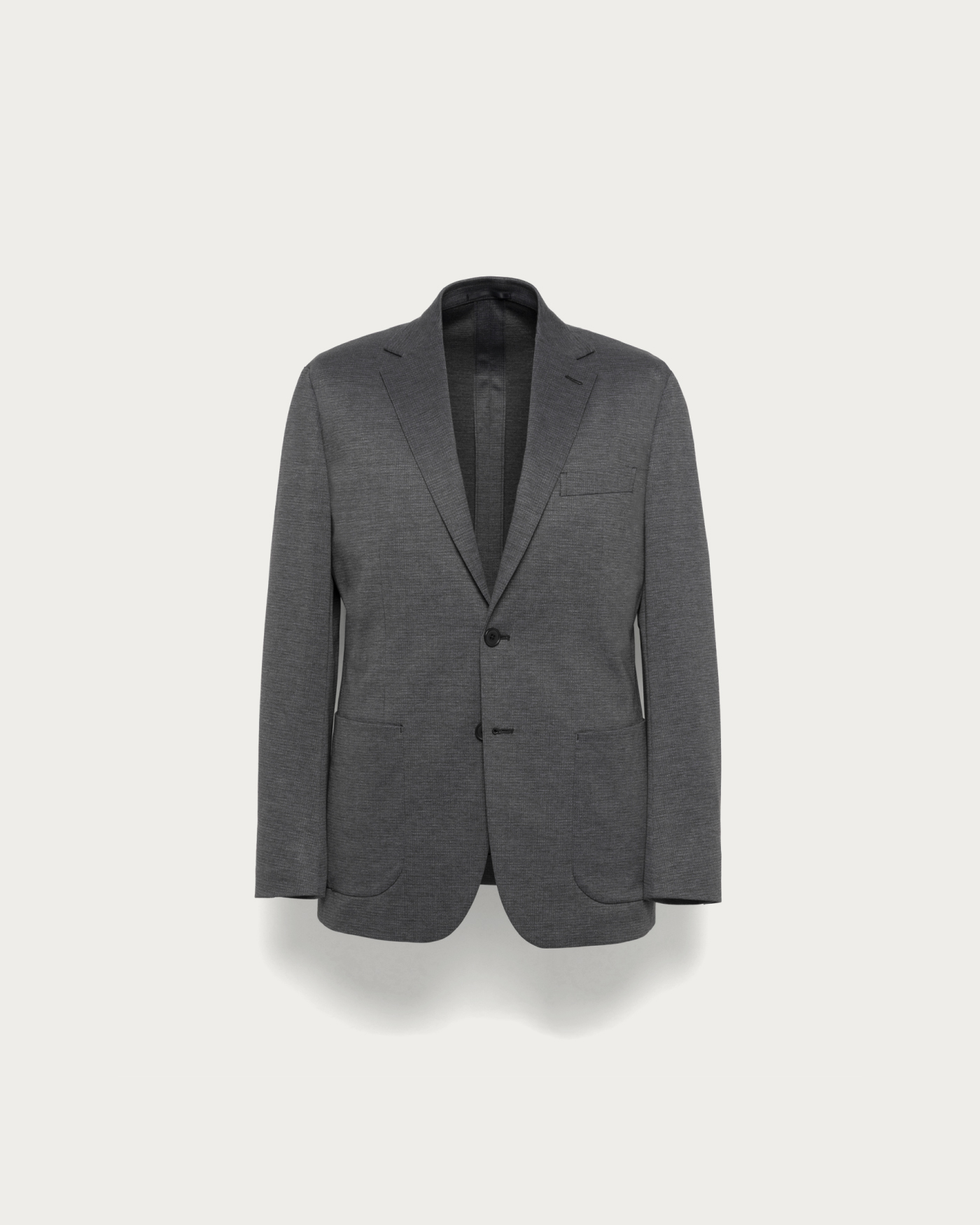 A jacket made from ponte fabric, perfect for the spring and summer seasons, featuring a finely crafted pattern print. Although it's jersey, it has the elegant appearance of woven fabric. With the balanced design typical of A+ (A-Plus) STANDARD models, it features patch pockets that make it easy to wear as a standalone piece.