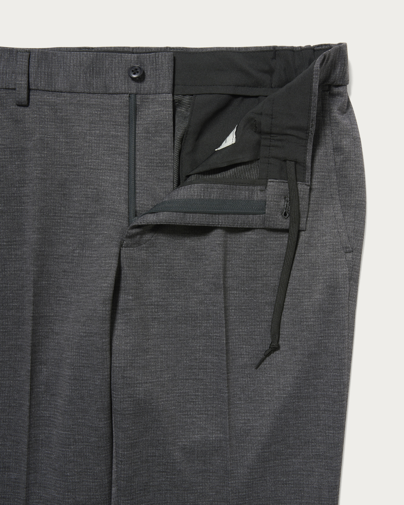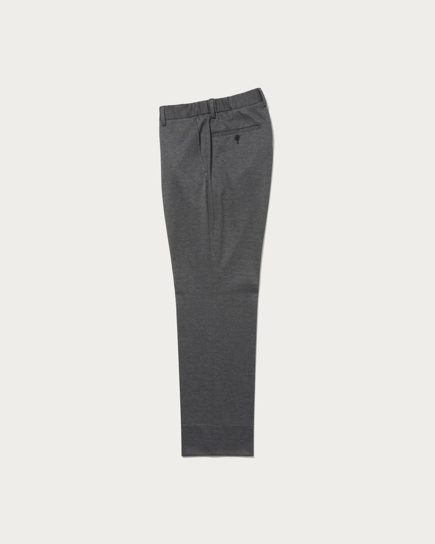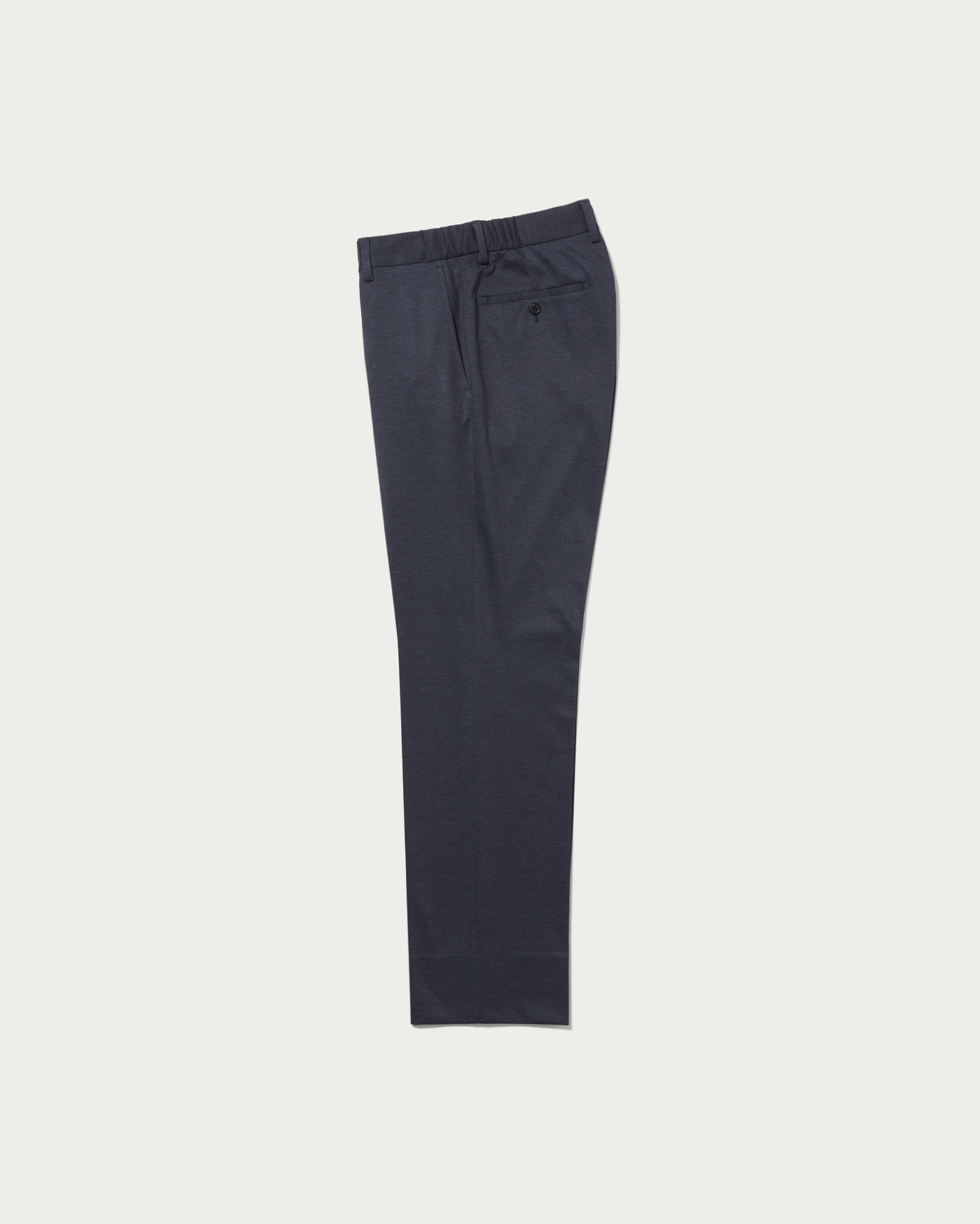 Easy slacks made from ponte fabric, perfect for the spring and summer seasons, featuring a finely crafted pattern print. Although made from jersey, they have the elegant appearance of woven fabric. The waist is designed with elastic shirring and equipped with a drawstring, providing a relaxed and comfortable fit.