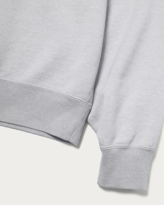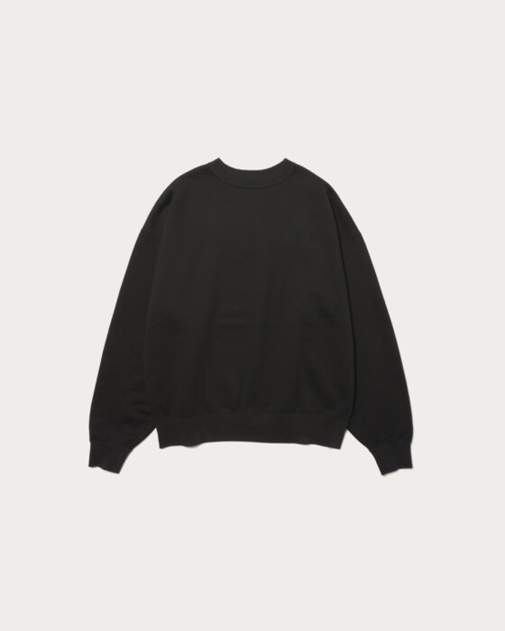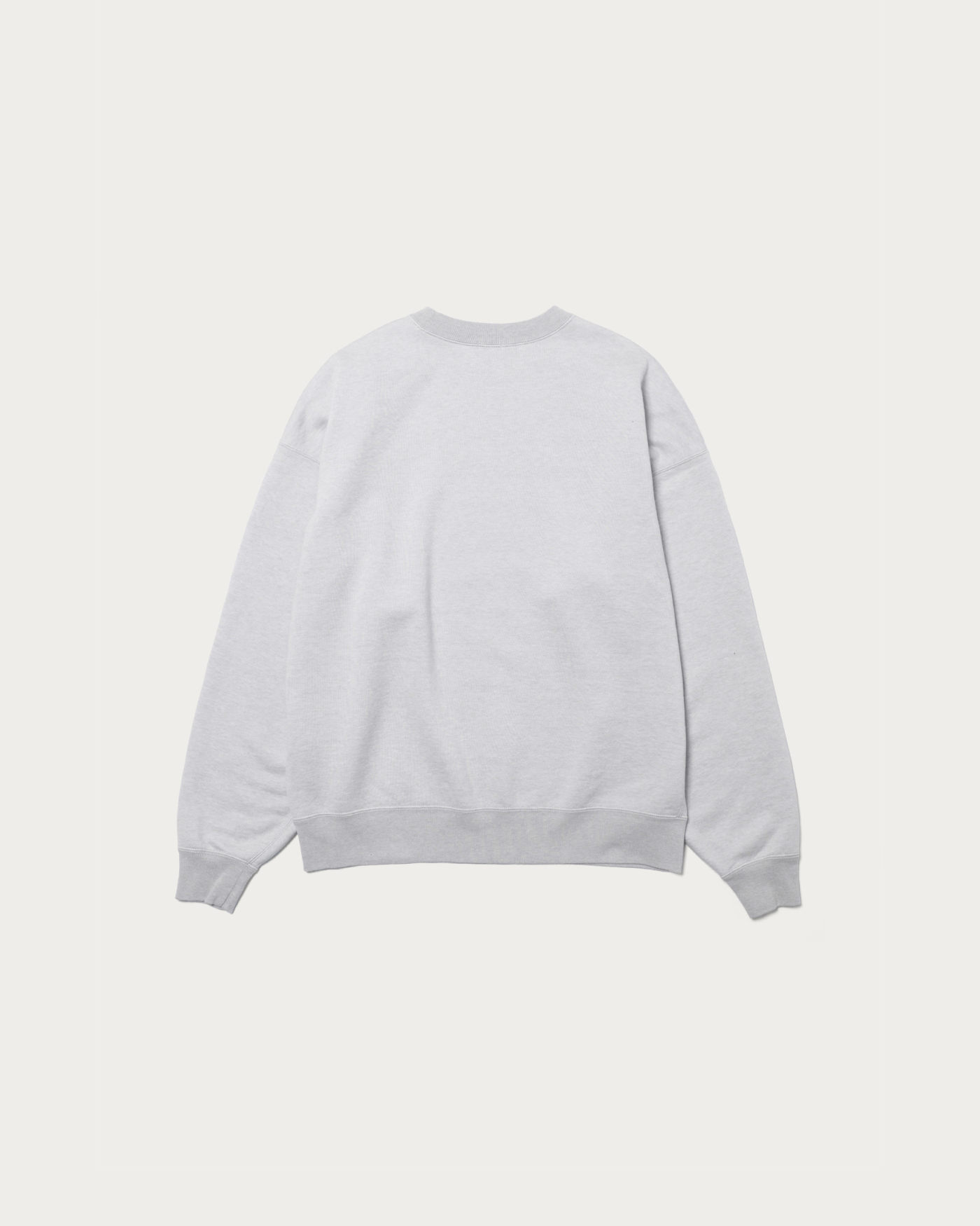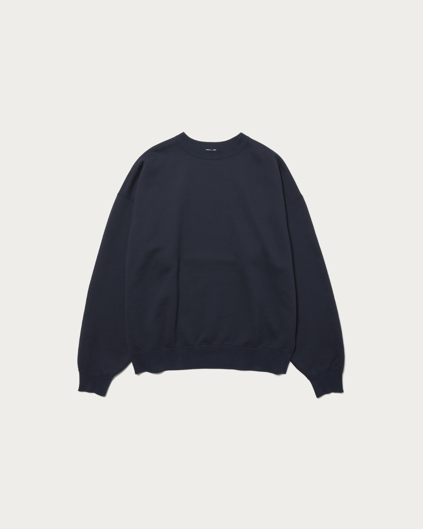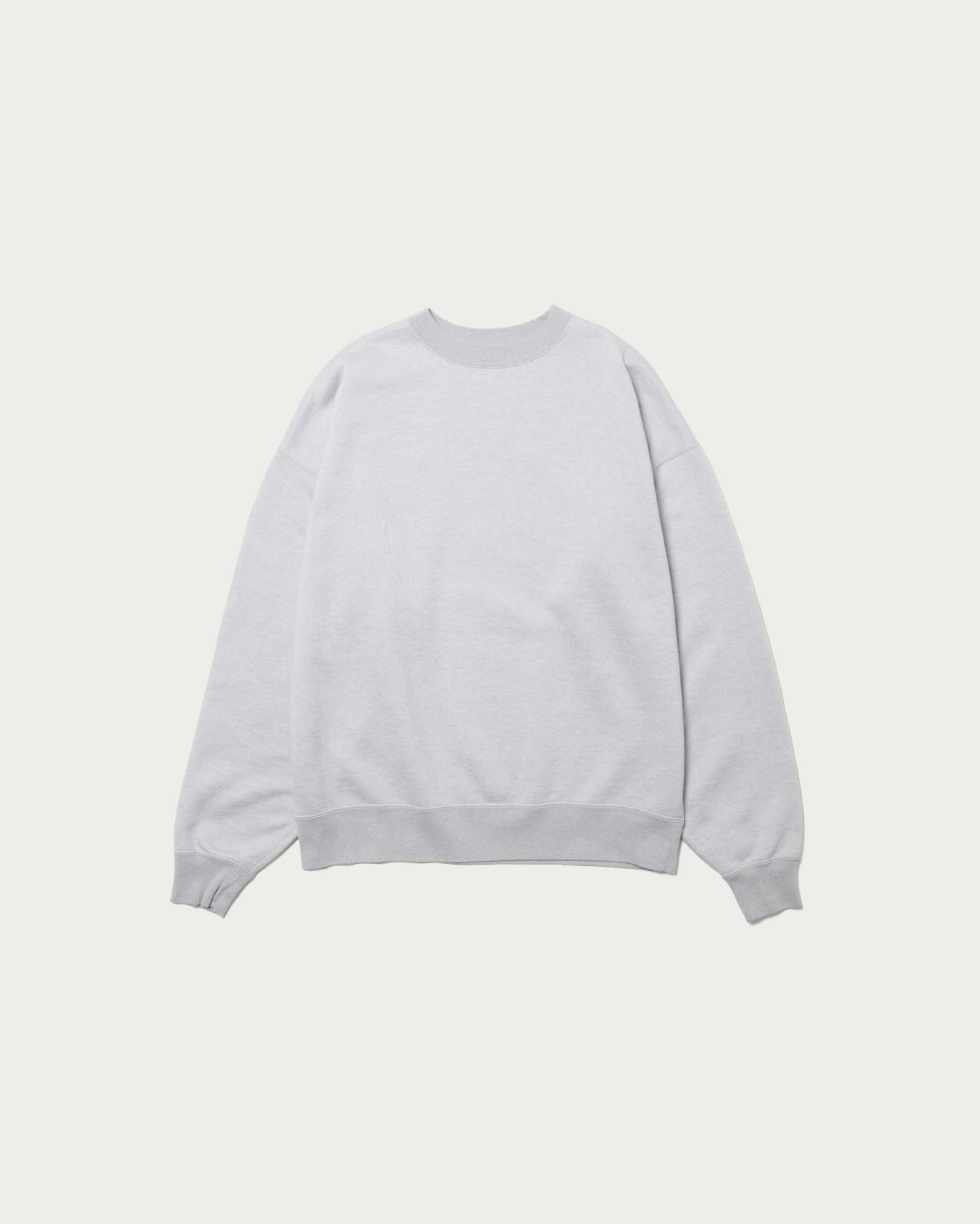 This is a crew neck sweatshirt designed with the concept of "high-quality sweatshirts you can wear every day." It features a relaxed wide silhouette with distinctive drop shoulders. The outer yarn is made from high-quality No. 59 double-twisted yarn. By using compact spinning, the yarn has minimal fuzziness and is loosely twisted to create a smooth texture, showcasing a highly refined special yarn. Although an ordinary item, it is a versatile piece that leads to a sophisticated adult style.