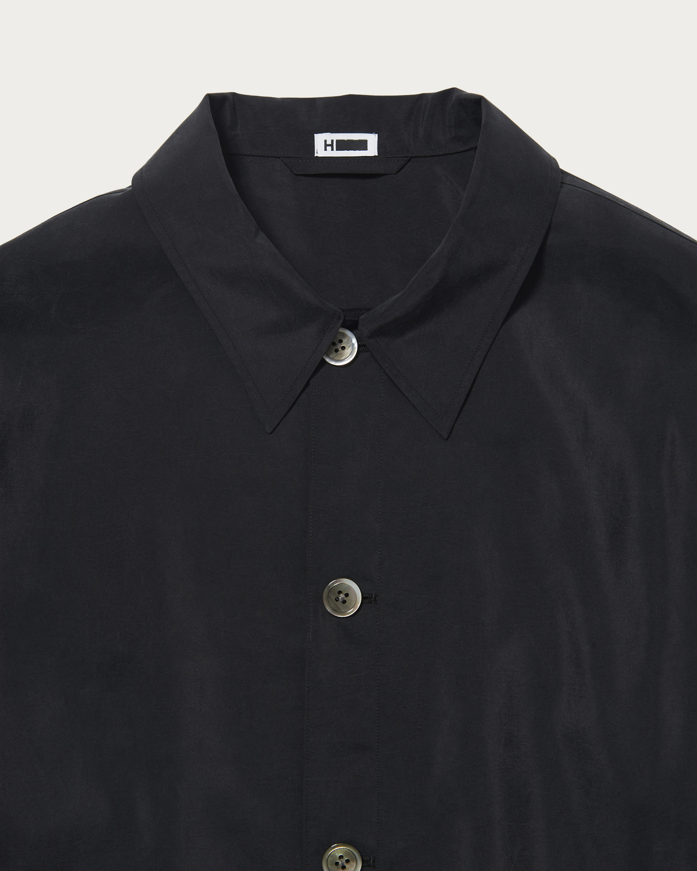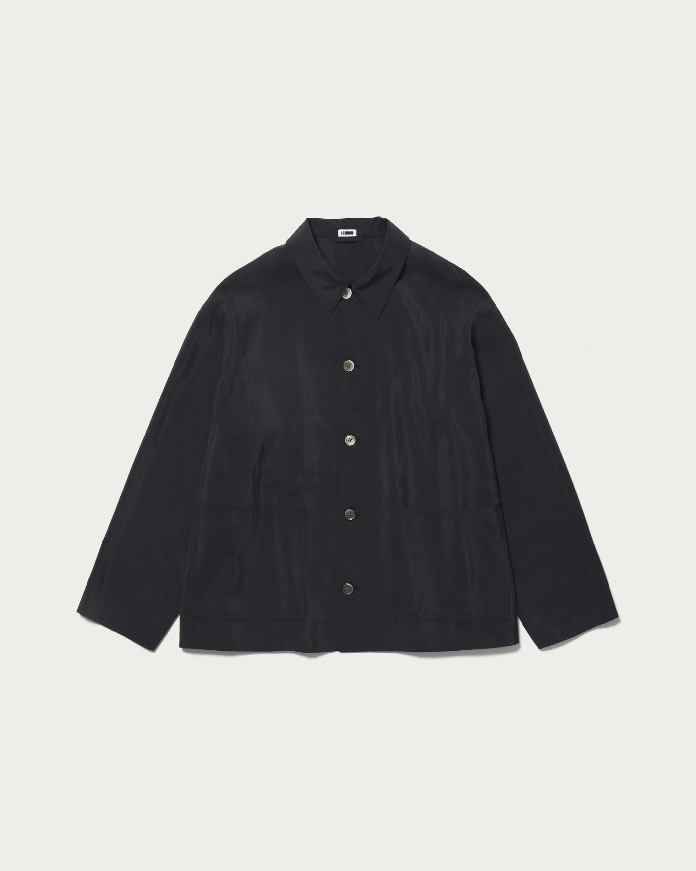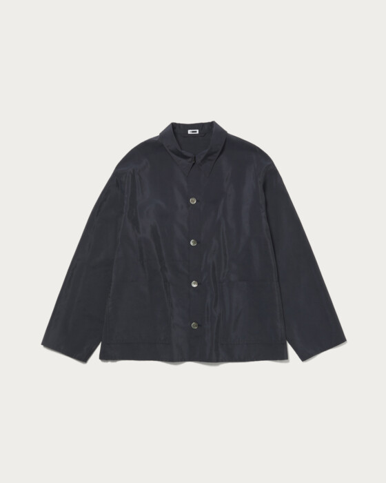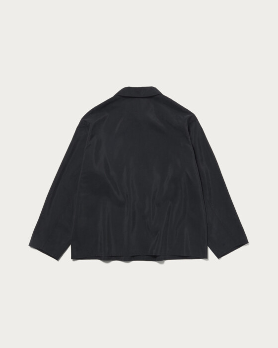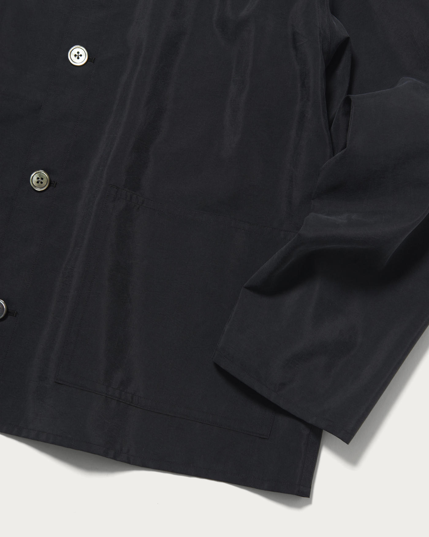 This is a moderately short-length coverall. It features prominently shaped patch pockets. It's a very lightweight outerwear piece that can be worn like a shirt, using horn buttons. The fabric is a high-density taffeta woven by interlacing silk filaments and nylon. A special finishing process has been applied to fibrillate the silk, reducing its gloss and giving it a vintage, worn-in look. The fabric is designed to be casually worn with ease, even by men.