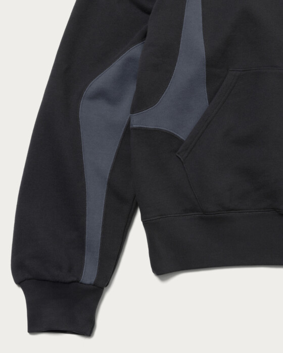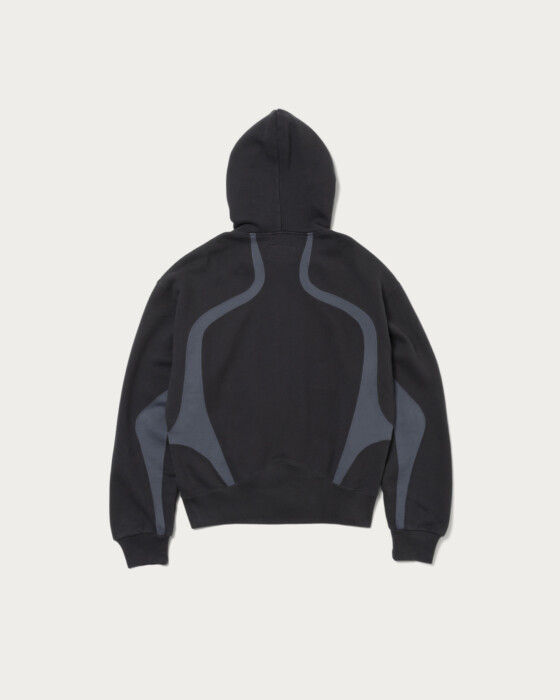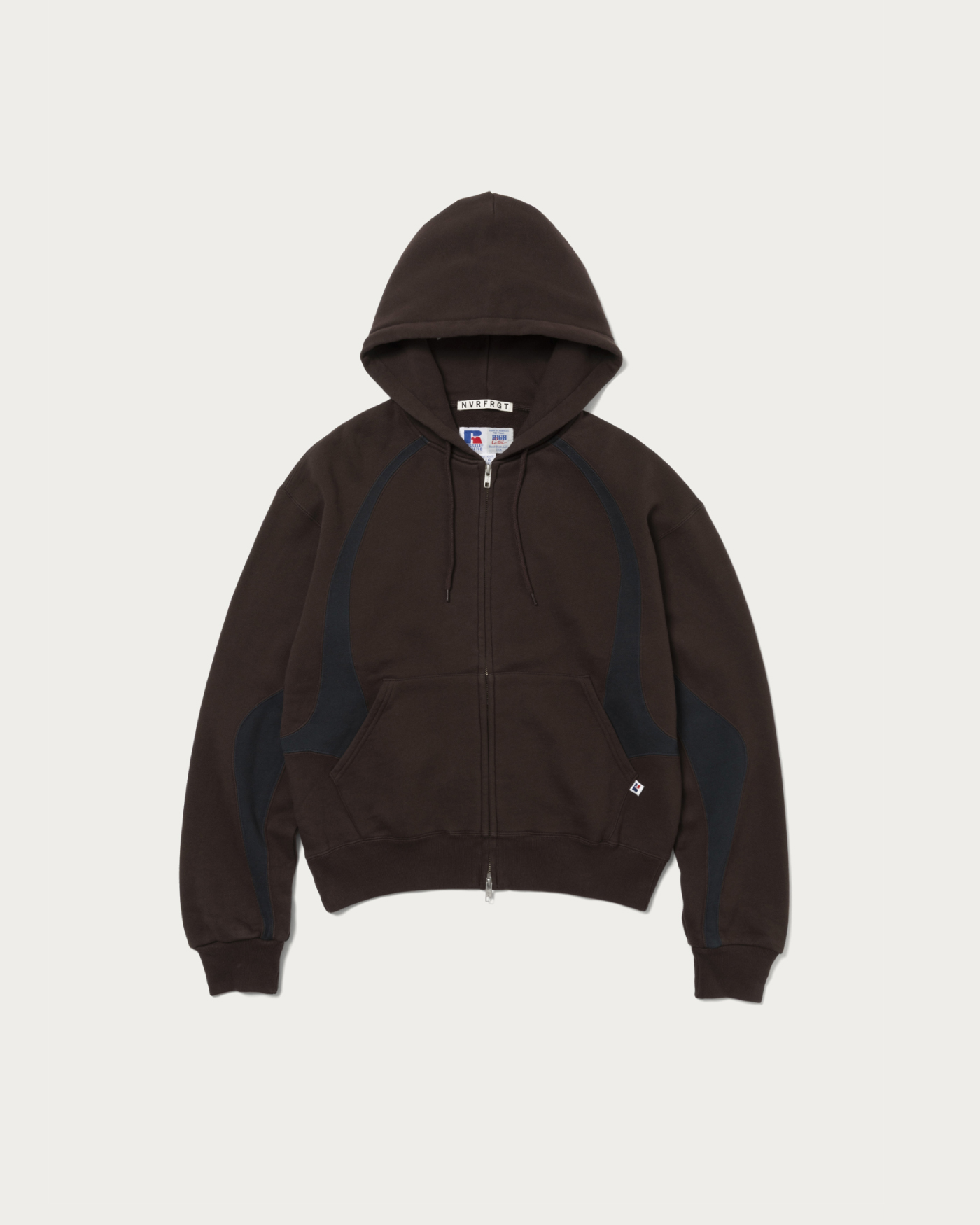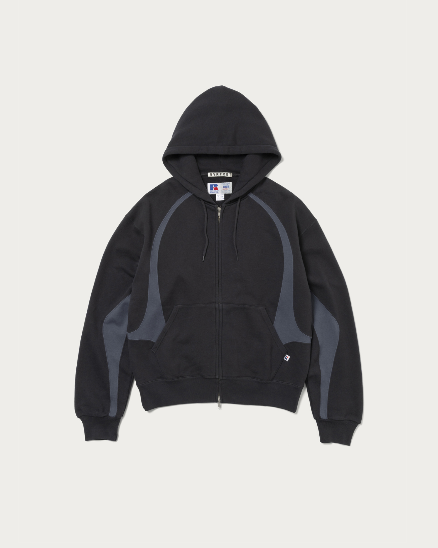 A luxurious triple-name collaboration between NVRFRGT and RUSSELL ATHLETIC. This piece reimagines the highly popular 1990s-2000s RUSSELL ATHLETIC zip hoodie, beloved in the vintage market, by adding NVRFRGT's signature pattern work and cutting techniques. The slightly shorter box silhouette body is reconstructed into a modern piece, highlighted by a two-tone color panel design.