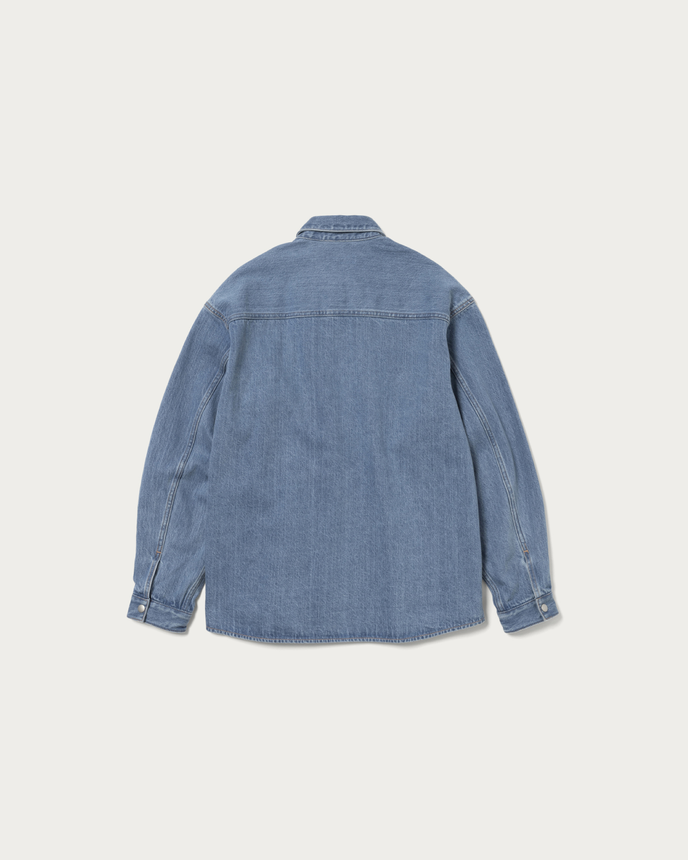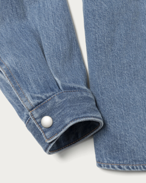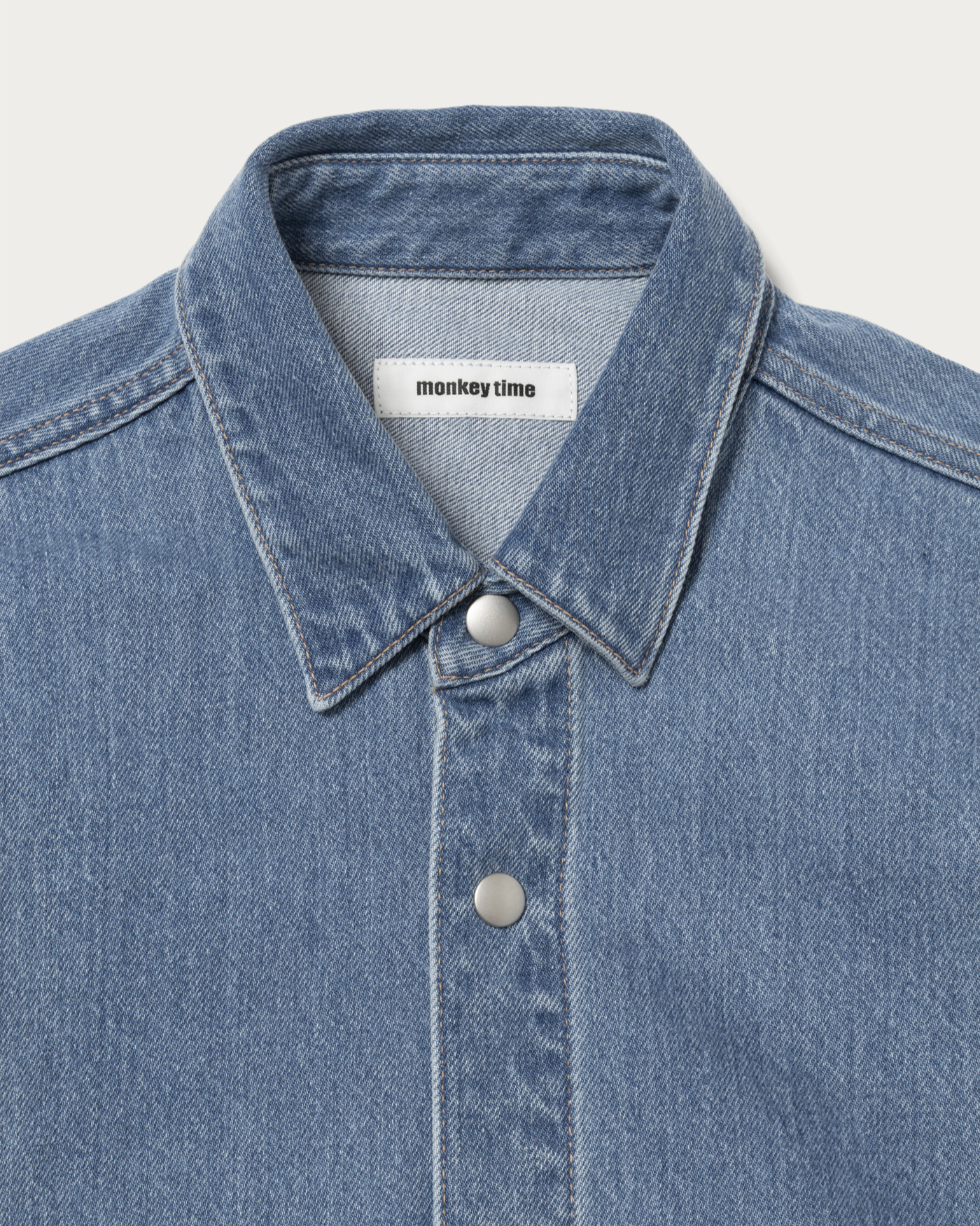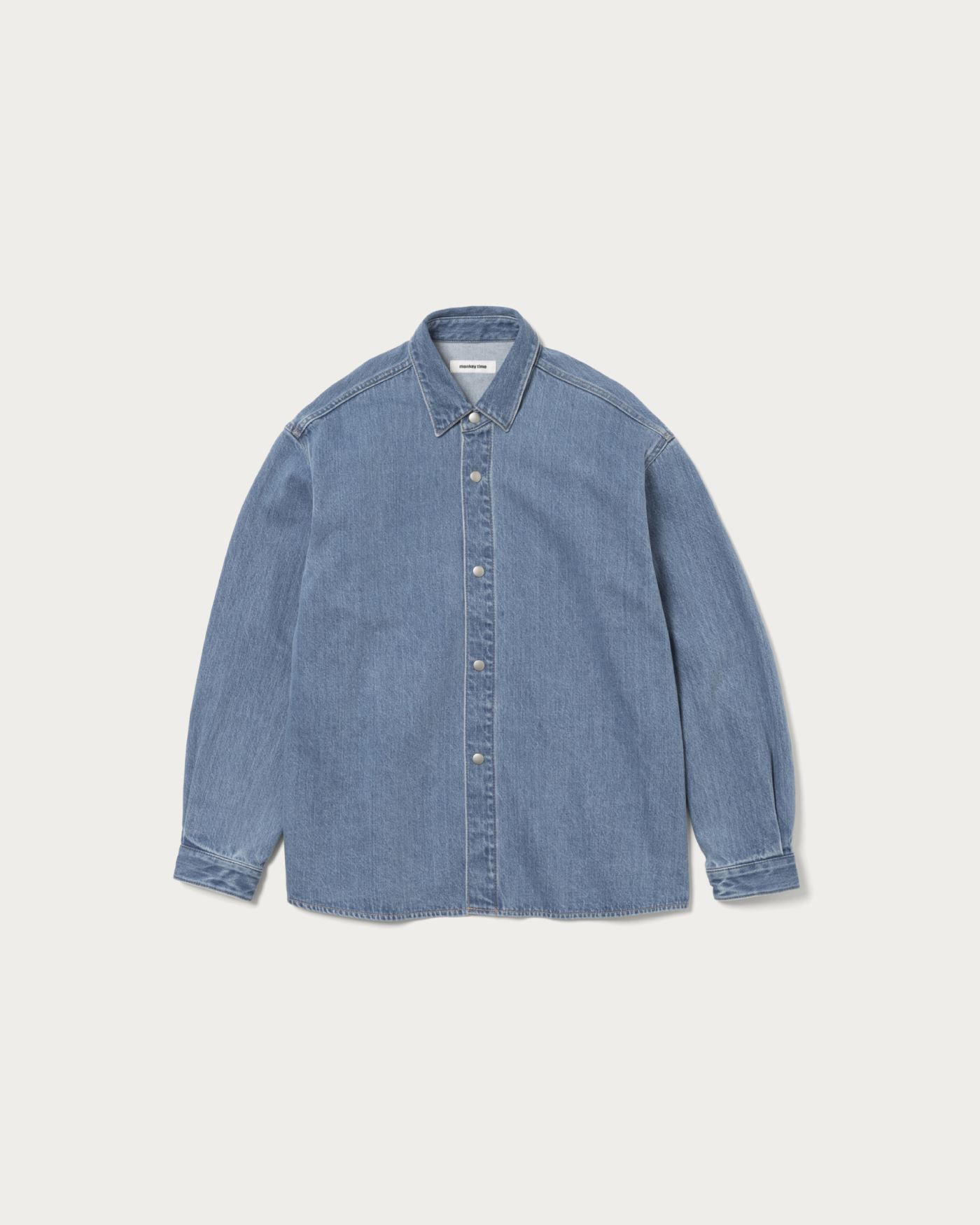 A CPO shirt made from washed denim. It features silver-colored snap buttons, giving it a clean look that isn't overly American casual.
