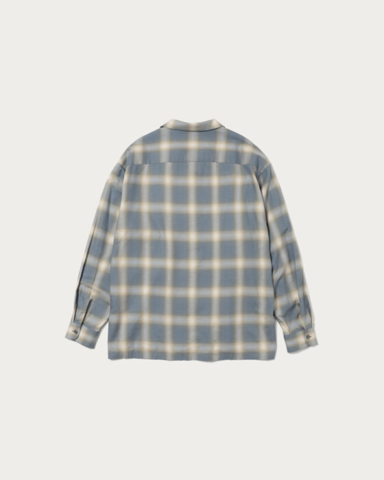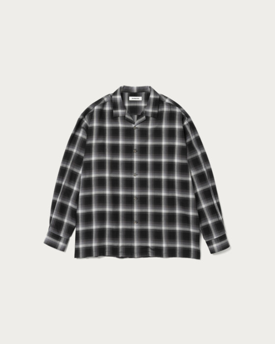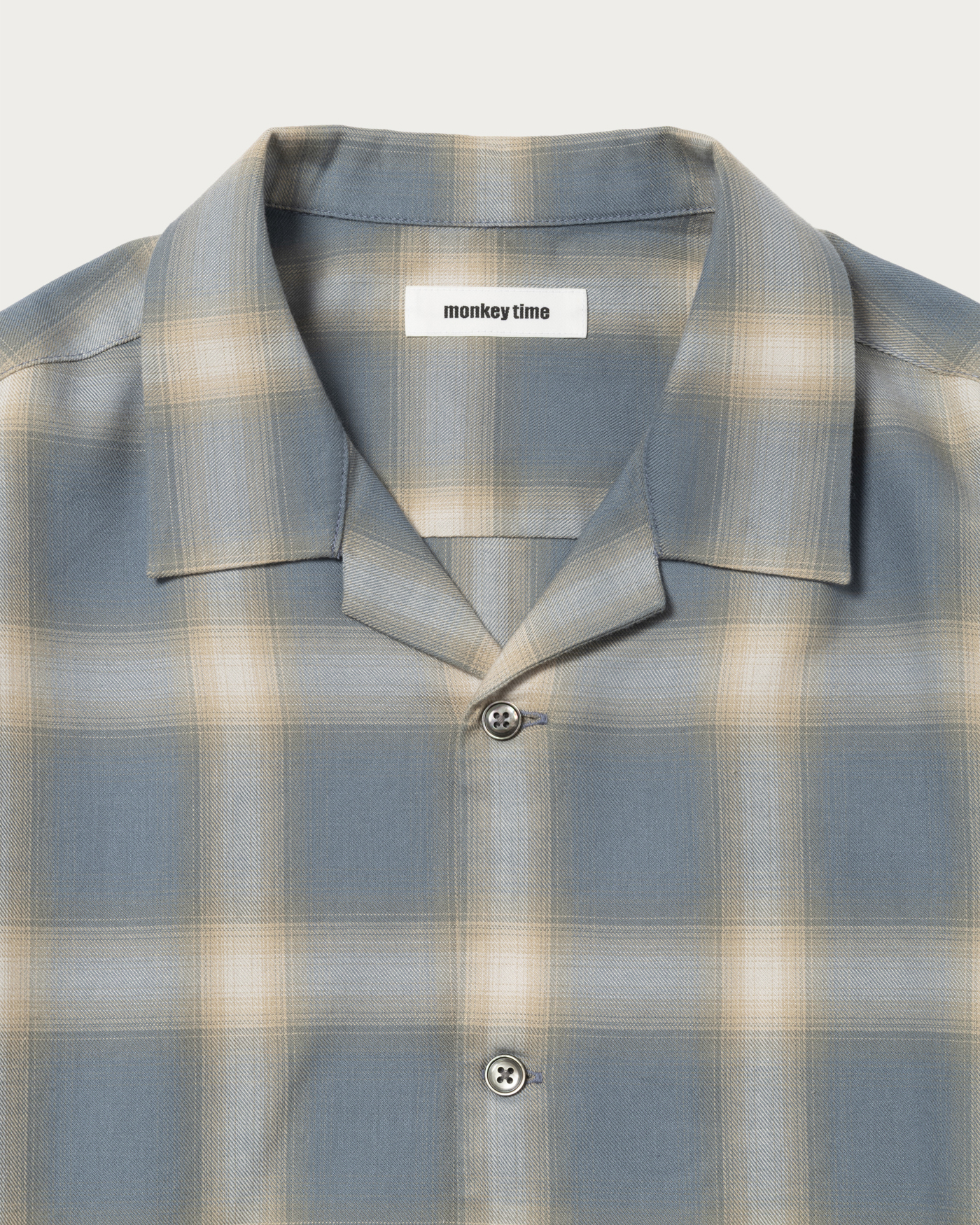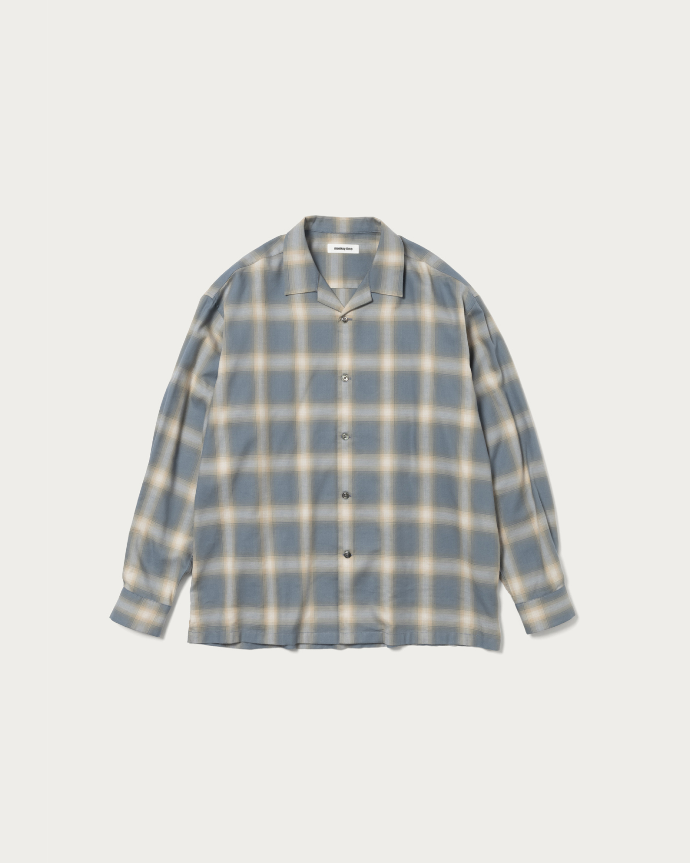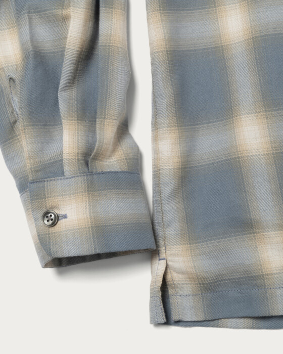 An open-collar shirt made from a substantial cotton/rayon ombre check fabric that is versatile enough to be worn as an inner layer or as a spring jacket. It has a low sheen and the drape of rayon, combined with the reassuring feel of cotton, making it a great piece to wear in all seasons except summer.