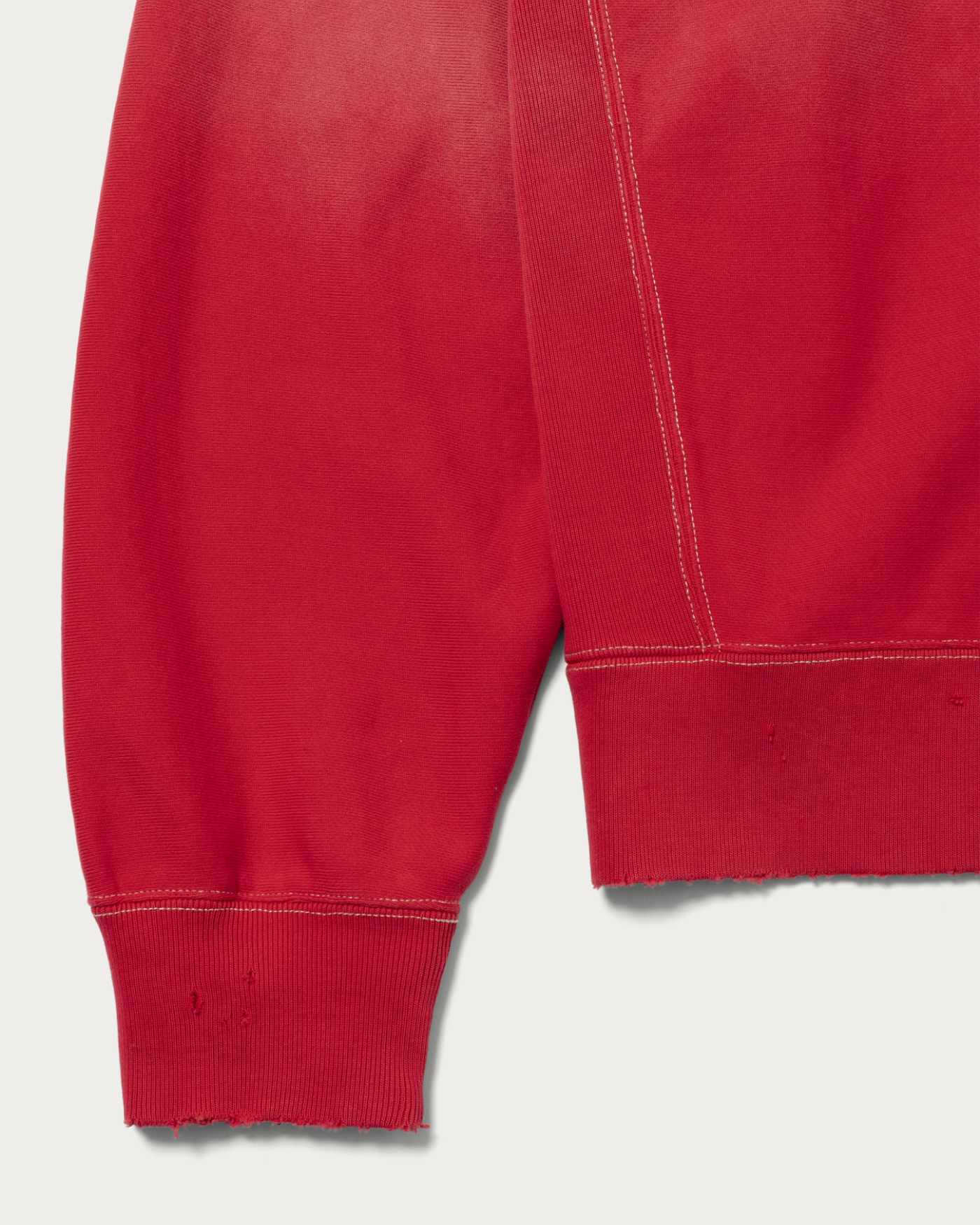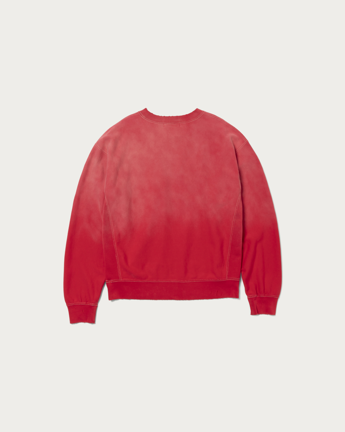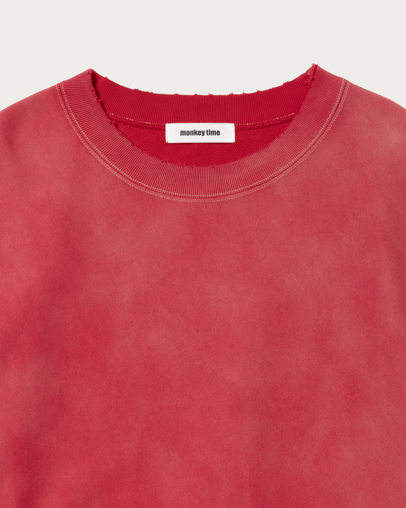A sweat crew neck made from a sturdy, thick fabric that is perfect for three seasons other than summer. It features distinctive fading from damage processing and sunburn processing throughout. With a relaxed fit, it's a standout piece even when worn alone during the season.