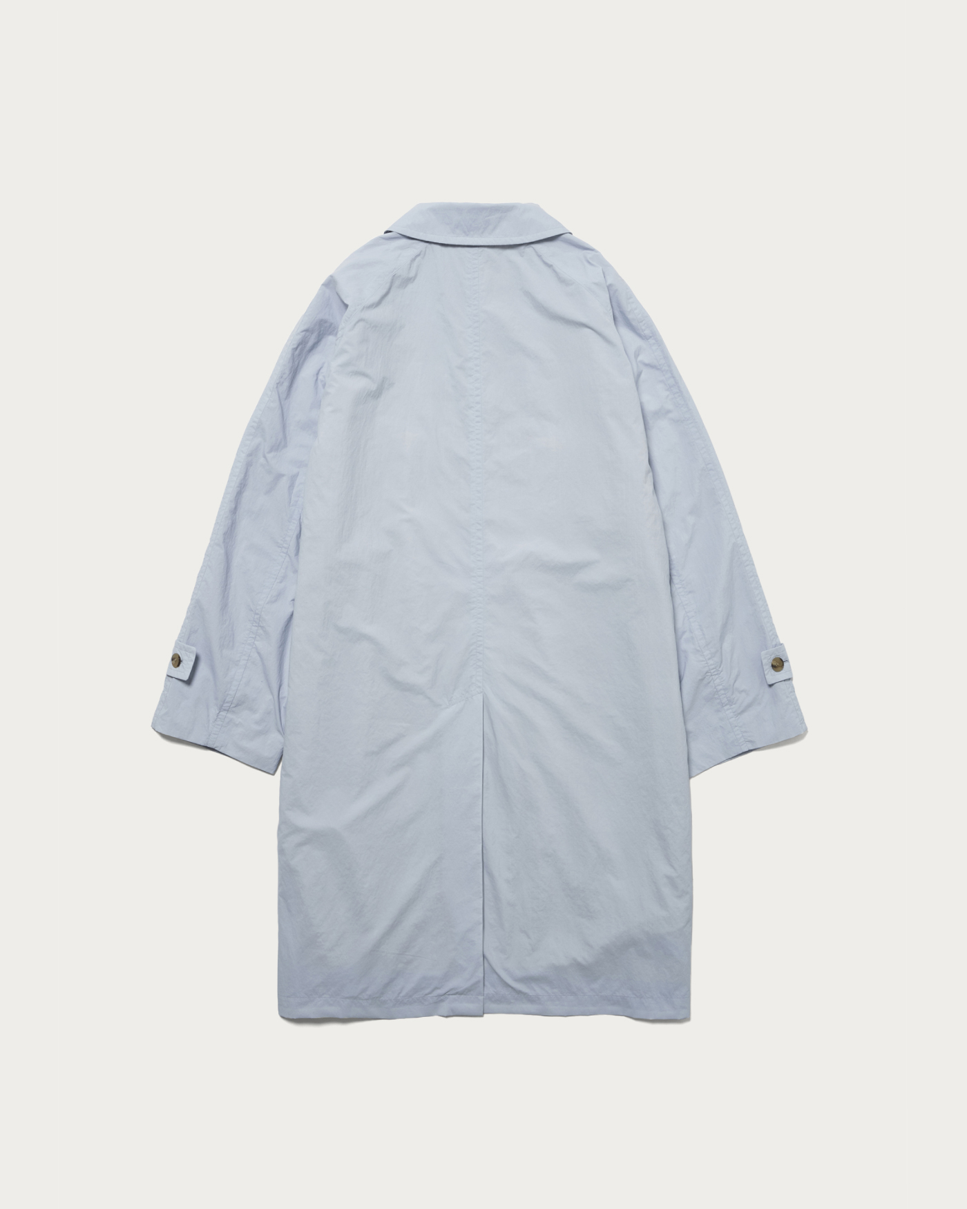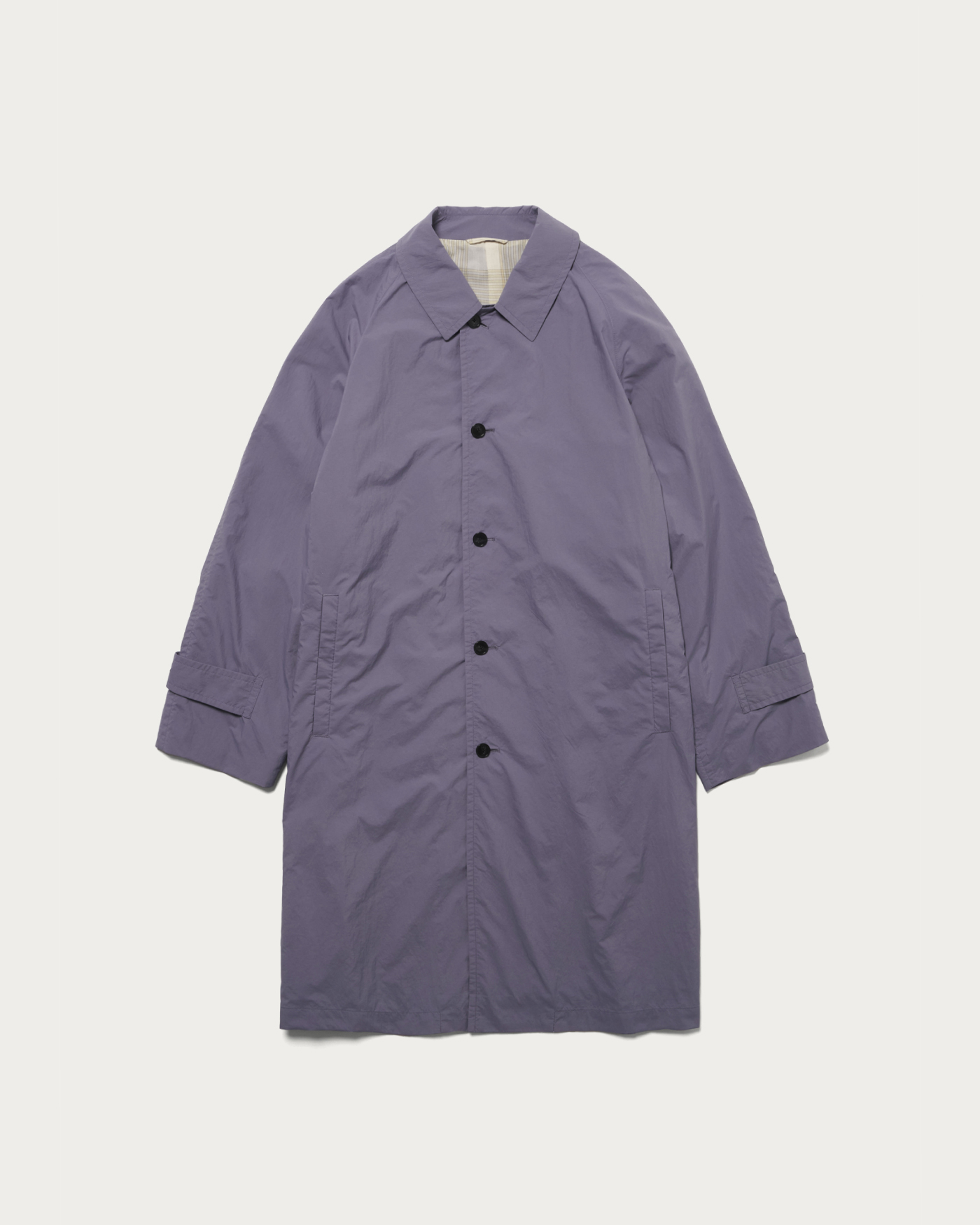 A coat made from nylon taffeta treated with Komatsu Matere's outstanding water-repellent finish. It features a matte and natural appearance, utilizing a lightweight nylon material that resembles natural fibers. The coat encapsulates the inherent charm of the material, with surface crinkles and a catchy colored lining. It is a piece that harmoniously combines functionality and design at a high level.