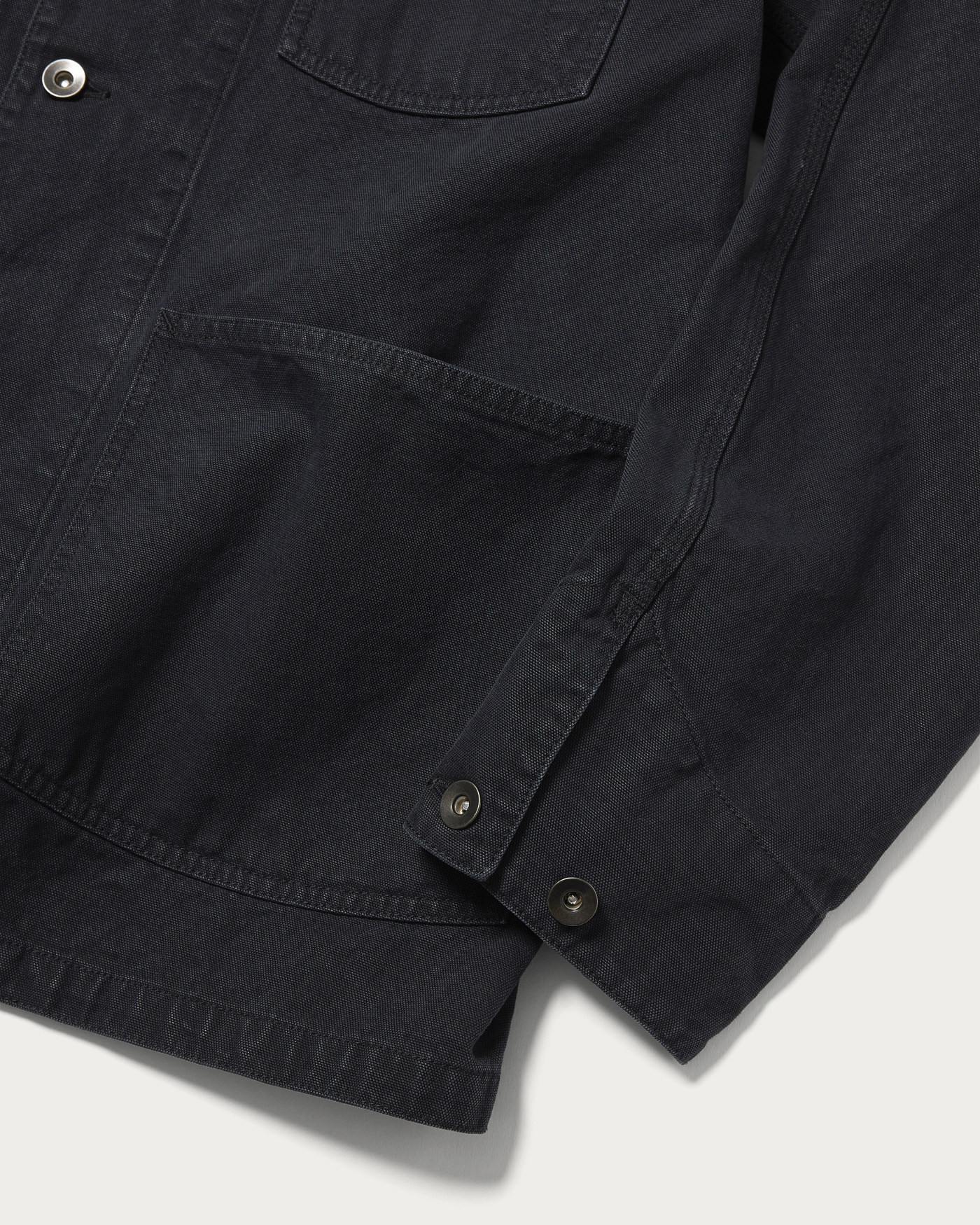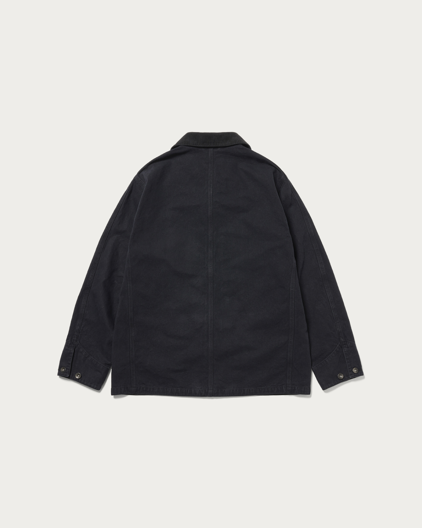A coverall inspired by American workwear. The corduroy collar is matched to the same color as the main fabric, creating a calm and composed impression. The original rugged feel is preserved through triple-needle stitching and the use of accessories, elevating it into a highly versatile piece. The outer fabric is made from duck material dyed with sulfur dye, which creates a nicely faded look after washing. It's an item that allows you to enjoy changes in appearance with repeated wear.