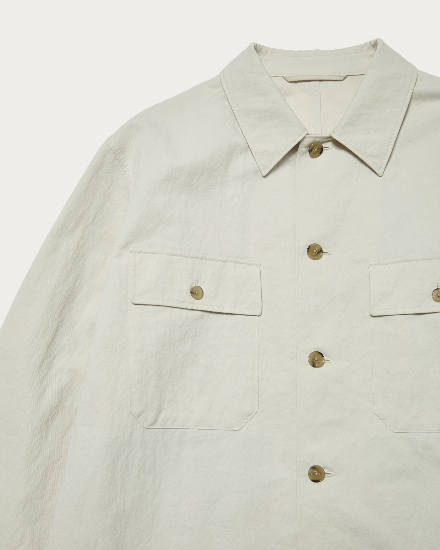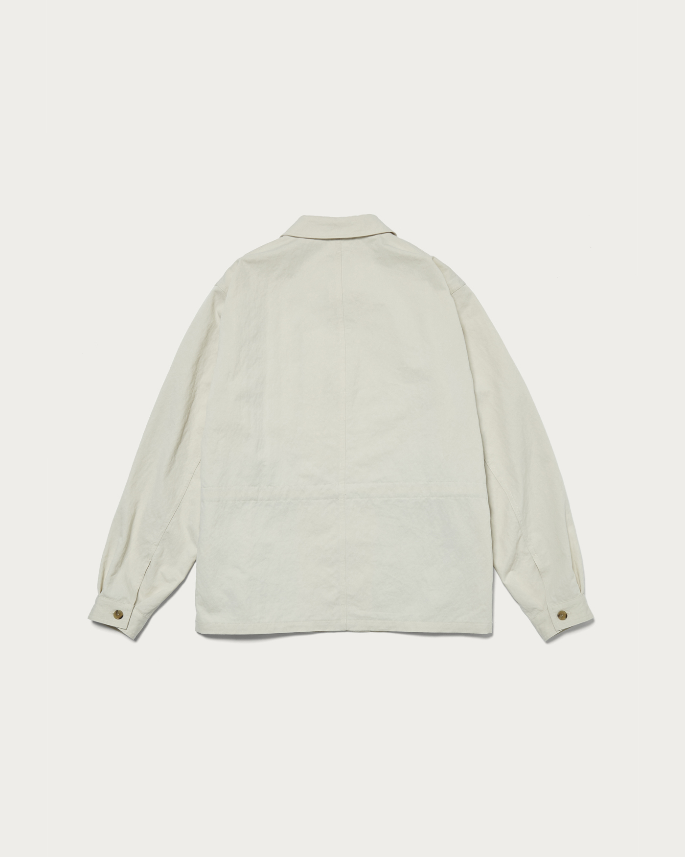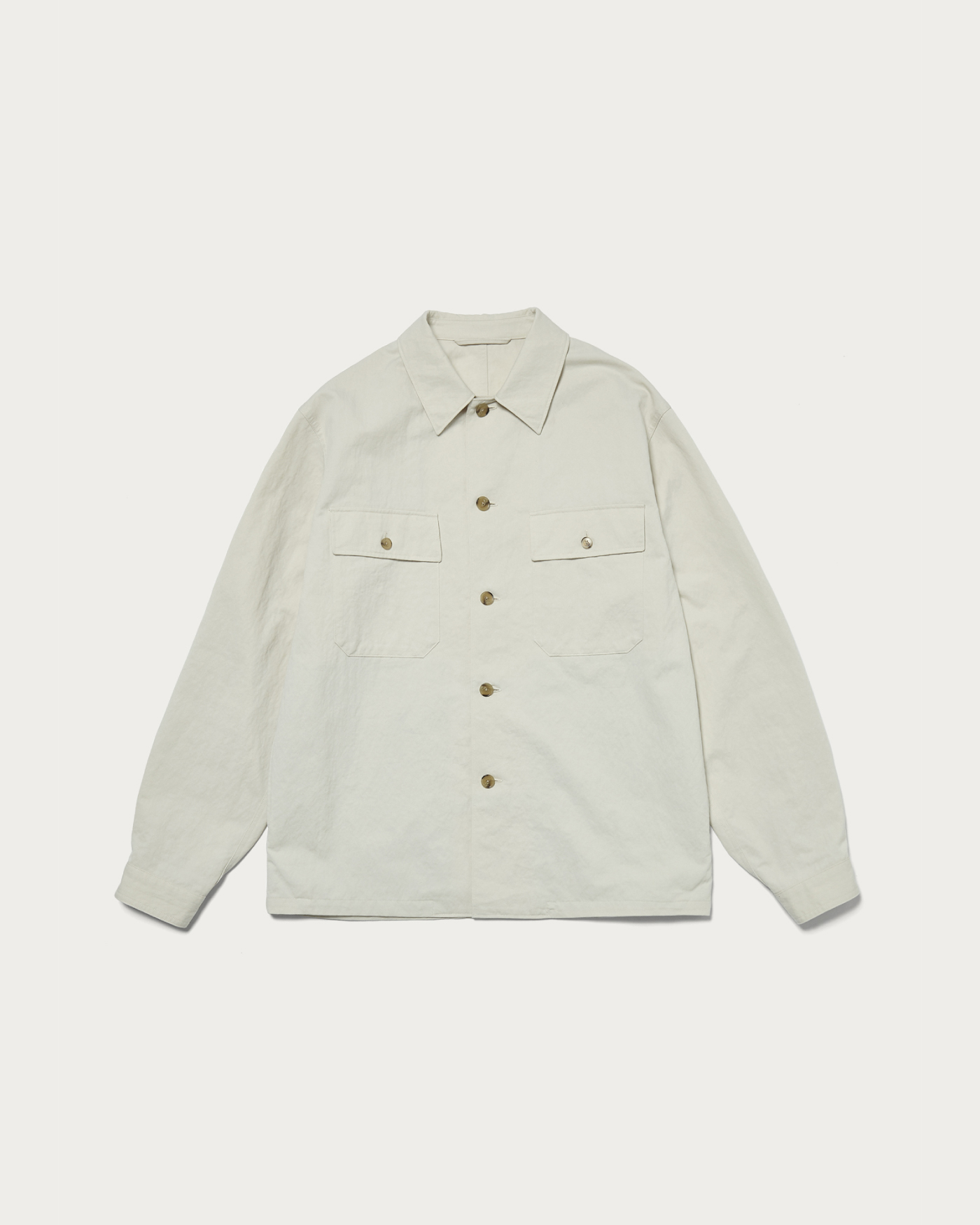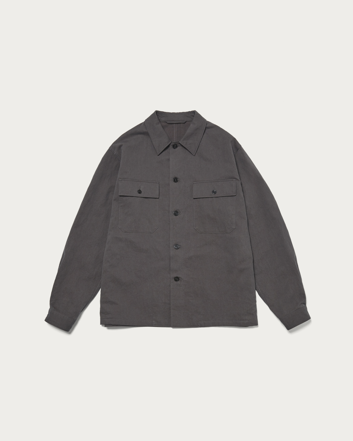 A CPO shirt with military origins, modernized with a contemporary balance. The large chest pockets serve as a design accent, and the addition of waist pockets utilizing the side seams elevates it to function as outerwear. The material used is a twill fabric that has been washed to create a textured, slightly brushed surface. In addition to its relaxed appearance, the blend of nylon provides unexpected lightness and a subtle sheen. The fabric's resilient characteristics give rise to a three-dimensional and rounded silhouette when worn.