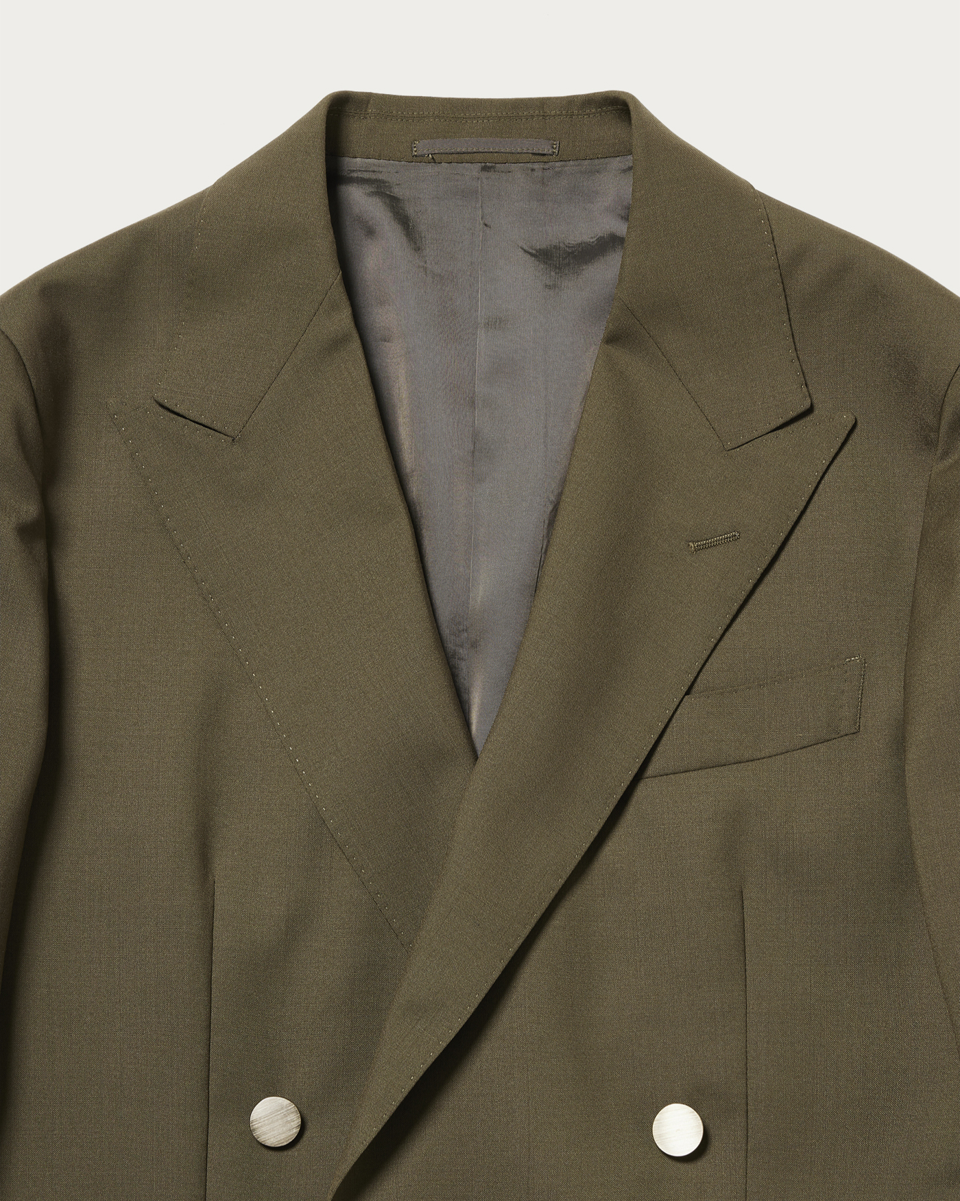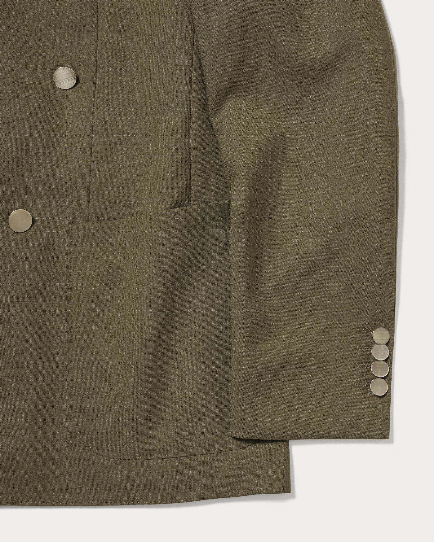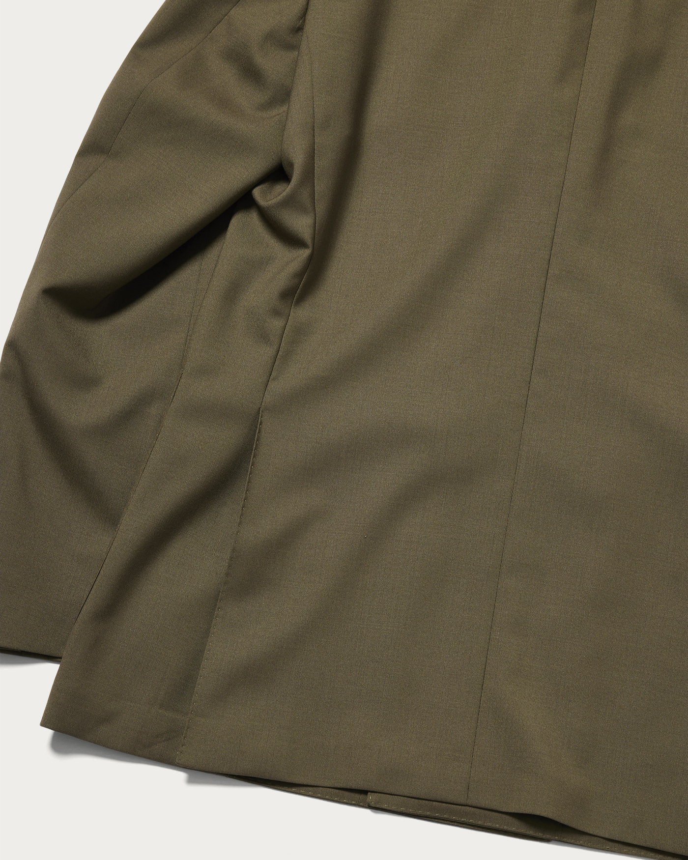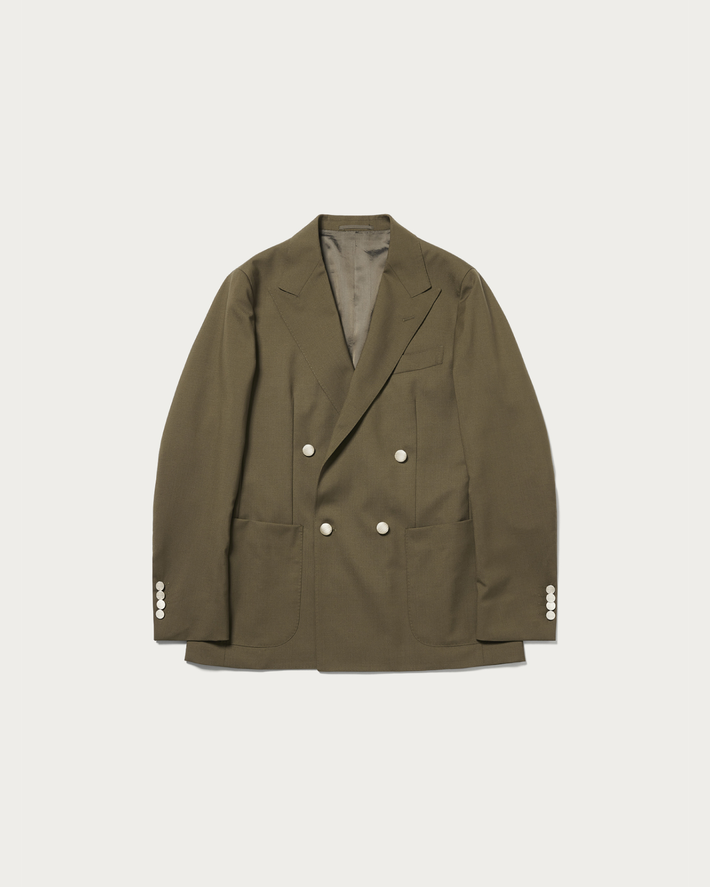 The blazer is characterized by its soft construction and refined silhouette. It features a lively expression with a four-button model that avoids excessive heaviness, subtly moderating the presence of metal buttons to achieve a modern look that doesn't lean too heavily on the classic side. Its lightweight design allows it to be worn casually, offering an attractive and comfortable fit.The material used is a tropical fabric woven from a blend of wool and mohair yarns wrapped with silk filament. This combination harmoniously merges the smoothness of wool, the firmness and crispness of mohair, and the gentle touch of silk, resulting in an exceptionally light and elegant texture.