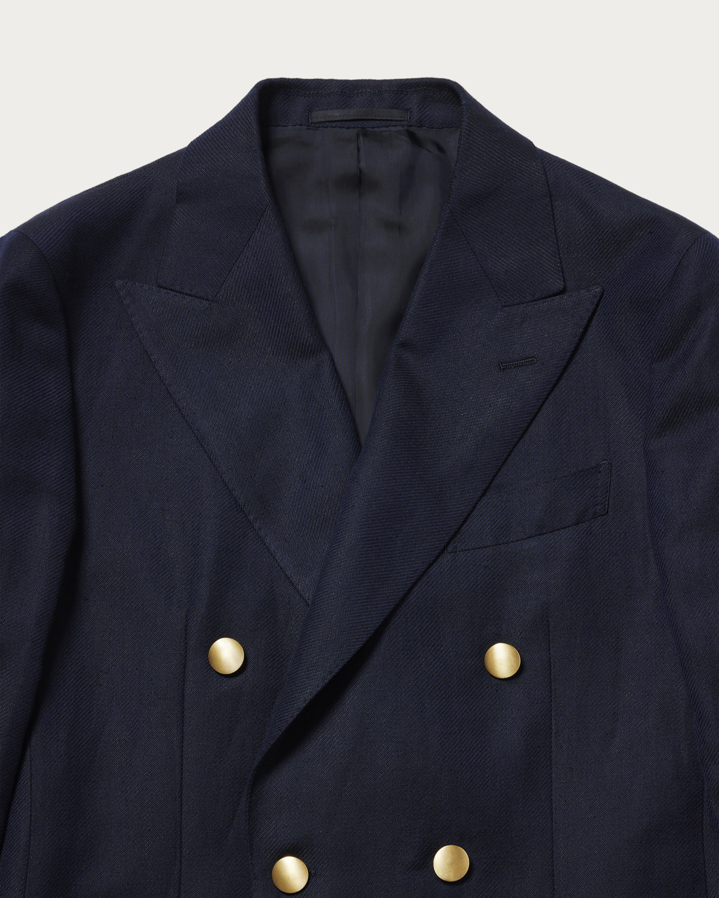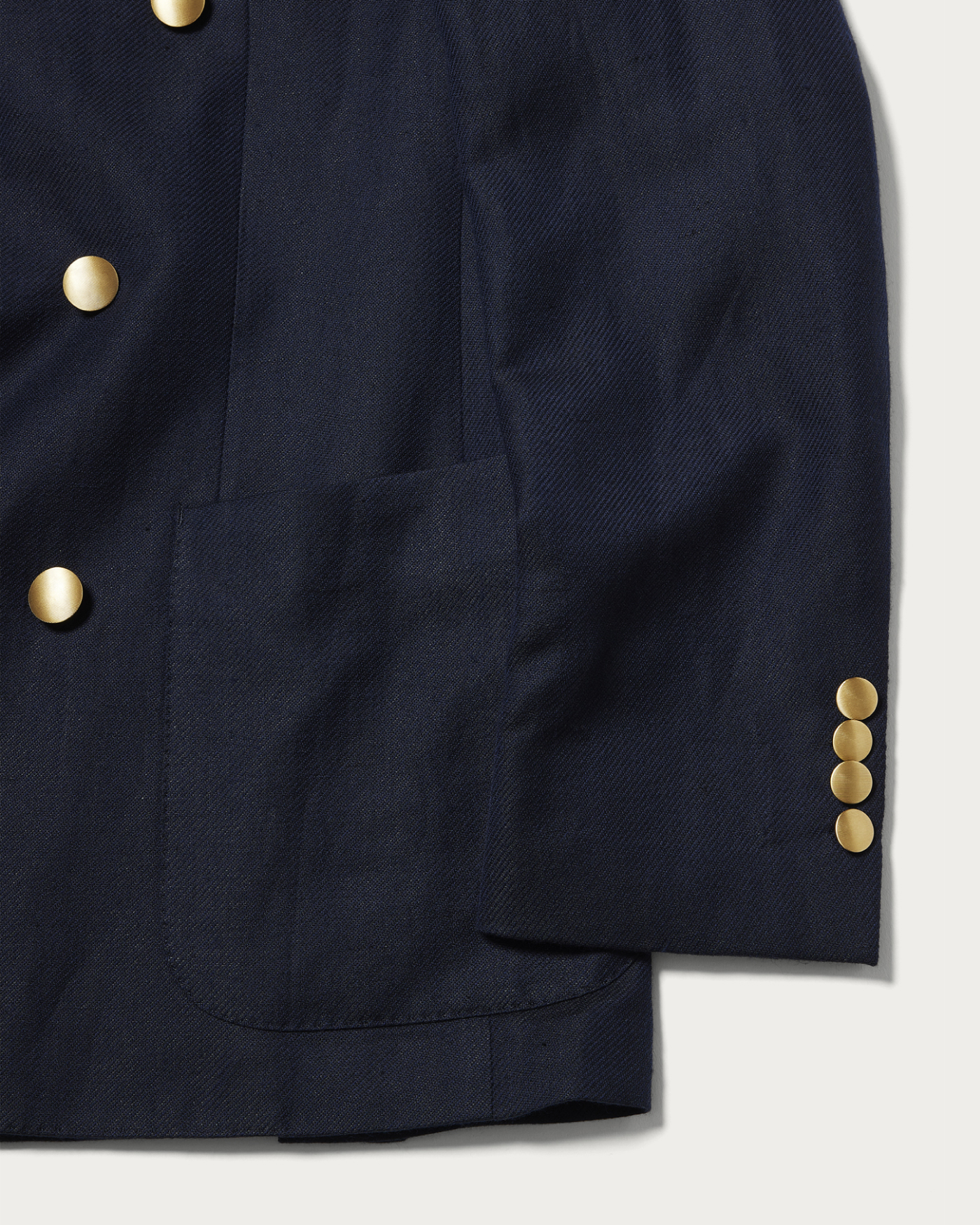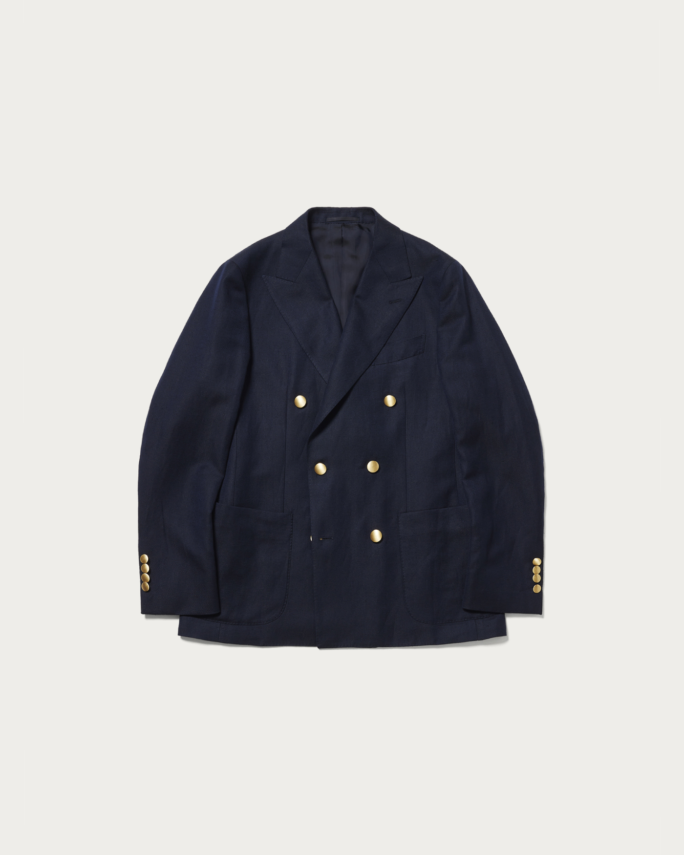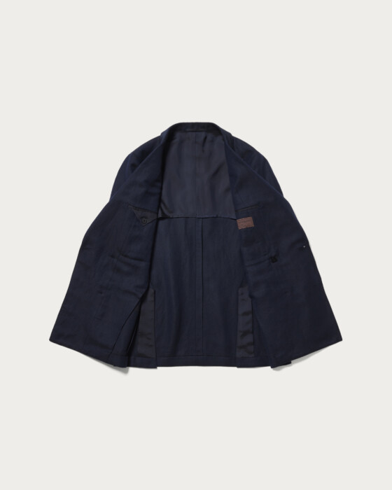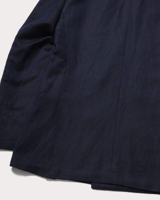 A blazer characterized by its soft construction and refined silhouette. While it features a classic six-button model, the light and natural texture gives it a gentle appearance and a relaxed demeanor. Its lightweight design allows it to be worn casually, offering both comfort and an appealing fit.The material used is wool linen from "VITALE BARBERIS CANONICO." It is distinguished by the deep expression created by the contrast of the warp and weft threads and the distinct diagonal weave. The fabric boasts a soft and supple texture, with a natural sheen and an Italian-inspired blue that stands out, resulting in an elegant material finish.