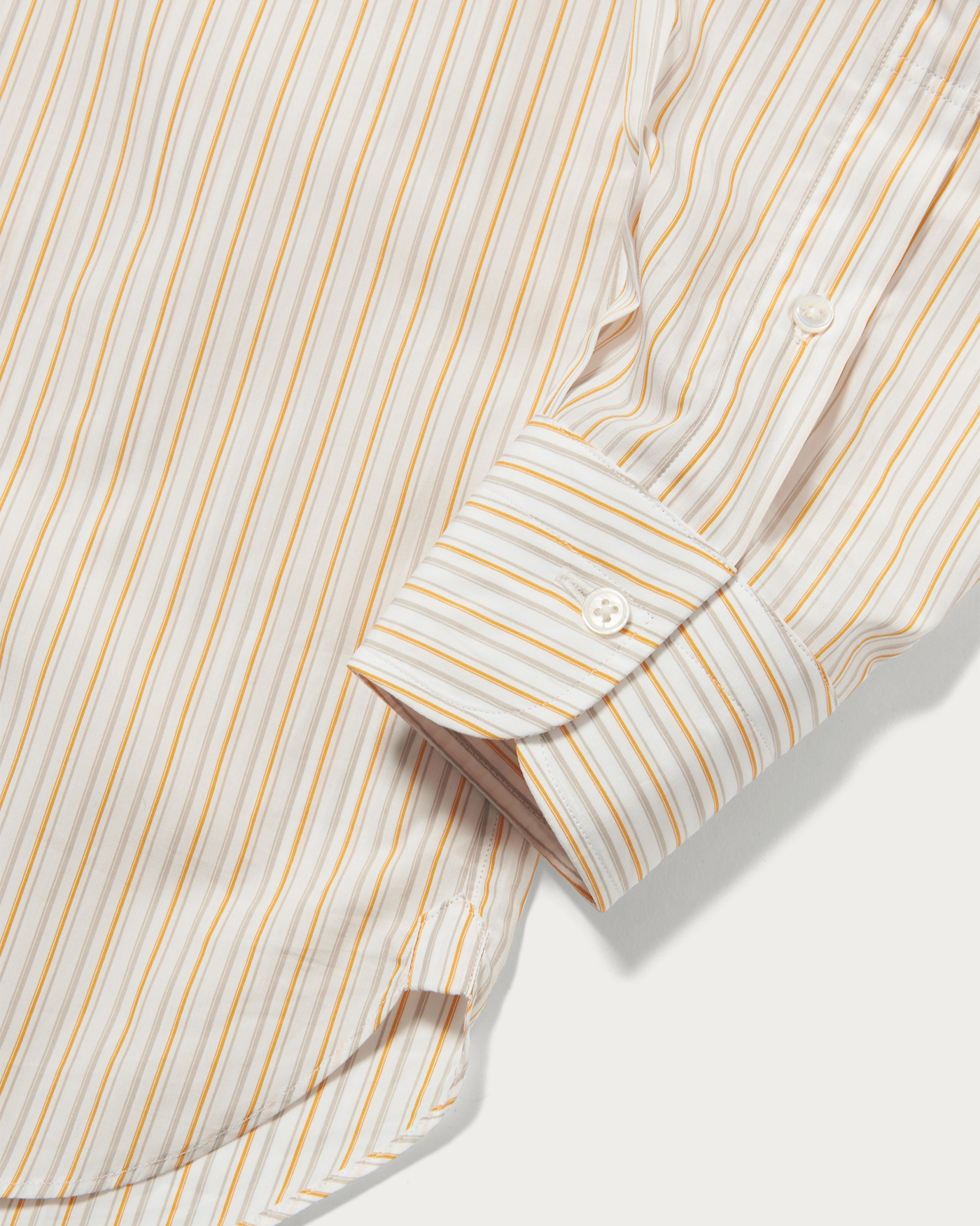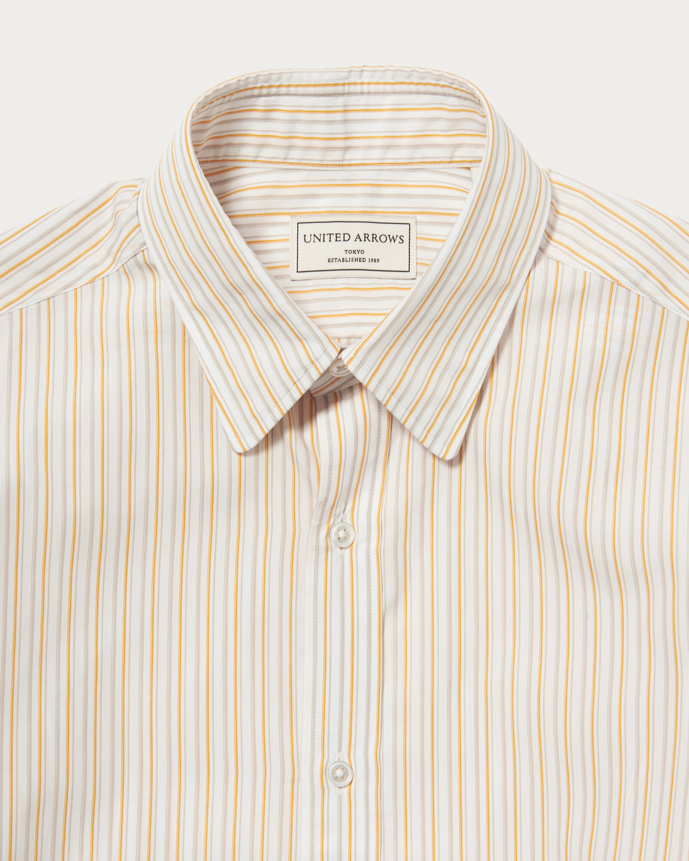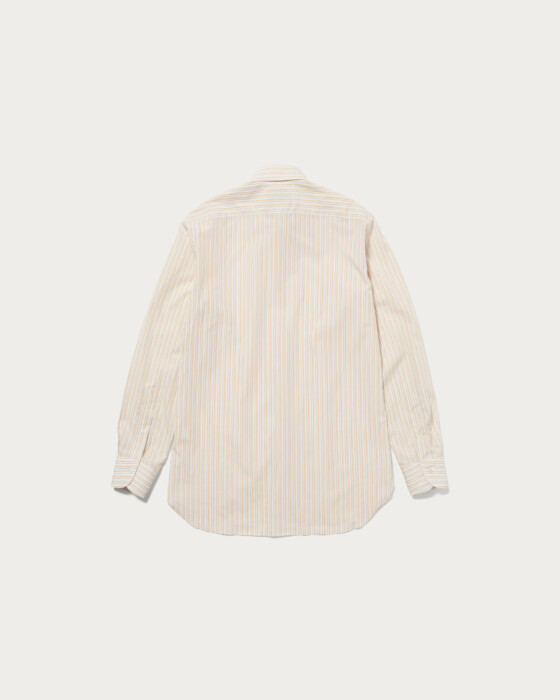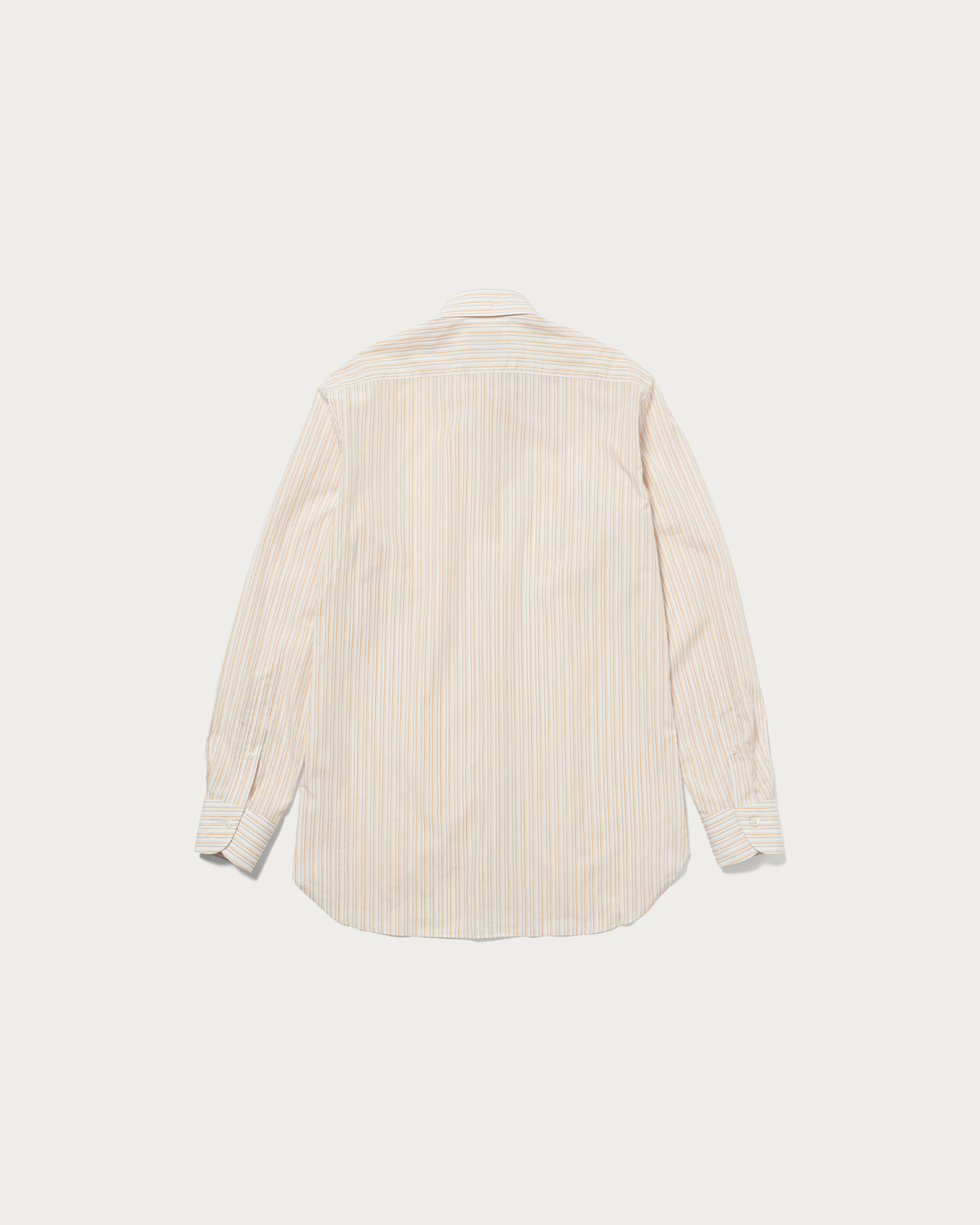 A round regular collar shirt with a soft impression, featuring rounded collar tips. The back style is designed without tucks, creating a clean look with a gentle line from the chest to the waist. The material used is a poplin fabric with an alternate stripe pattern in soft colors, from the "PIUMINO-9" seasonal collection by "ALBINI." The fine-thread material offers a gentle and smooth touch, which is its main appeal.