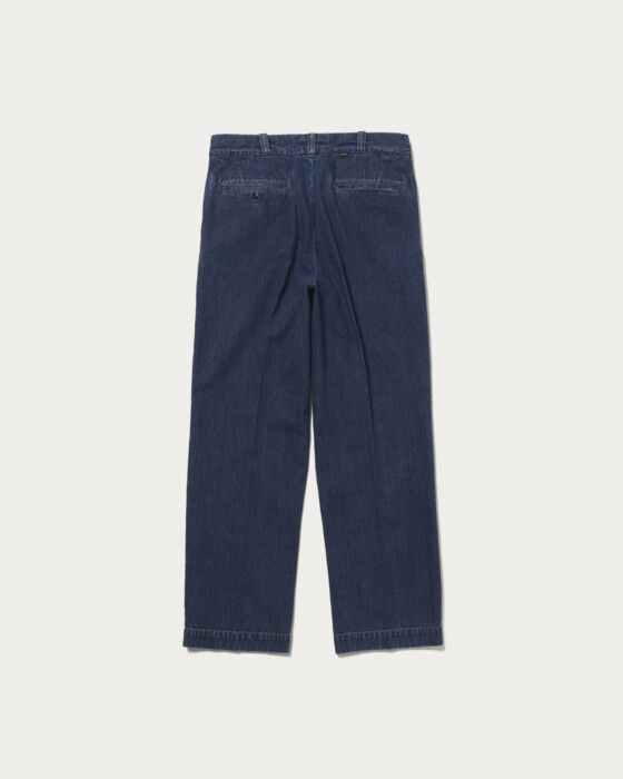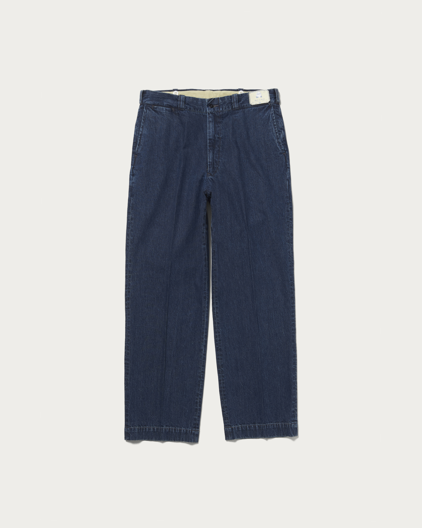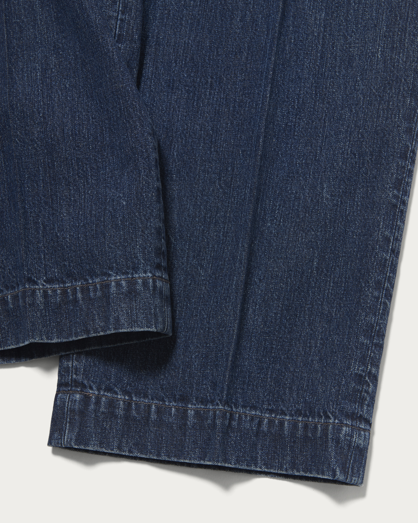 Faithfully following the 1940s 〈Lee〉 11W wartime model. We have carefully recreated the details from the era, such as the long 'L' engraved top button, double stitching, and 〈Lee〉 engraved donut buttons, which were used from the 1930s to the 1950s. The material used is Jelt denim, and the finish is a used wash. The hip pocket is adorned with a 〈Scye〉 × 〈Lee〉 original bandana as a flasher label, adding a symbolic accent where vintage and modern intersect.
