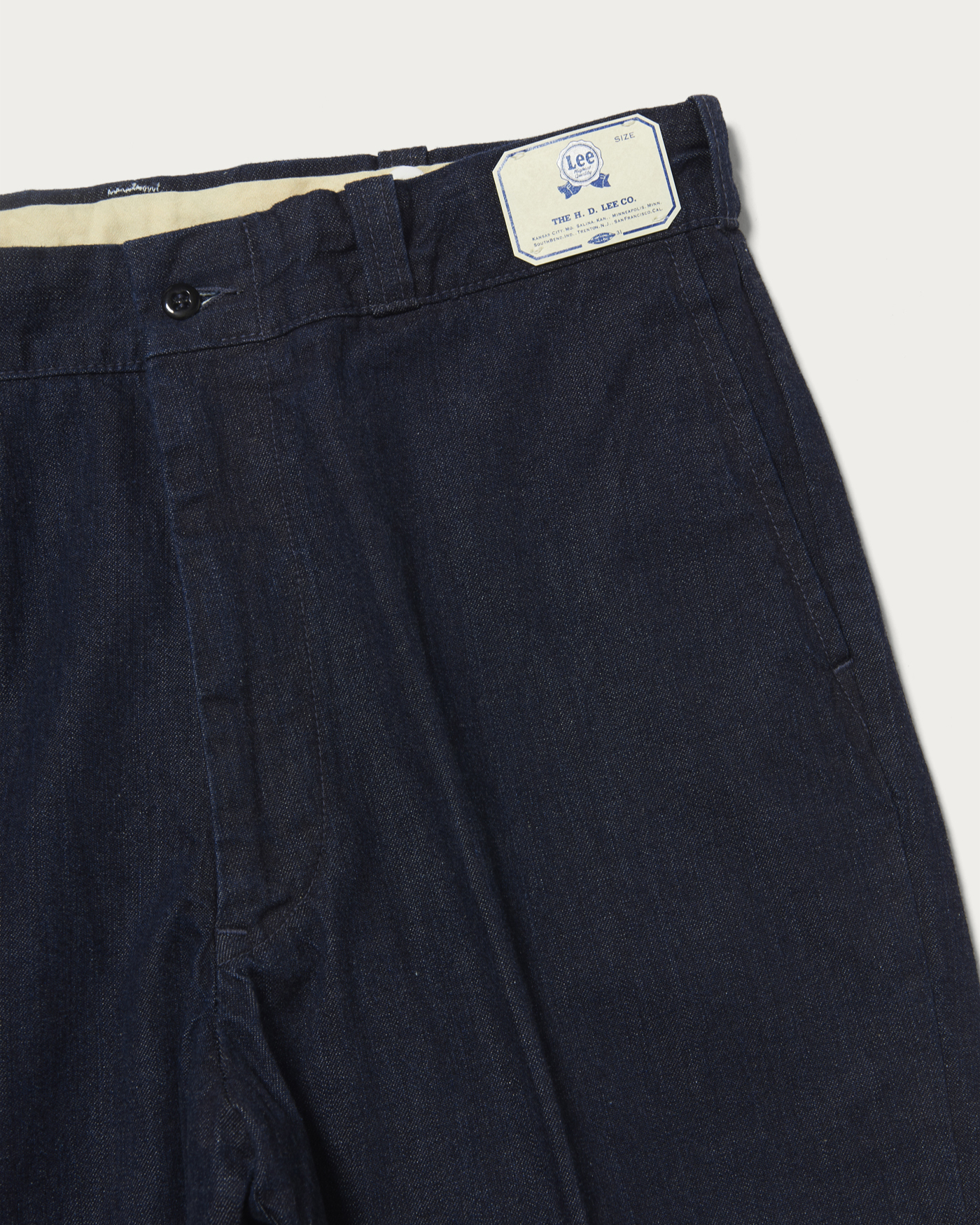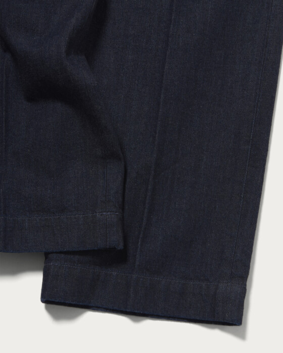 The 1940s 〈Lee〉 11W wartime model has been faithfully reproduced. We have carefully recreated the details from that era, including the long "L" engraved top button, double stitching, and 〈Lee〉 engraved donut buttons, which were used from the 1930s to the 1950s. The material used is Jelt denim, and the finish is one-wash. The hip pocket is adorned with a 〈Scye〉 × 〈Lee〉 original bandana as a flasher label, adding a symbolic accent where vintage and modern intersect.