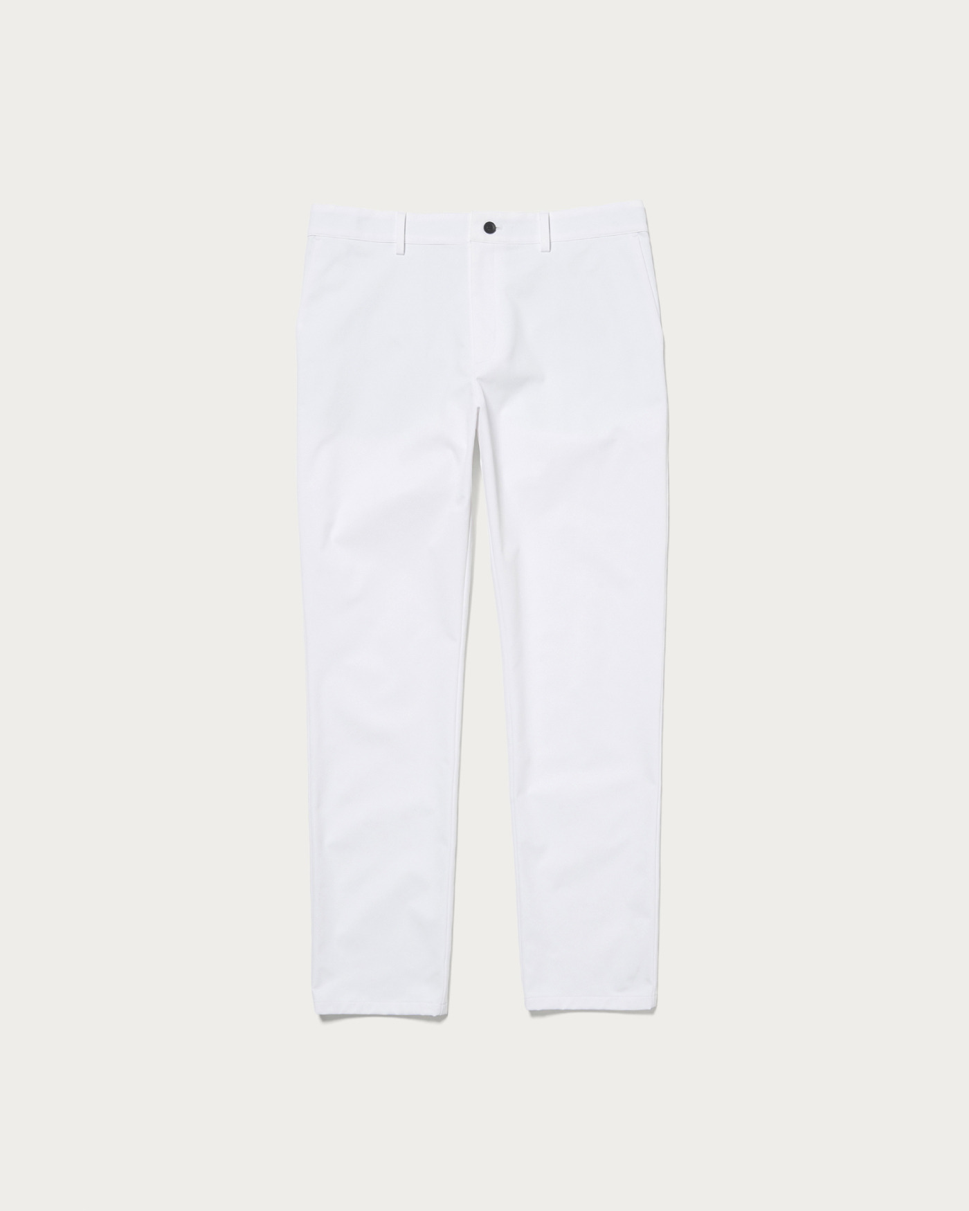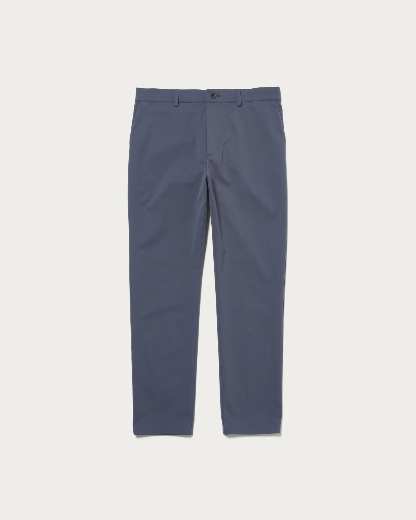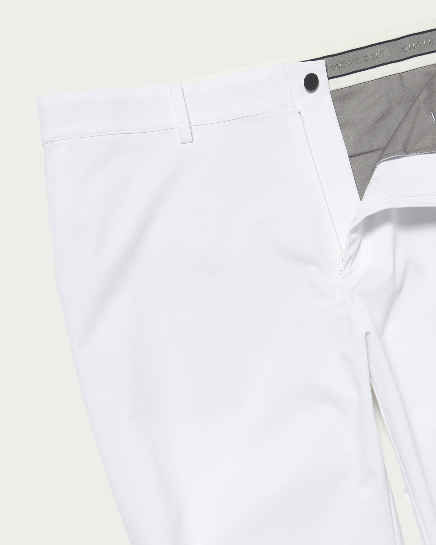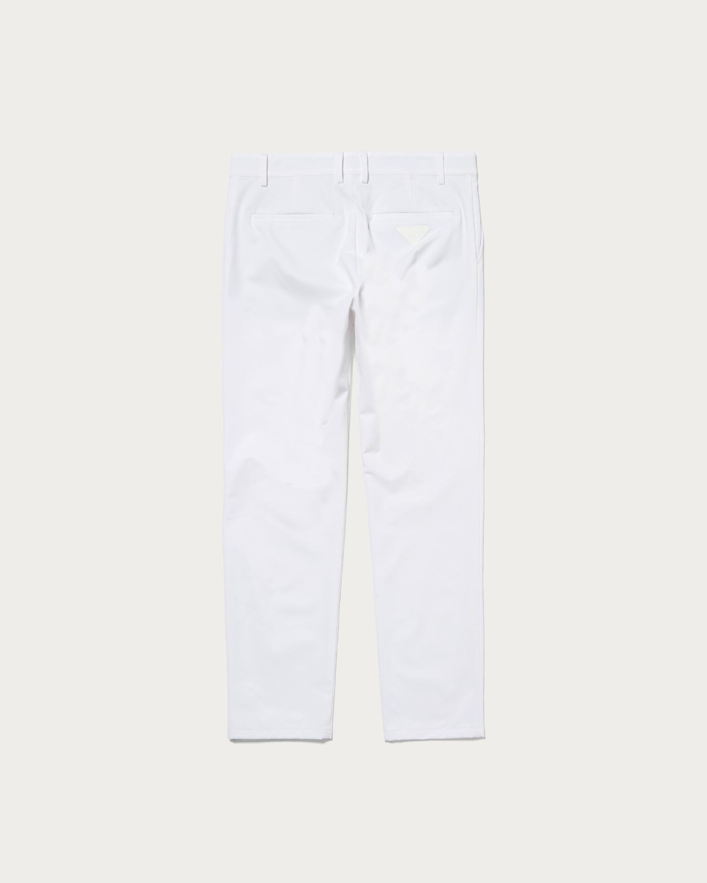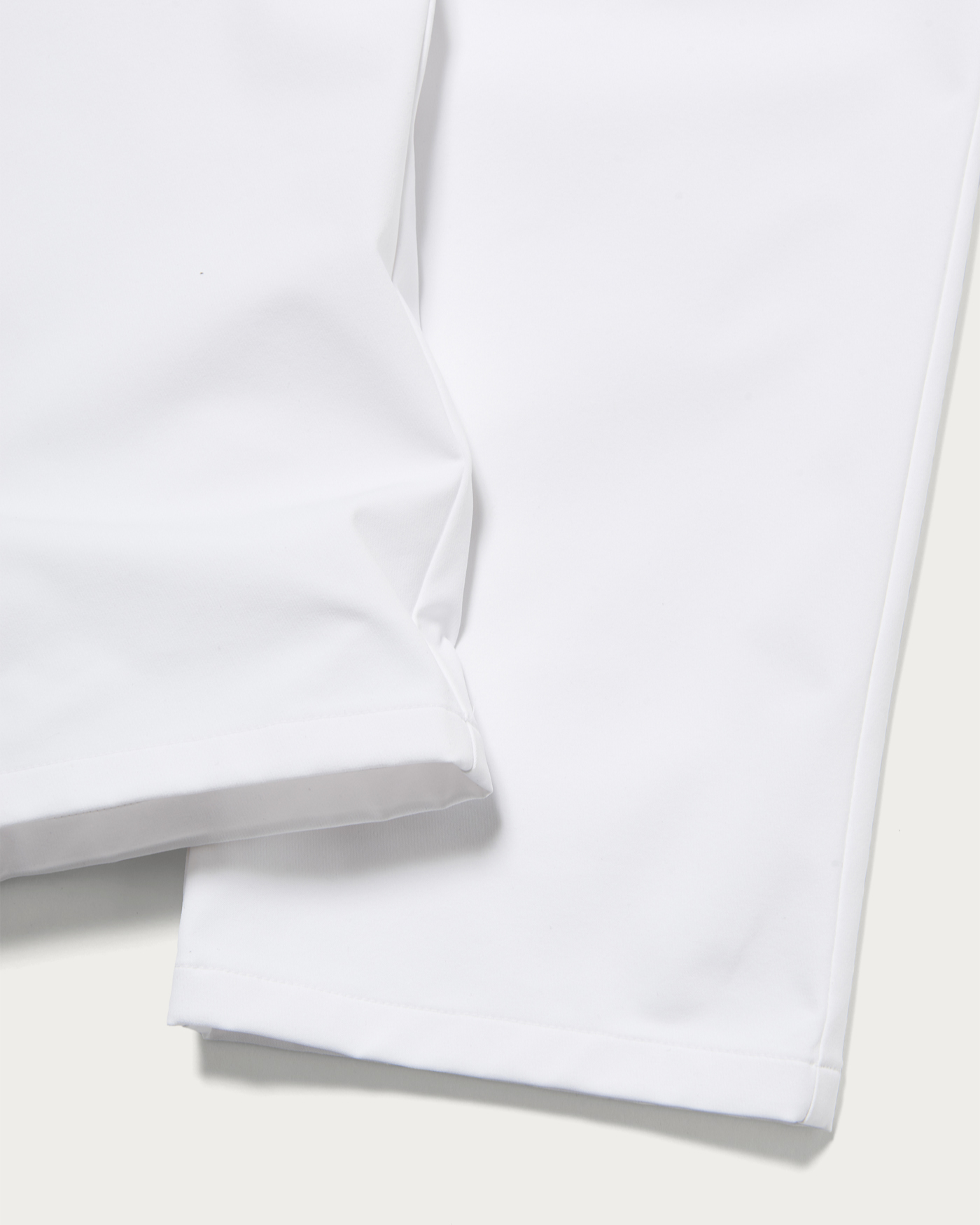 Basic no-pleat pants made from polyester material. The waist features a jacquard elastic band with moderate stretch, elegantly showcasing the brand logo. The non-slip print prevents shirts from riding up. A brand icon patch is placed below the right back pocket.