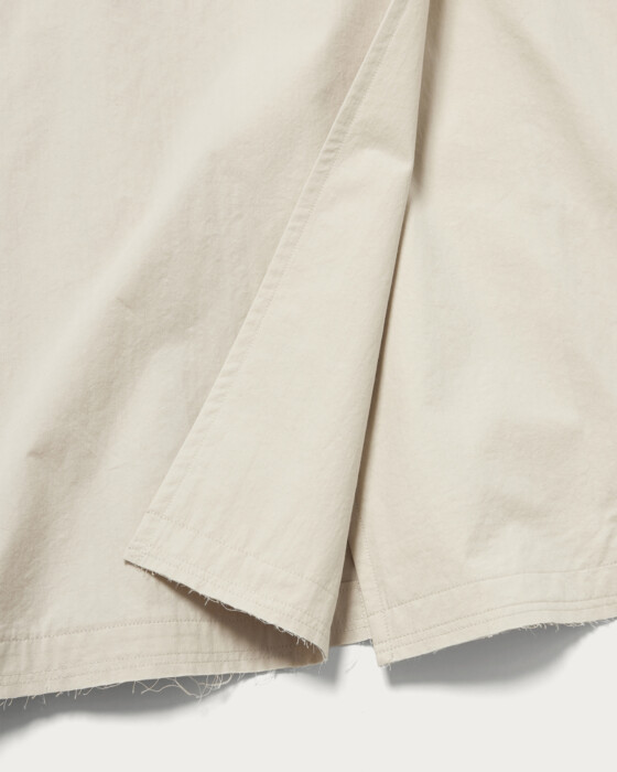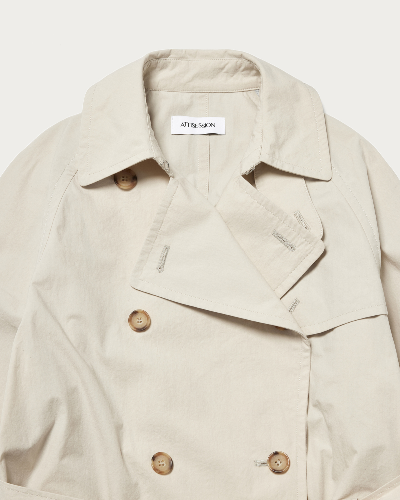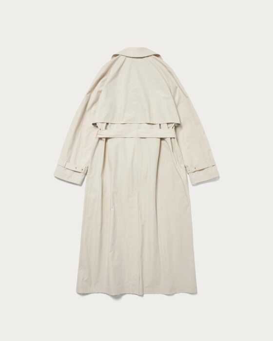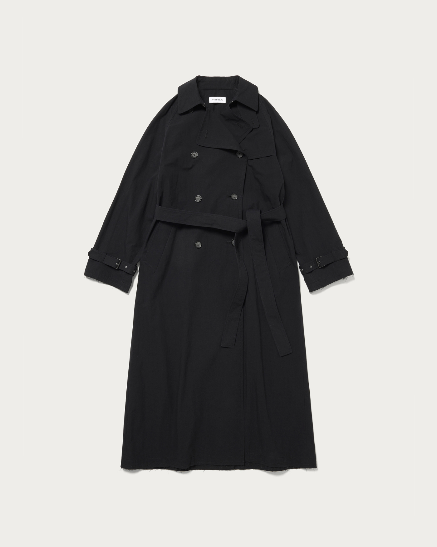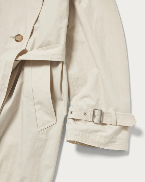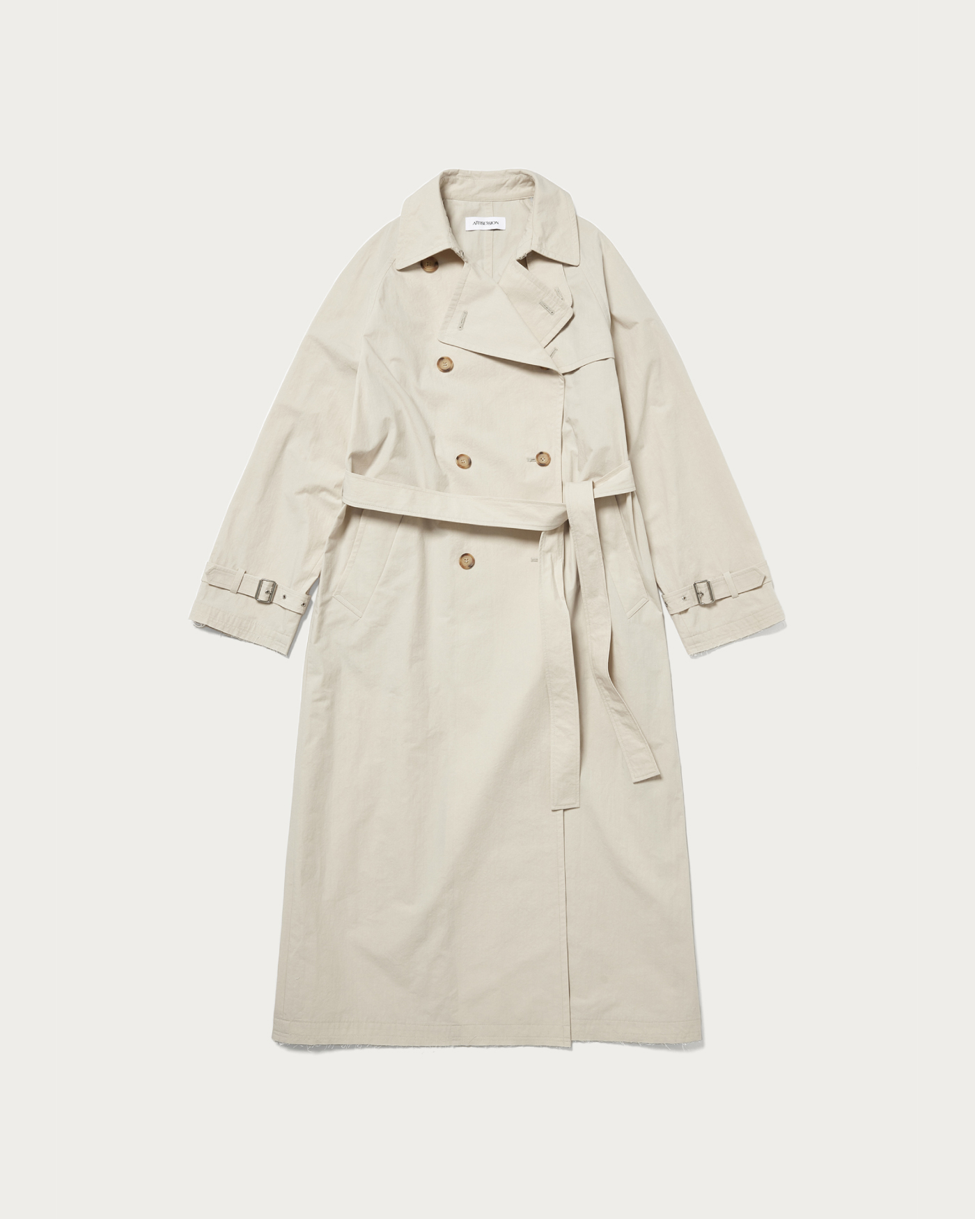 A trench coat enhanced with a relaxed feel through raw edge details and a waist belt that can be styled in multiple ways. Made from a natural-textured cotton-nylon material, it features a light and effortless design. This piece pairs easily with any item, making it perfect for spring styling.