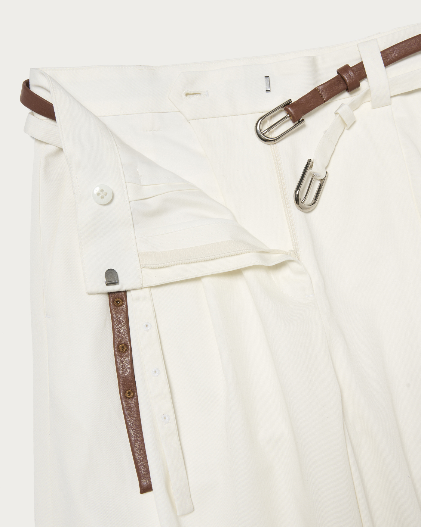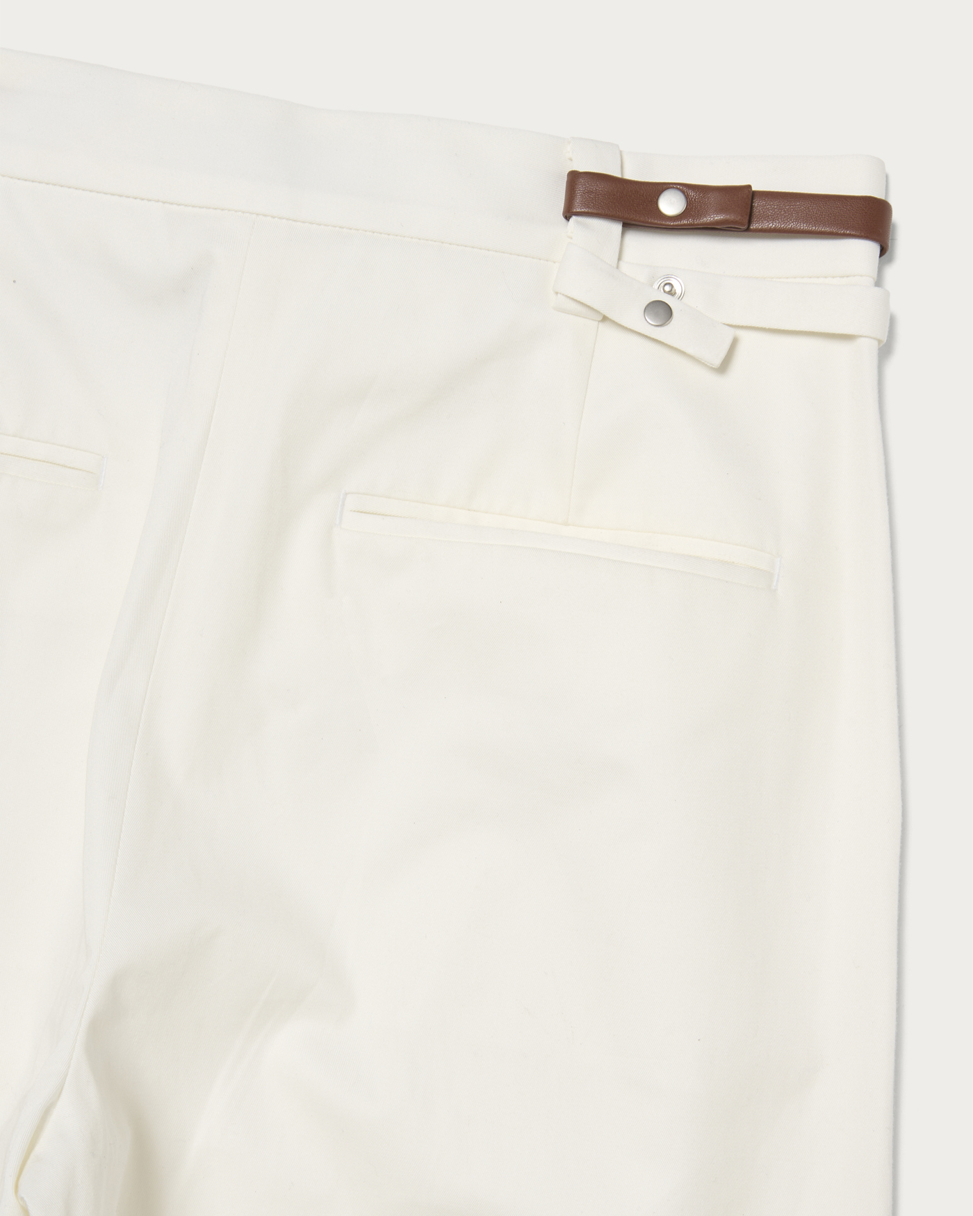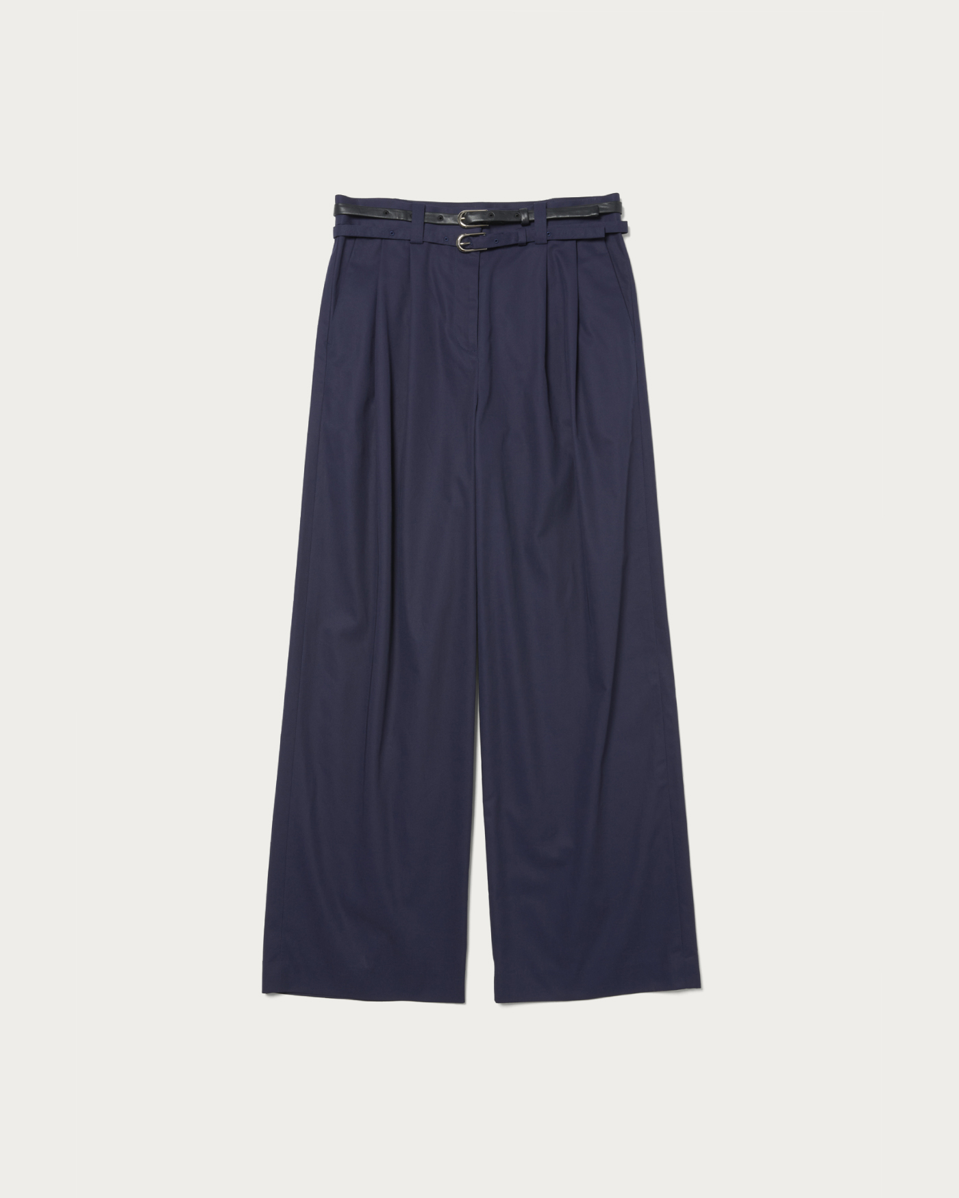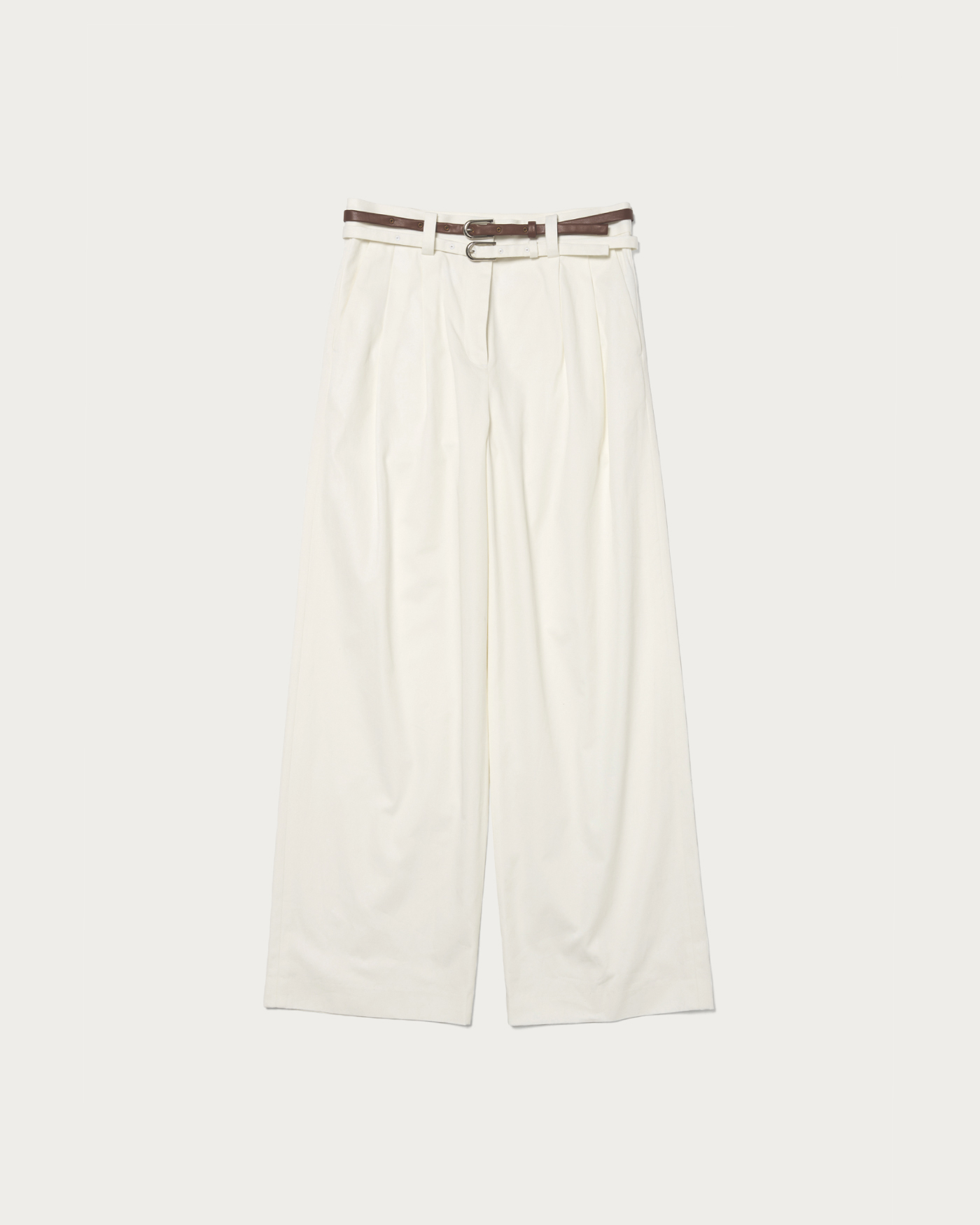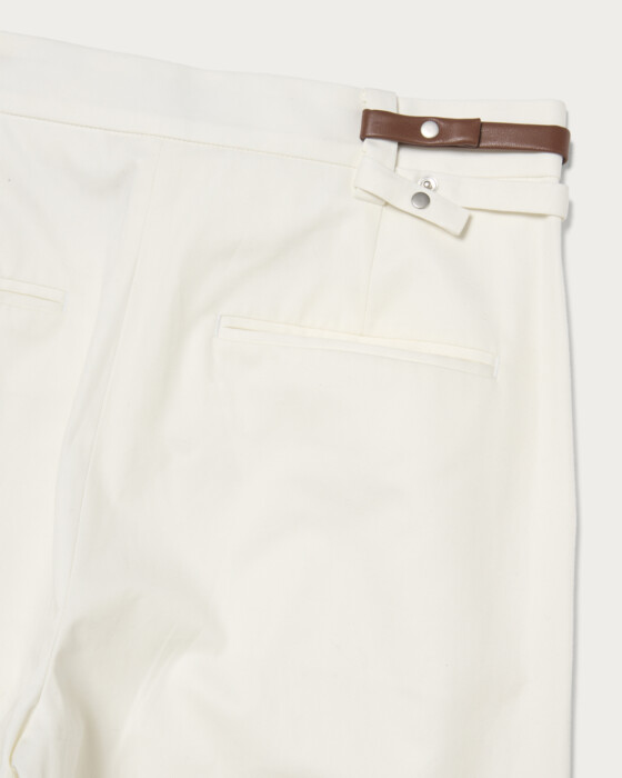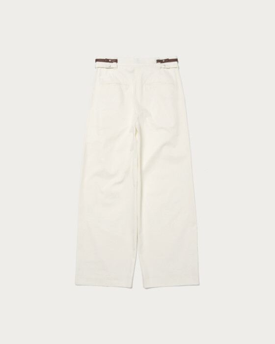The straight pants, featuring two belts that refine the waist and impart an elegant impression, are designed with two tucks to provide a comfortable fit and create a silhouette that beautifully enhances the legs. The updated material is light and has a high-quality texture, making it suitable for both polished and casual looks. These pants are versatile enough to be worn for a wide range of occasions, from everyday wear to more formal styles.