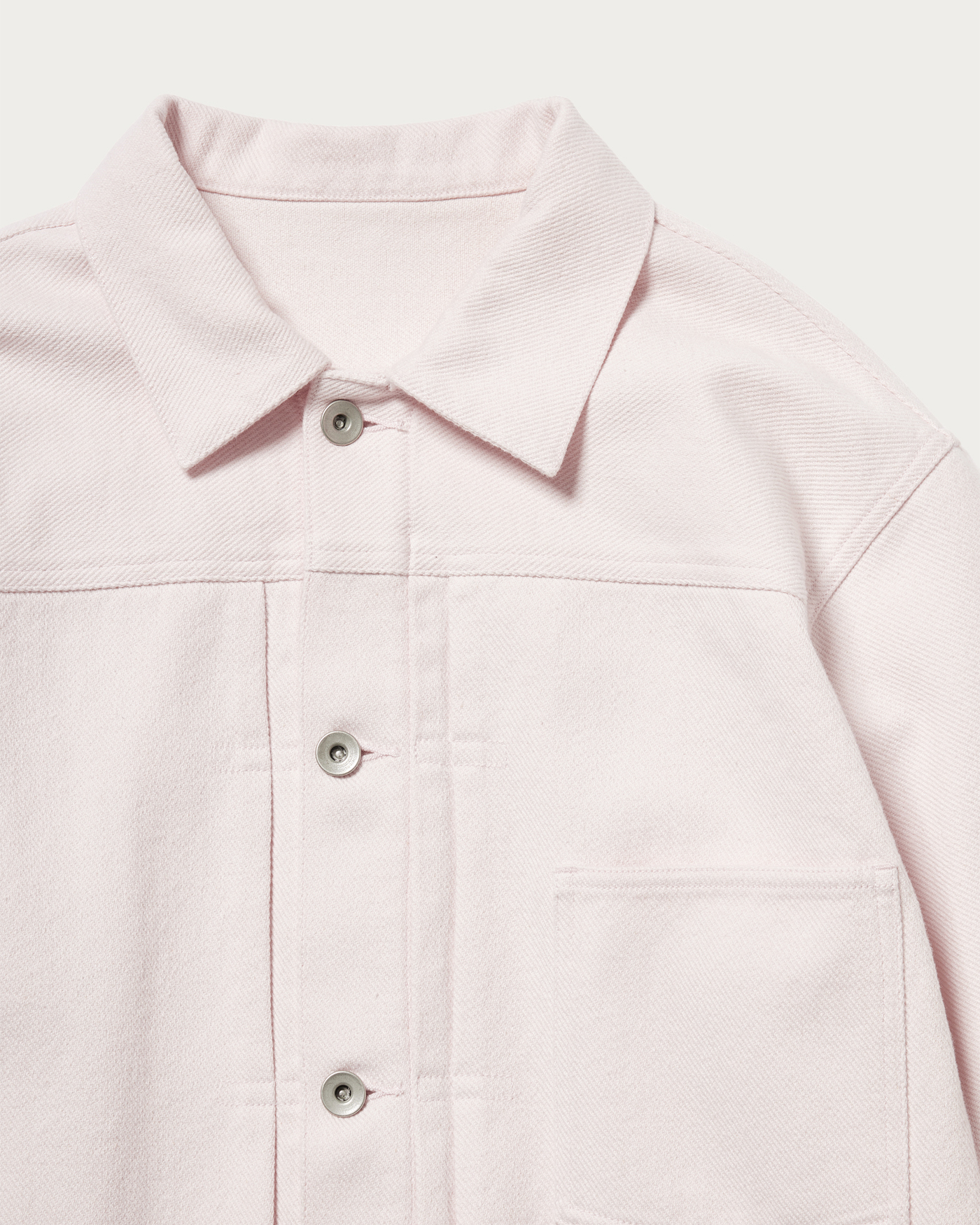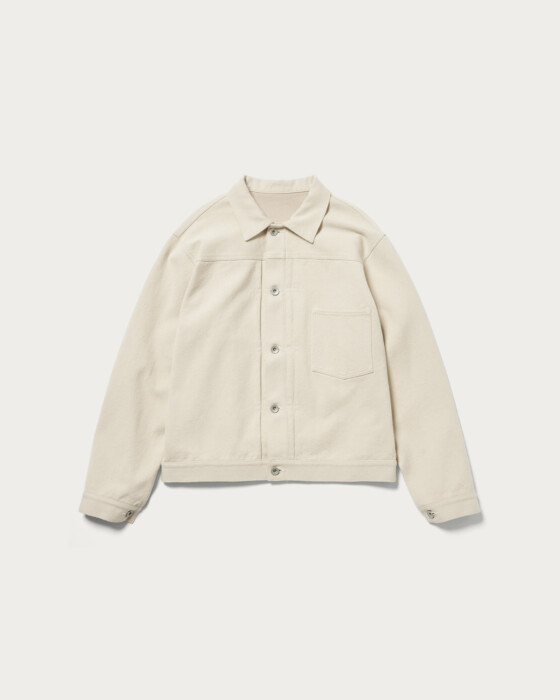 A casual cotton jacket that lifts your spirits for spring. Based on the silhouette of a boxy denim jacket, it features a single pocket without a flap, finished with simple details for an elegant look. Available in two colors: a deep natural and pink. We also recommend pairing it with matching pants for a coordinated set-up.
