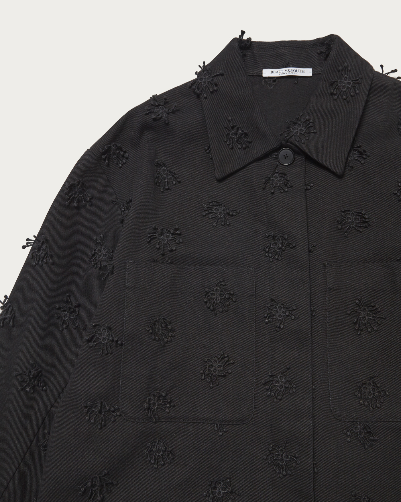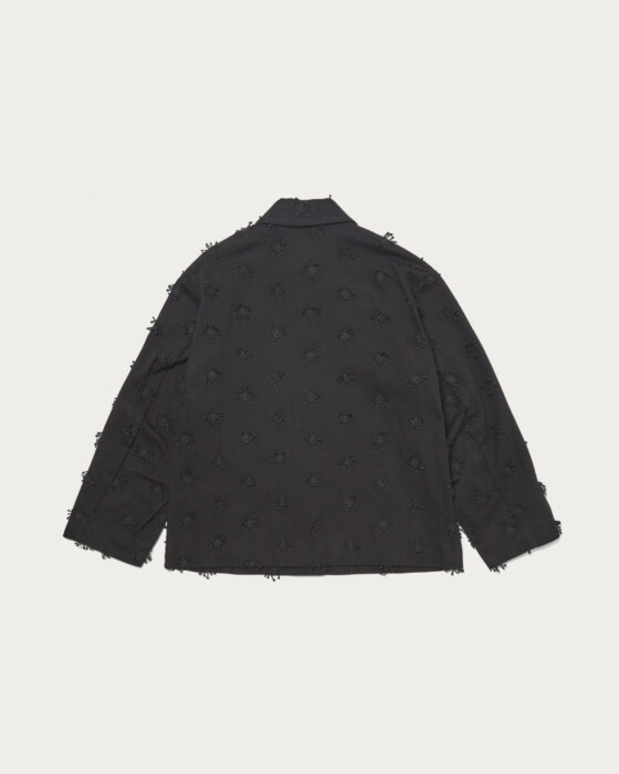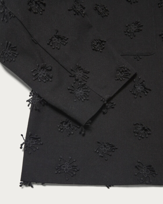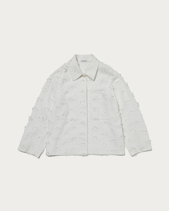 A short jacket with three-dimensional embroidery that can be simply and lightly worn. The concealed buttons and large pockets are key features. While a style with the jacket as the main piece paired with simple bottoms is lovely, this is an item you should definitely try as part of a set-up.