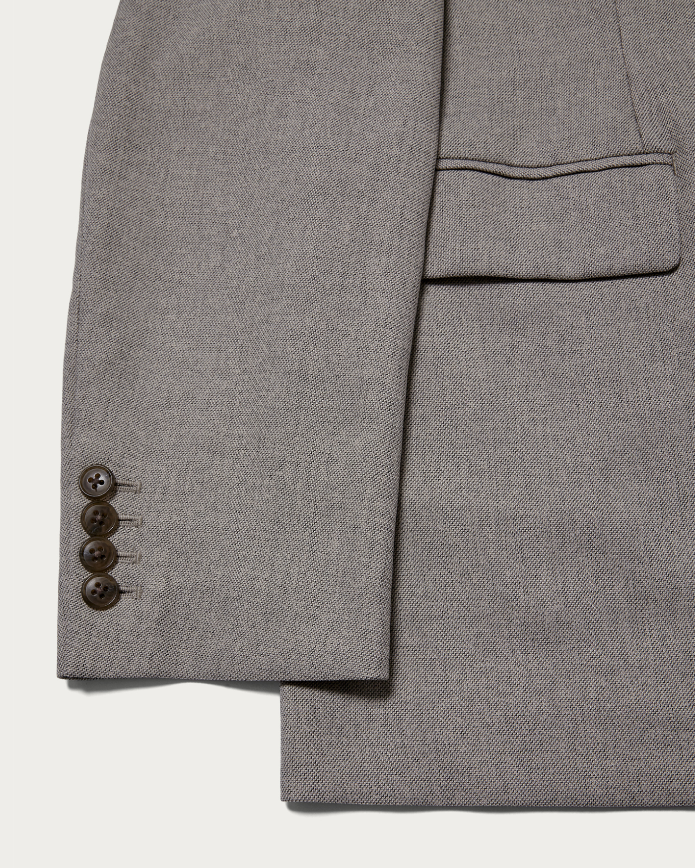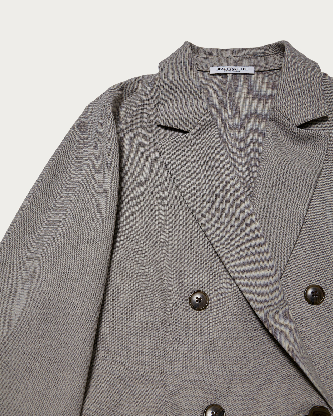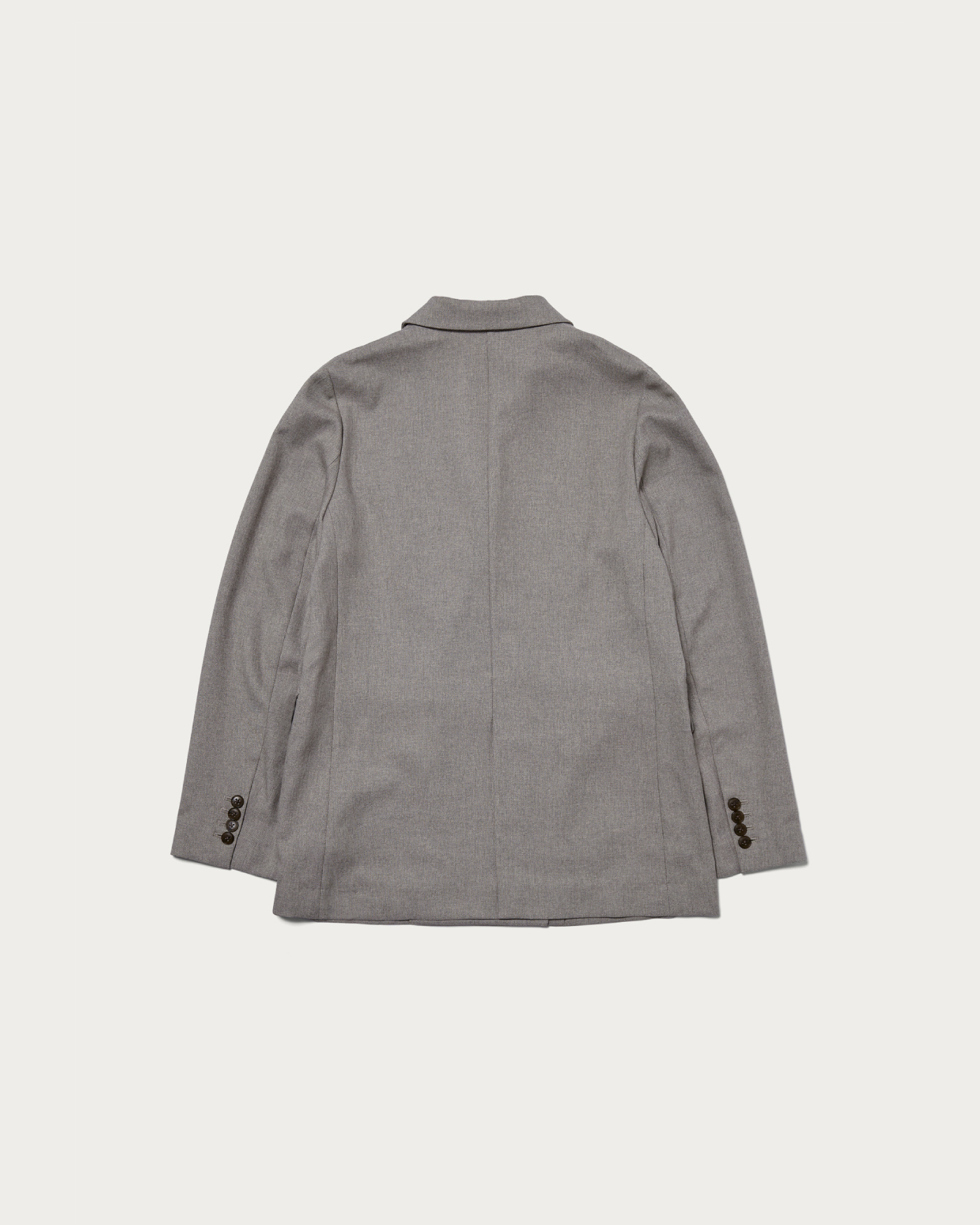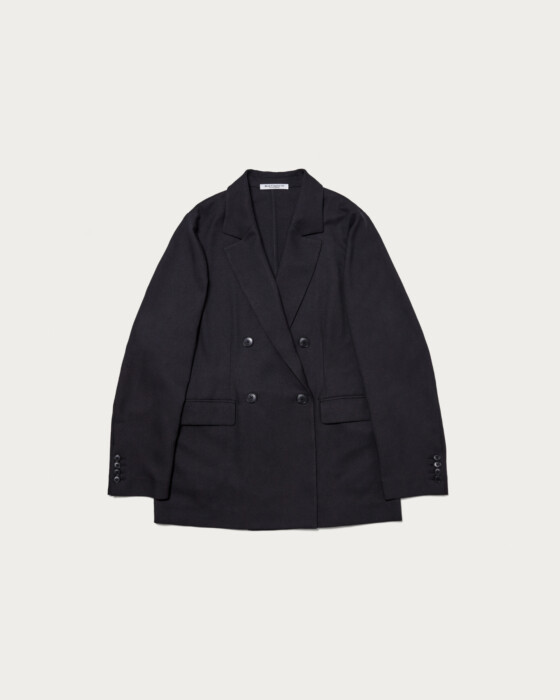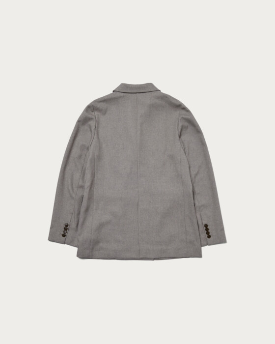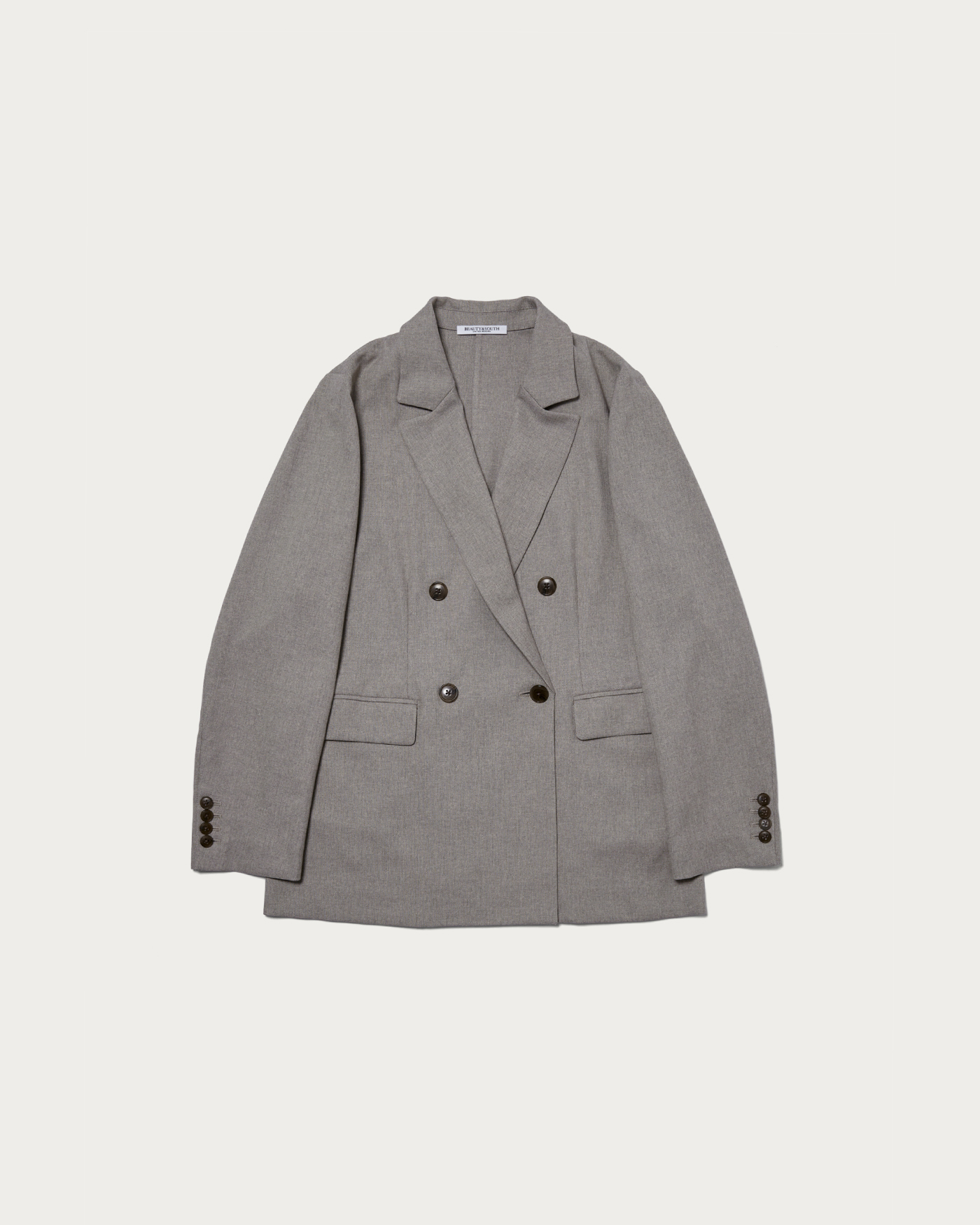 A four-button blazer-style double jacket, crafted with a single-layer construction for a lightweight finish. The slightly longer length that covers the hips, combined with a relaxed fit in the body and sleeves, creates an elegantly casual look. The beige color is designed with a tweed-like depth. It is recommended to style it with a lace shirt for a coordinated set-up with the same material, or pair it with casual bottoms like chinos.