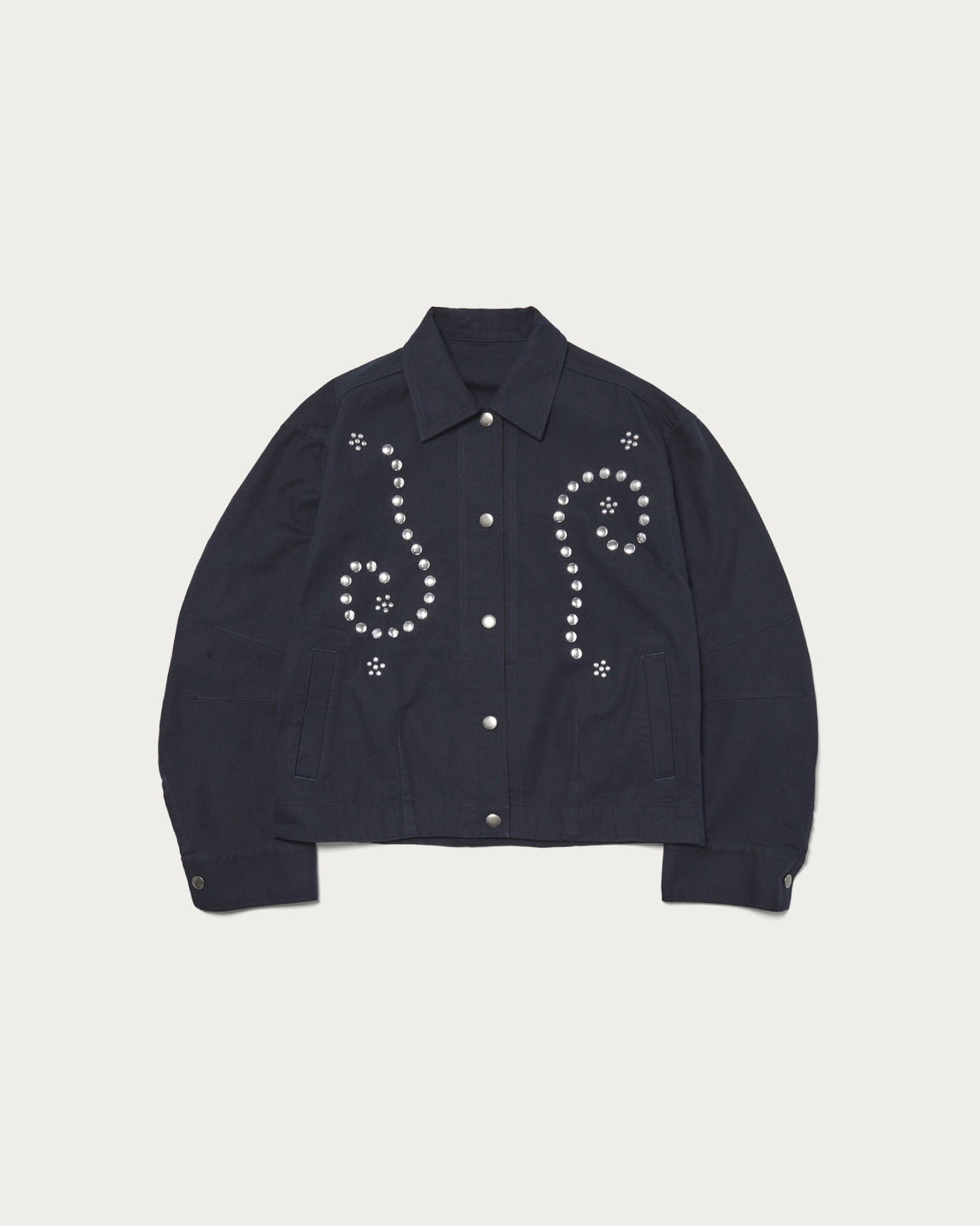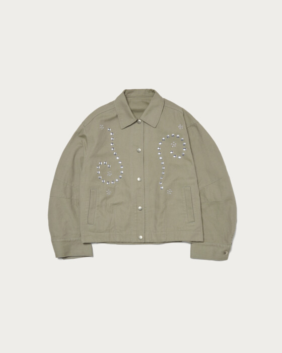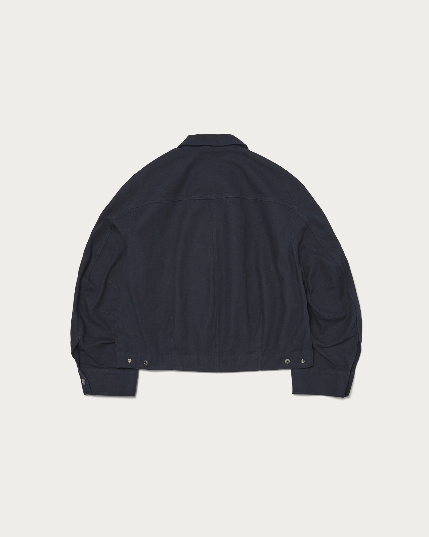 This piece features a voluminous sleeve with darts that create a rounded form and curves, along with a hem accented with darts and tabs on the sides to add variation to the silhouette. The standout feature is the playful, oversized metal parts. Both the olive and navy versions are treated with a bio-wash finish, with the olive offering a faded look and the navy providing a casual feel.
