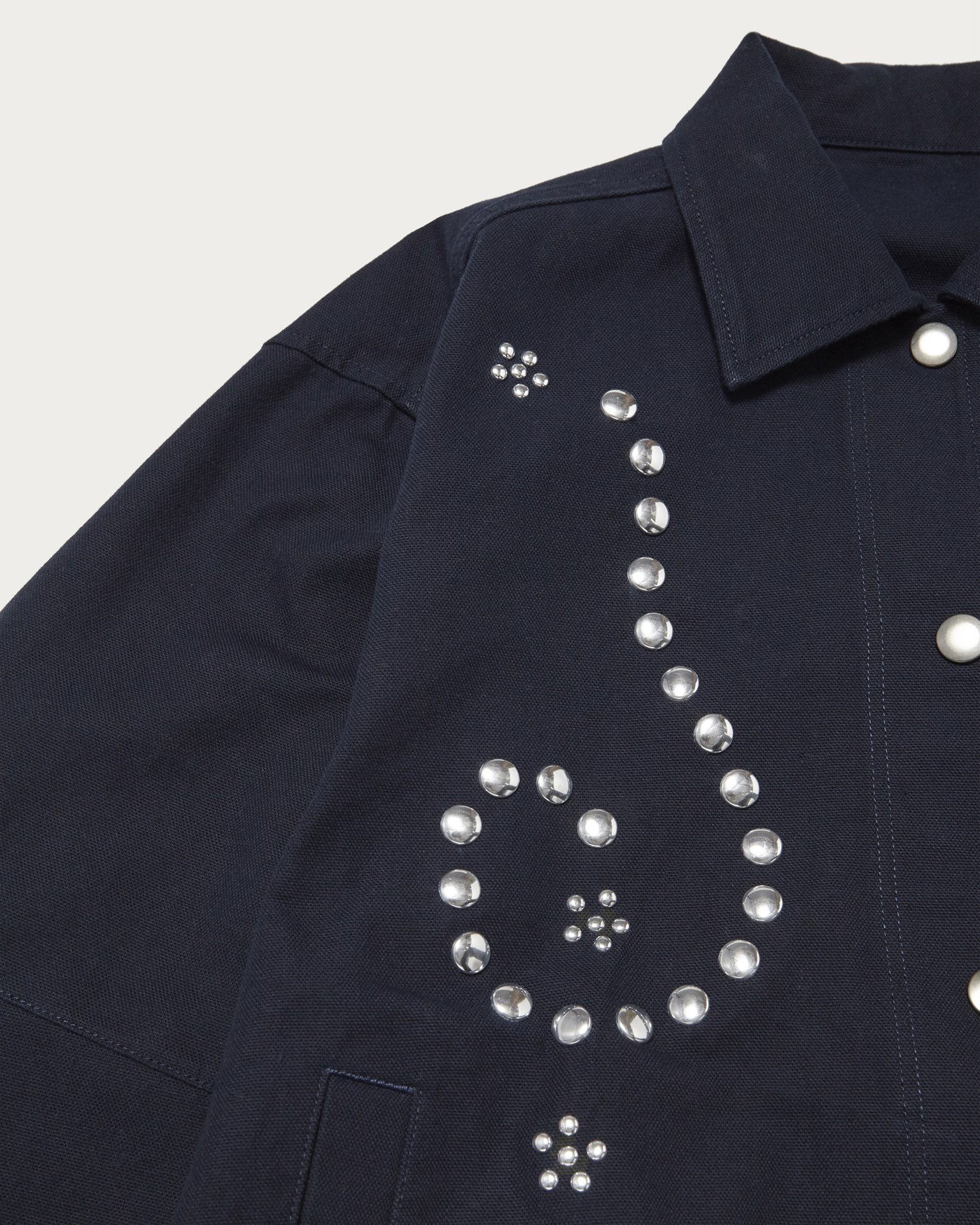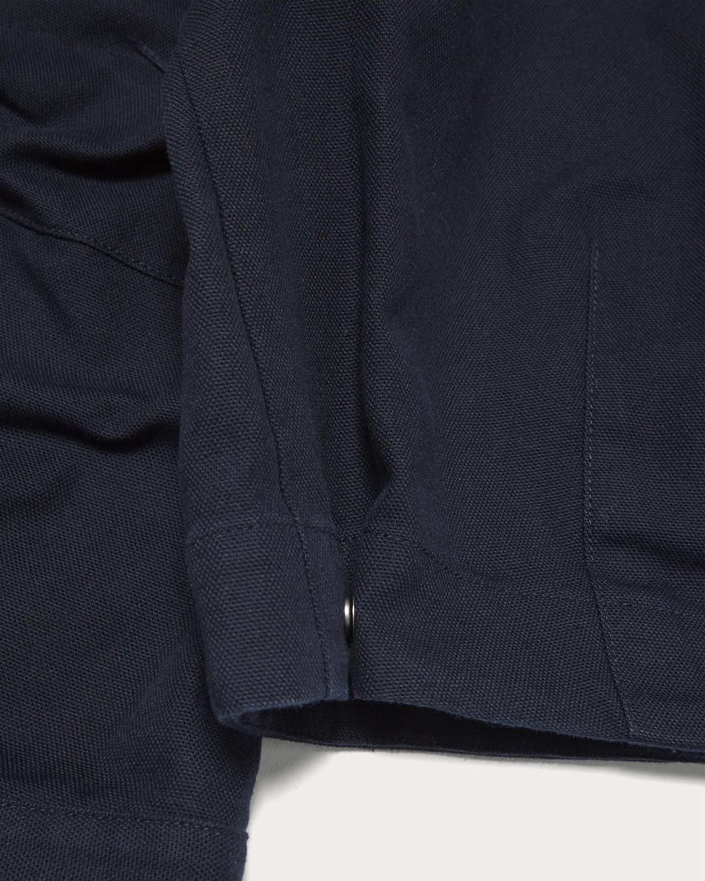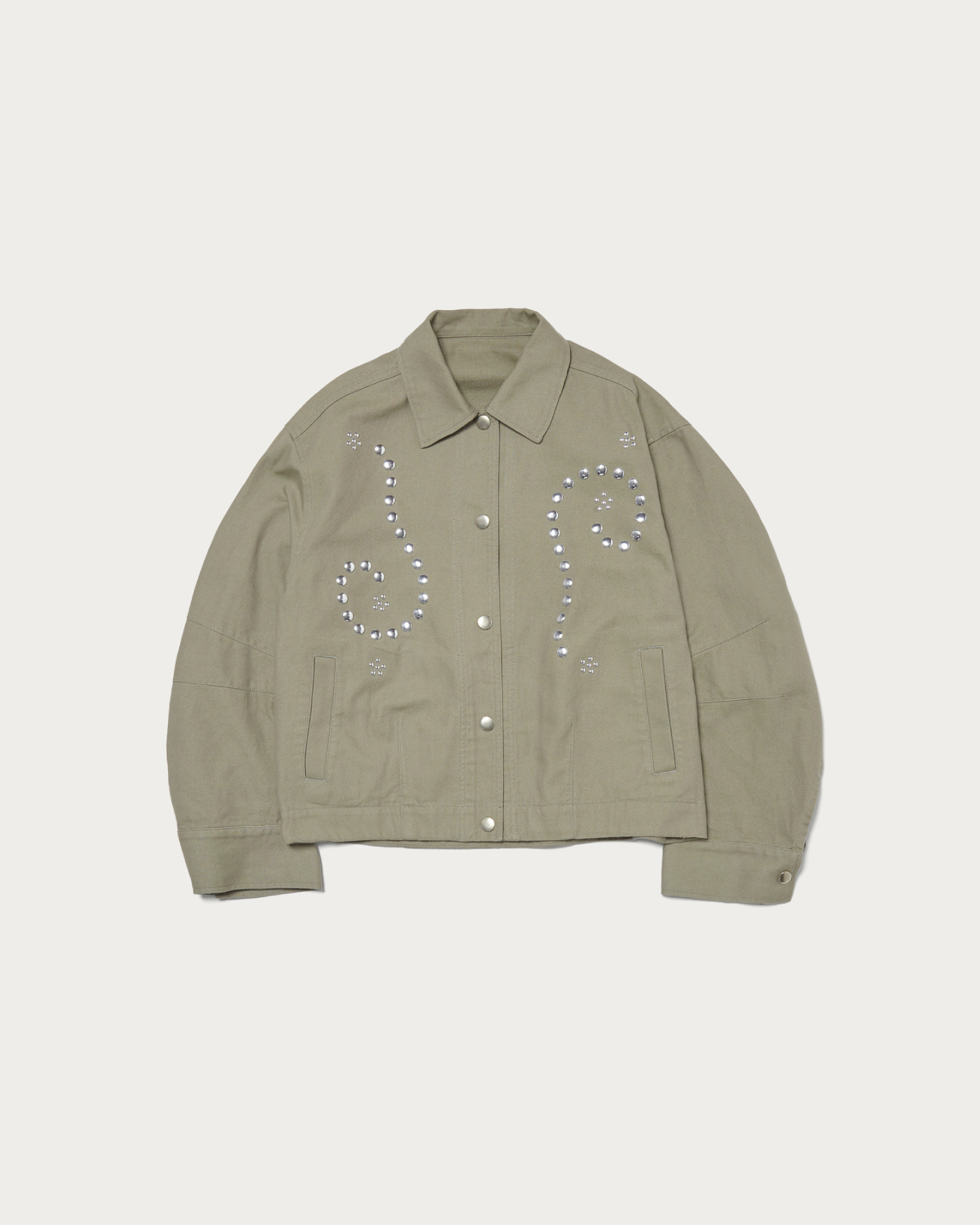 This piece features a voluminous sleeve with darts that create a rounded form and curves, along with a hem accented with darts and tabs on the sides to add variation to the silhouette. The standout feature is the playful, oversized metal parts. Both the olive and navy versions are treated with a bio-wash finish, with the olive offering a faded look and the navy providing a casual feel.