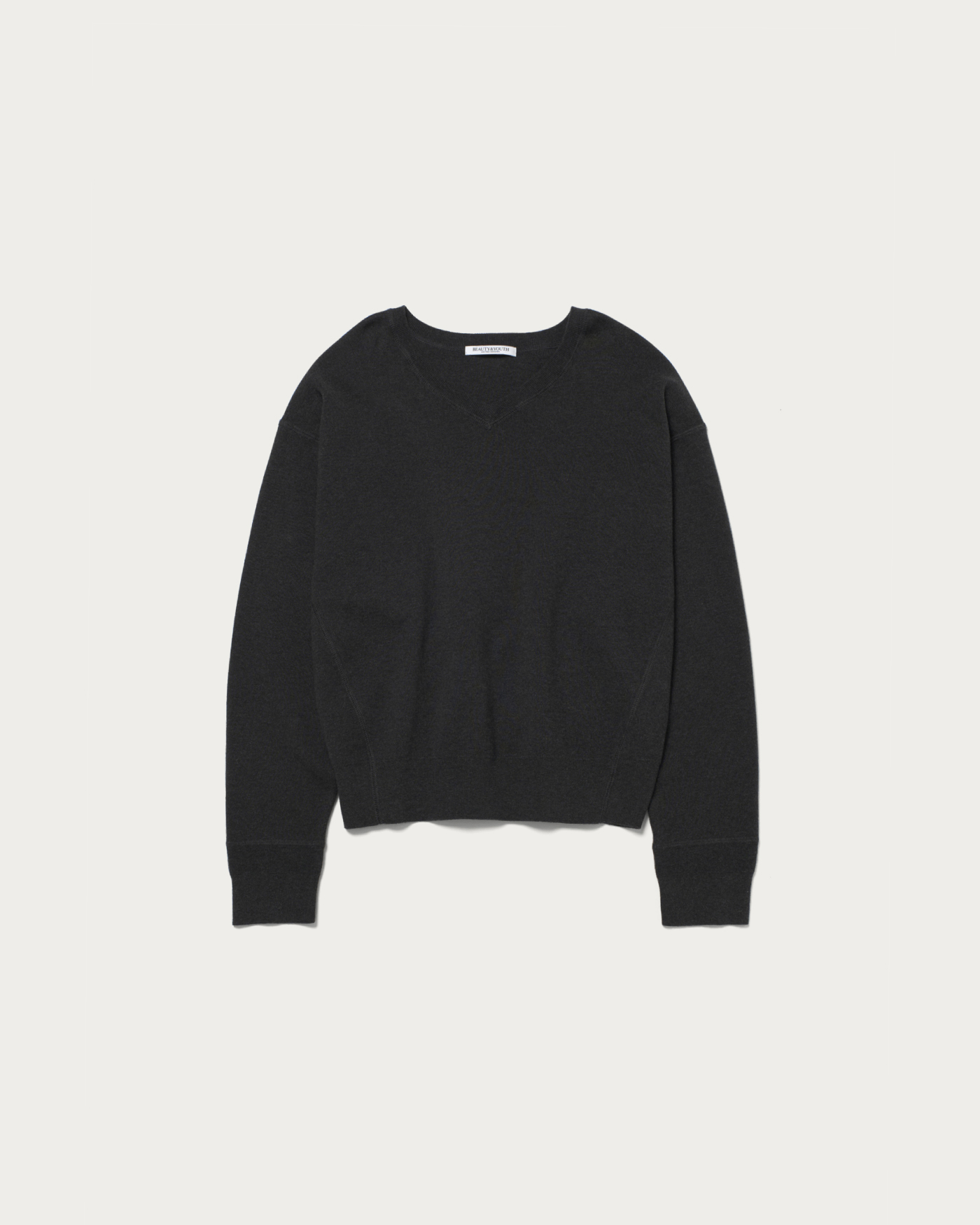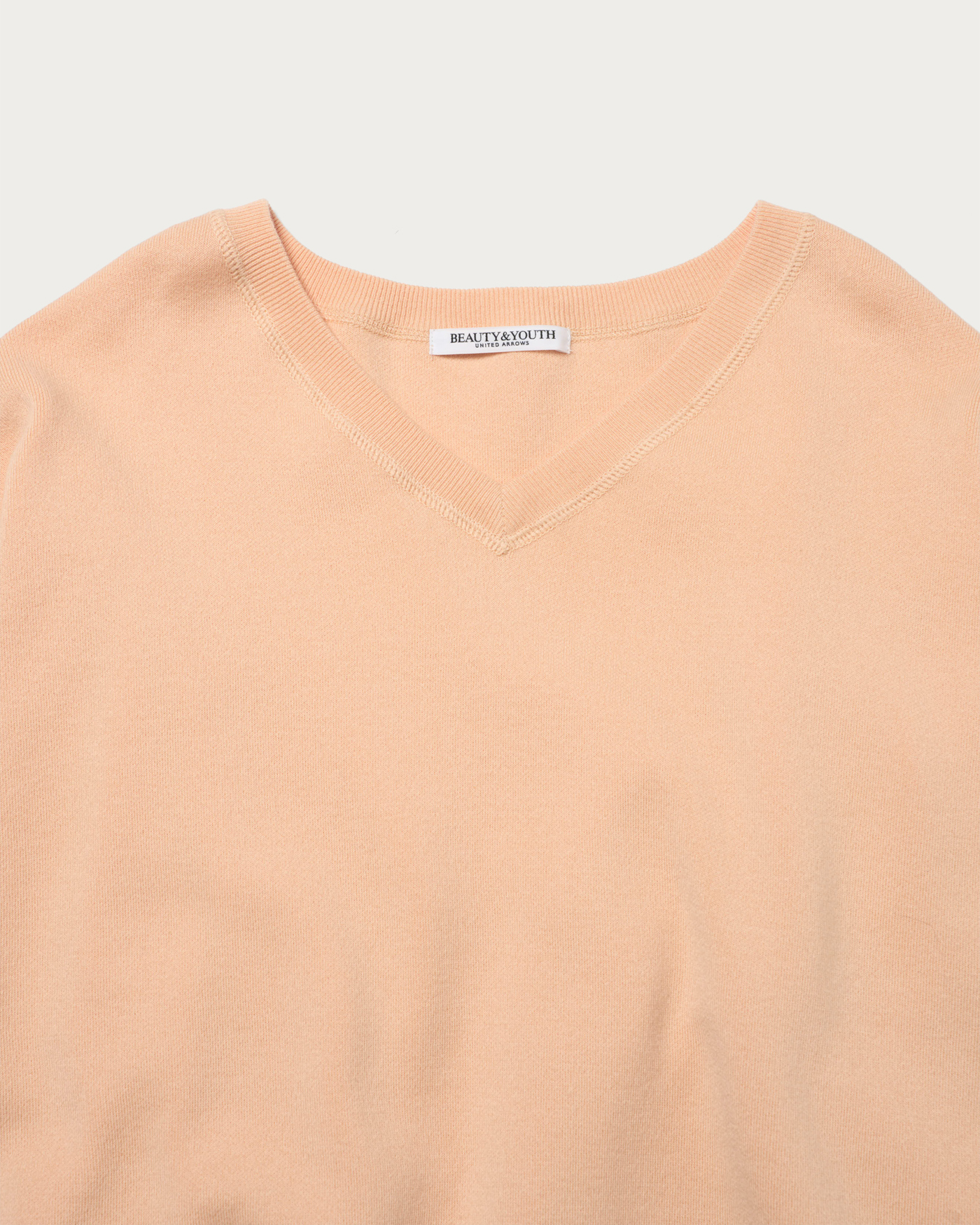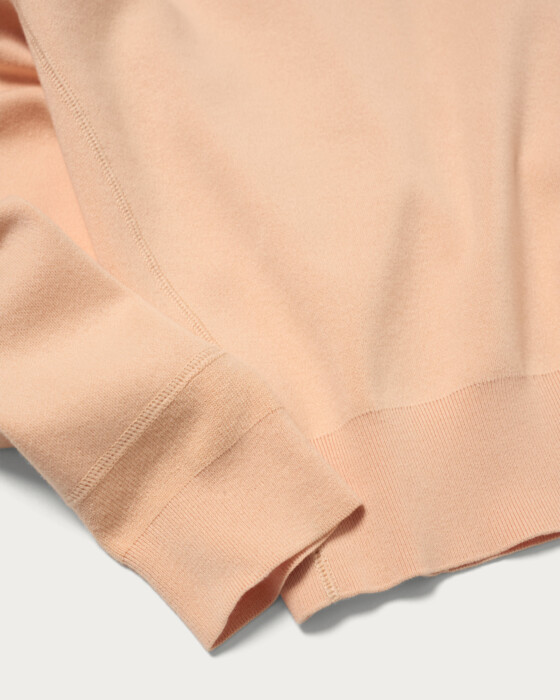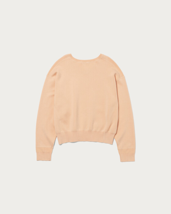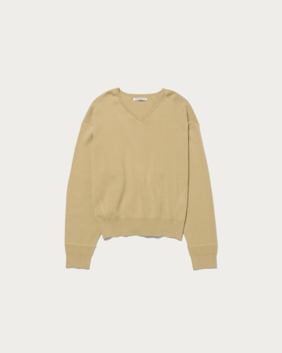 A knit pullover made from soft, smooth-knit cotton material that provides a plush feel. The combination of drop shoulders and a relaxed silhouette creates a garment that exudes a laid-back style. The clean V-neck, with its moderate opening, is a key feature, making it easy to wear on its own.