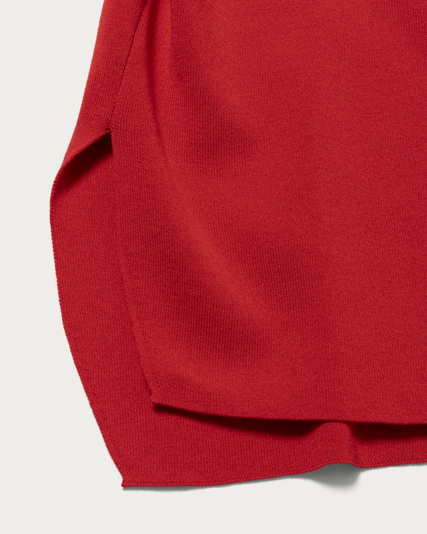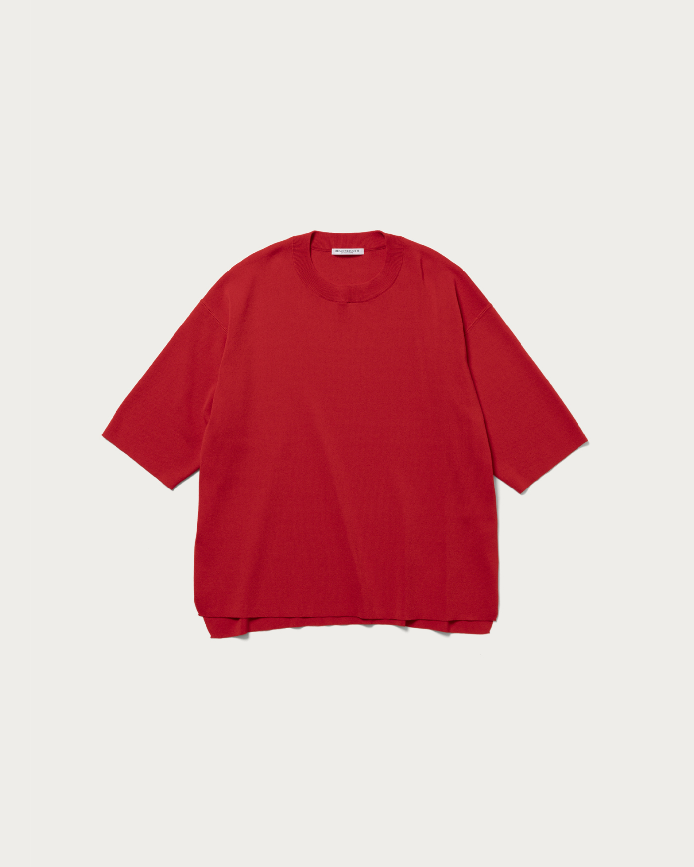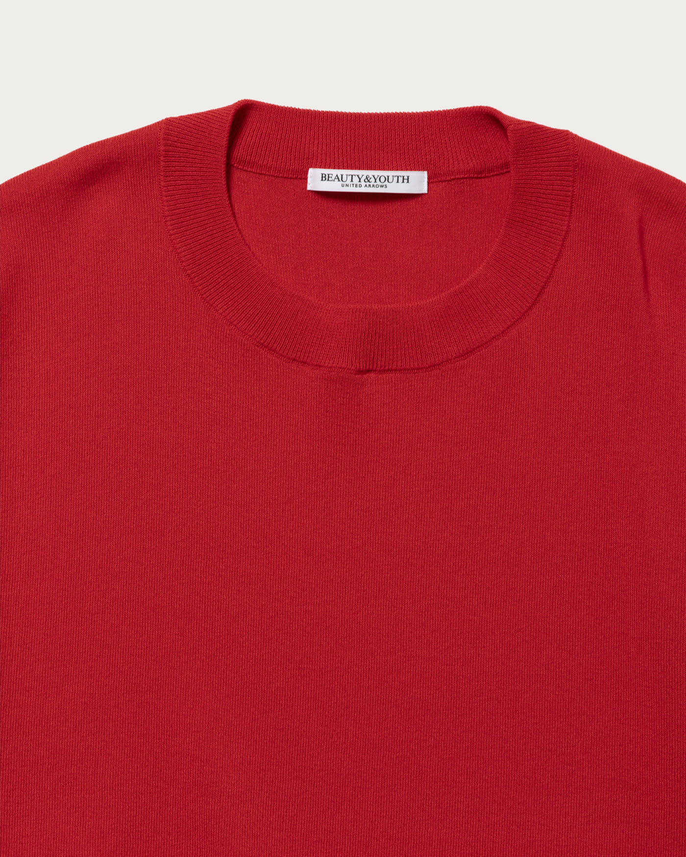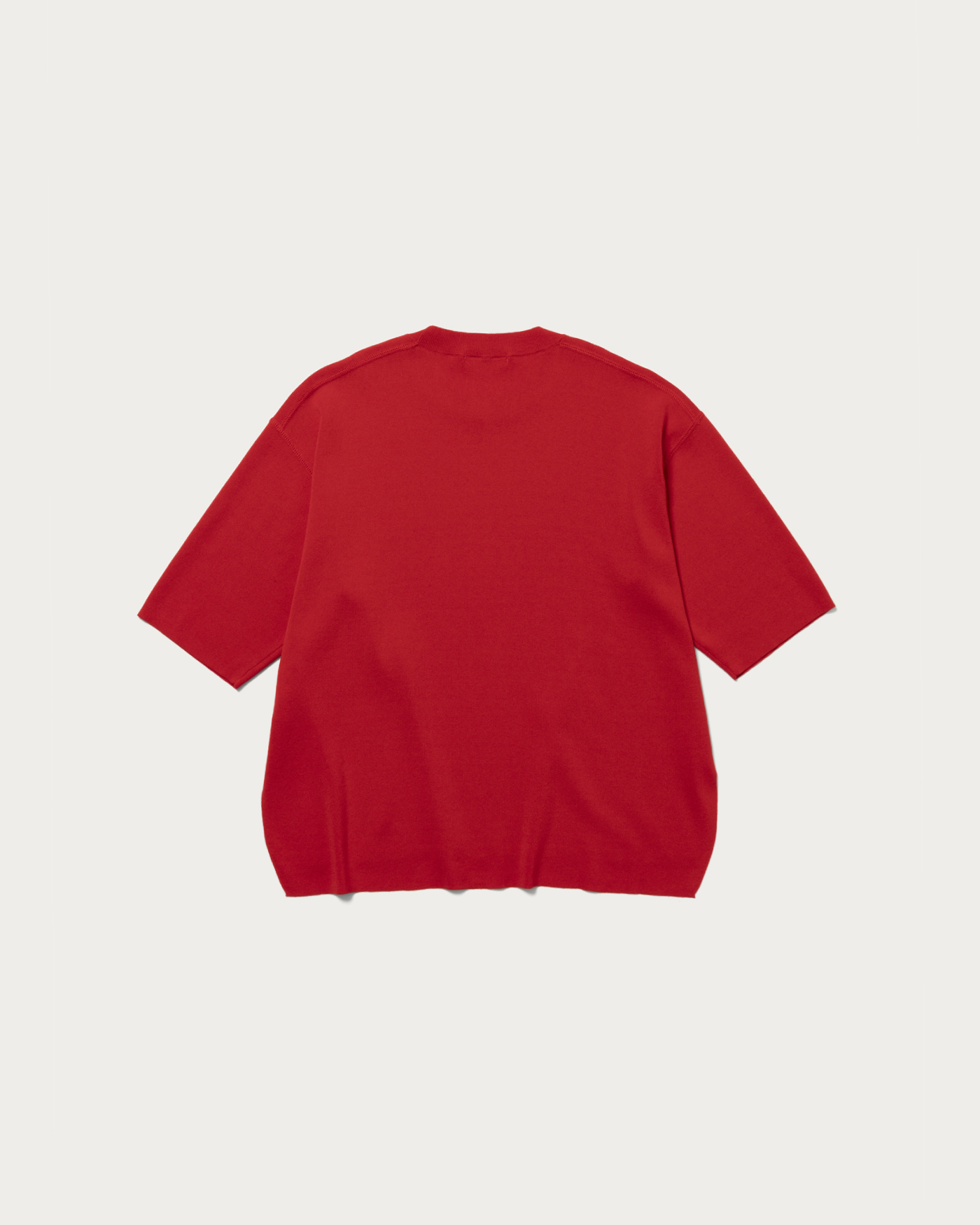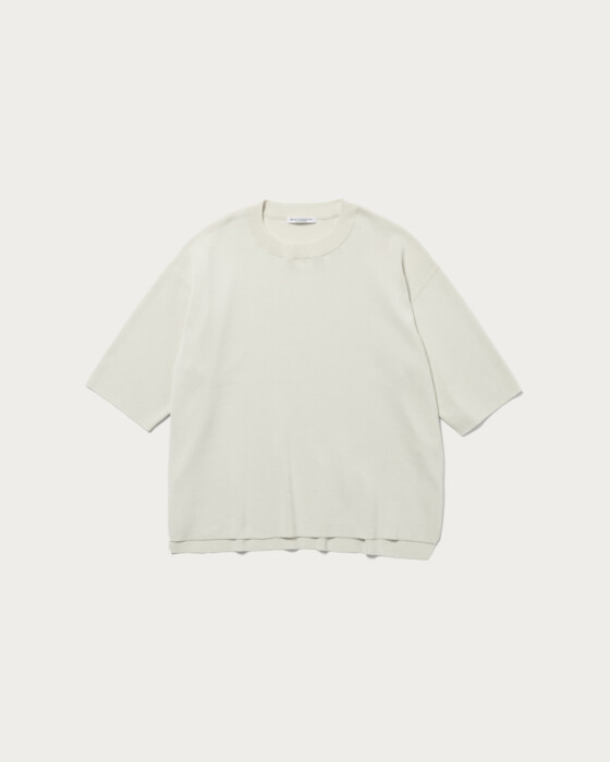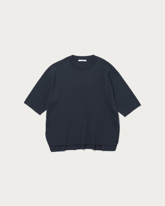 A knit pullover crafted from a blended yarn of cotton and polyester, offering a crisp texture. While it maintains a flat feel similar to a T-shirt, the rounded hem adds an elegant touch to the piece. Available in three colors: off-white, red, and navy.