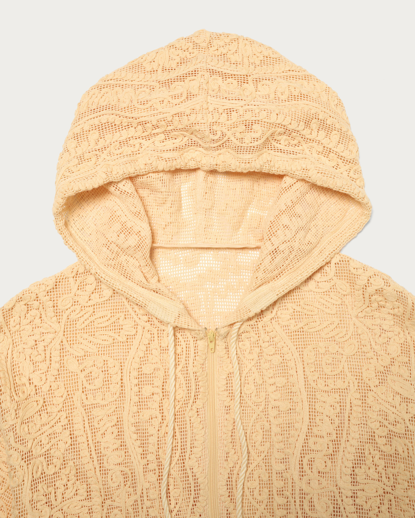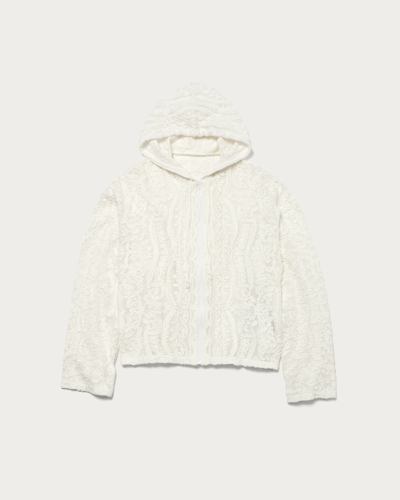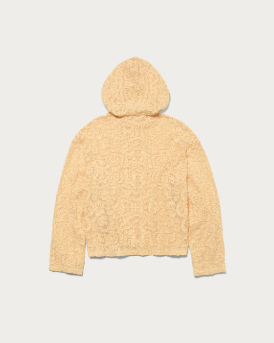 We have crafted a daily casual look by making the striking lace material the star of this simple hoodie design. It features a comfortable size that allows for easy layering. The key highlights are the natural texture of the cotton and the oriental-inspired tape embroidery pattern.