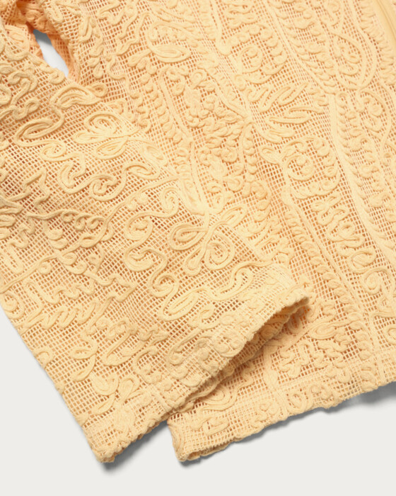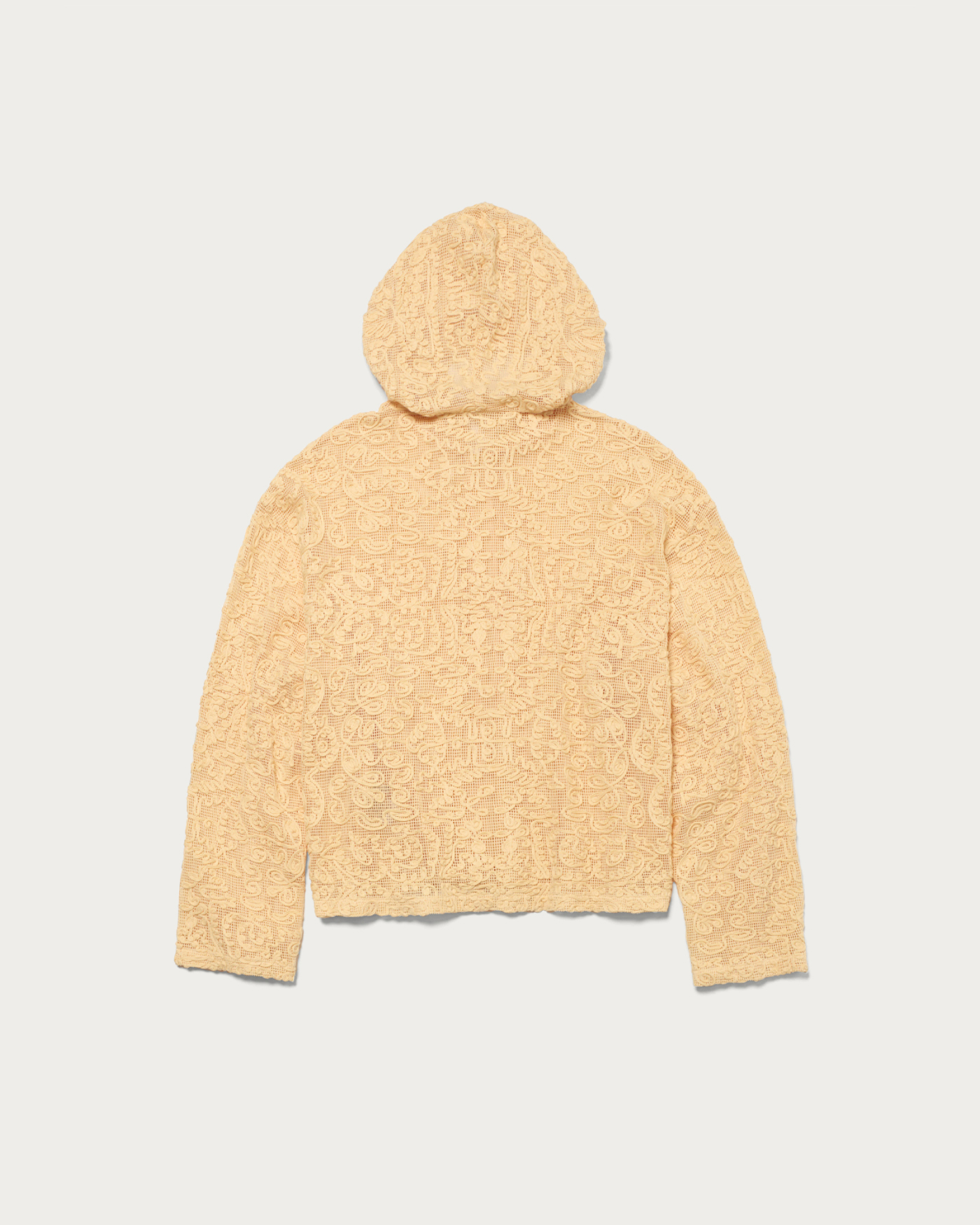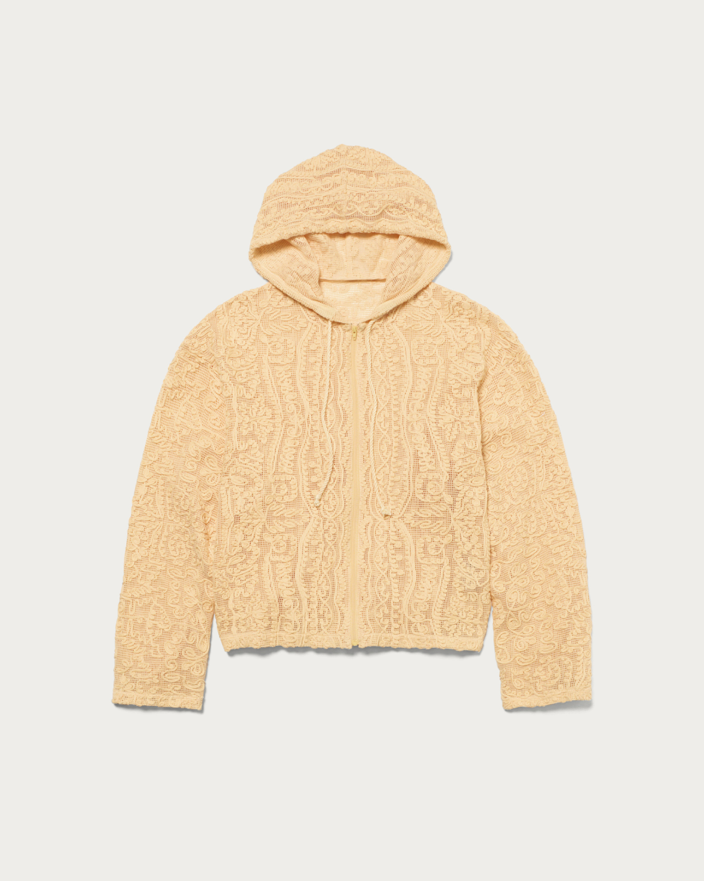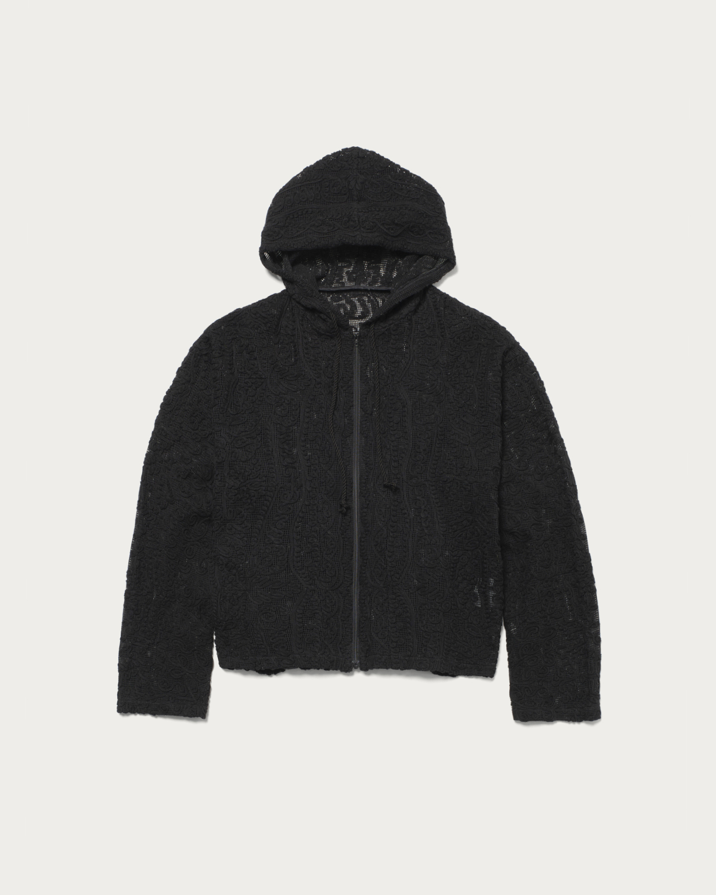 We have crafted a daily casual look by making the striking lace material the star of this simple hoodie design. It features a comfortable size that allows for easy layering. The key highlights are the natural texture of the cotton and the oriental-inspired tape embroidery pattern.
