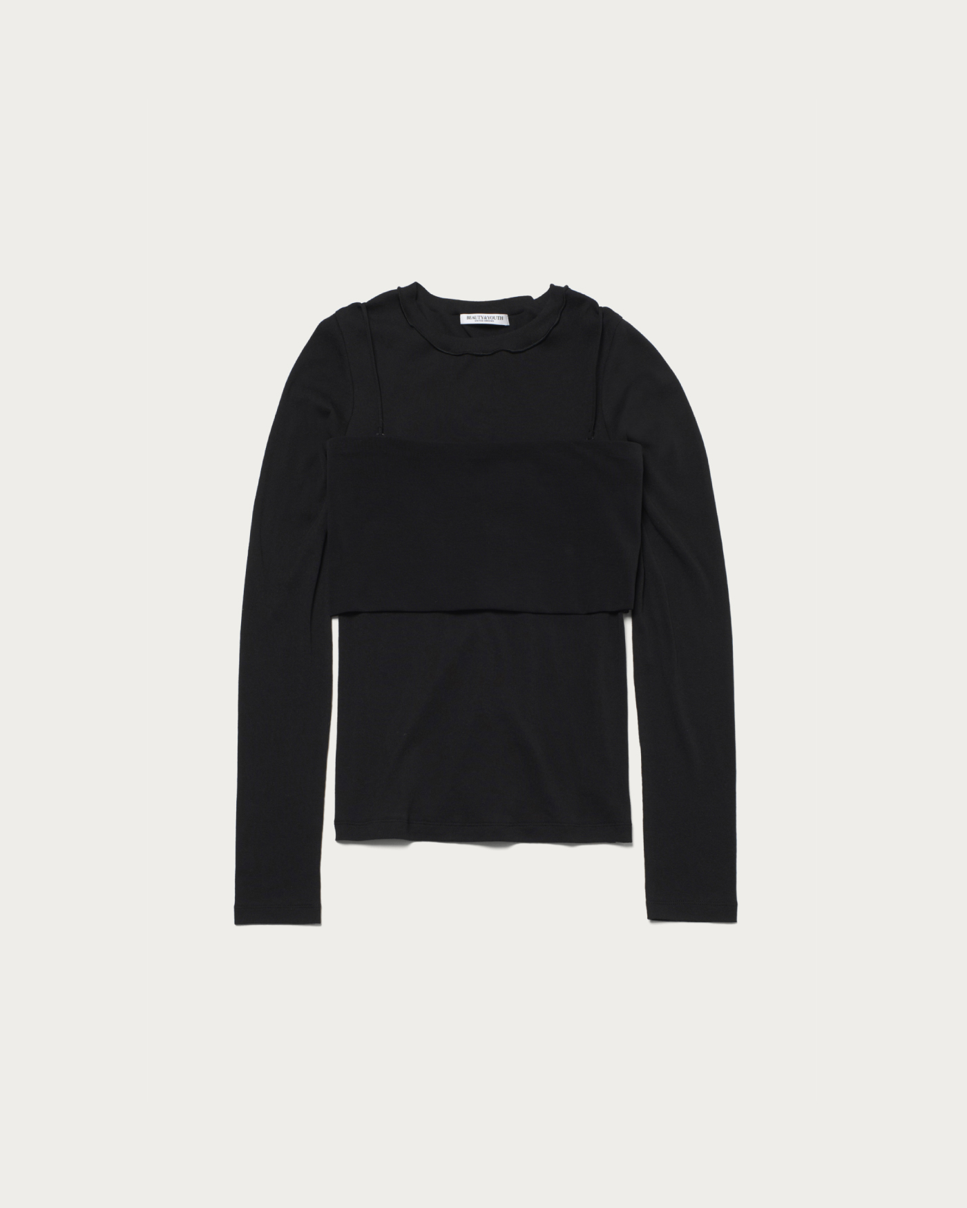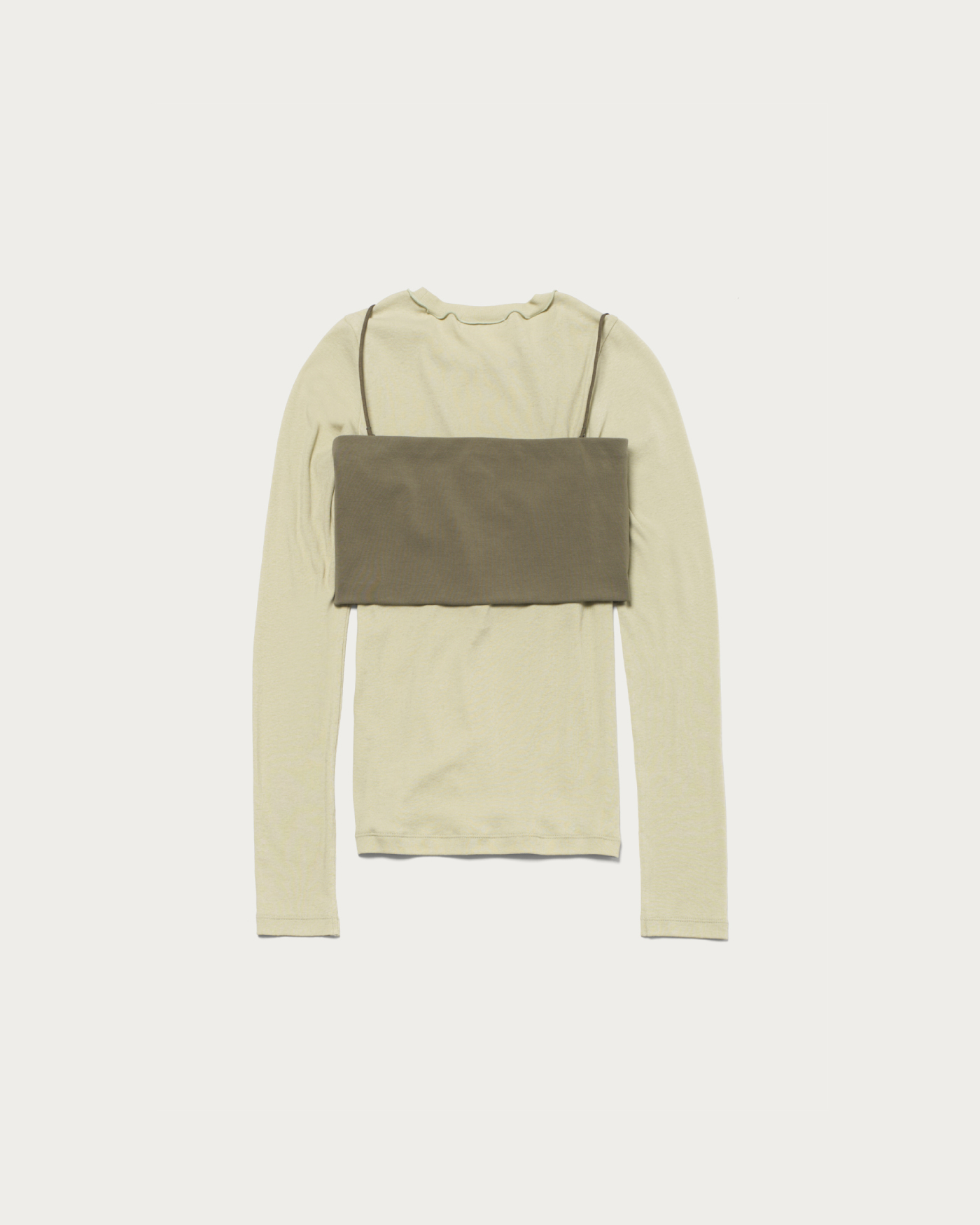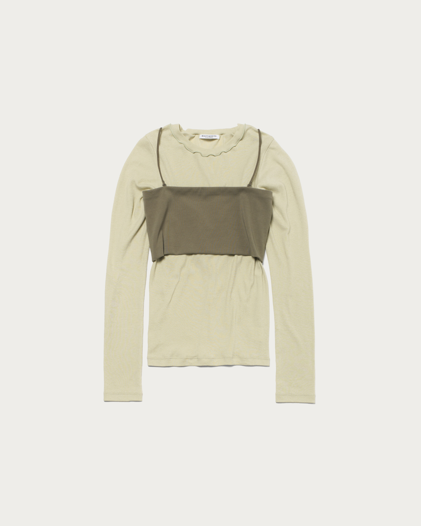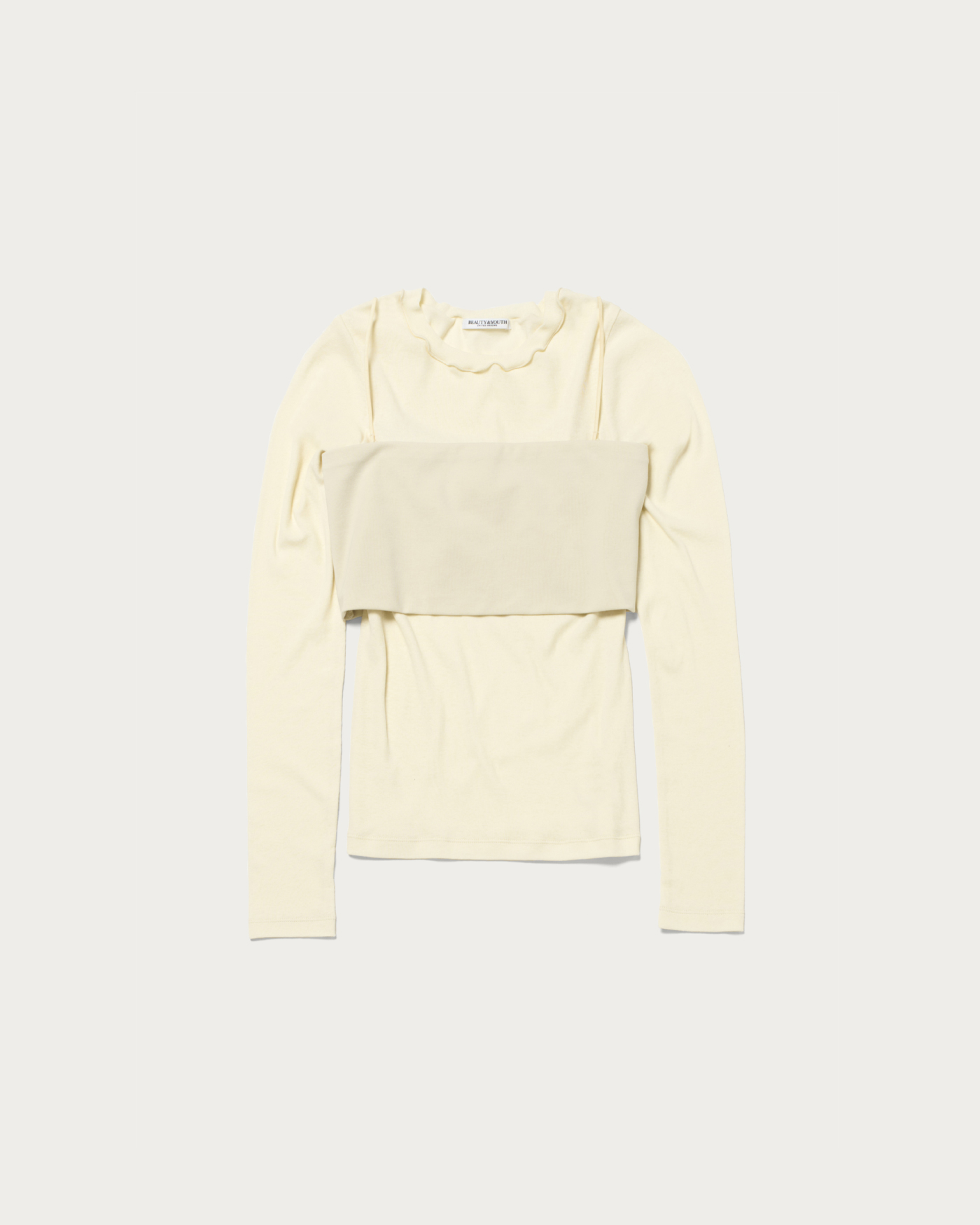 A cut-and-sew top set that includes a long sleeve and a bandeau. By layering the sheer material long sleeve with the bandeau, you achieve a simple yet modern styling with a sense of effortless elegance. The top features a sheer ribbed material with a textured appearance, while the bandeau offers an appealing hold when worn. The shoulder straps of the bandeau are removable.