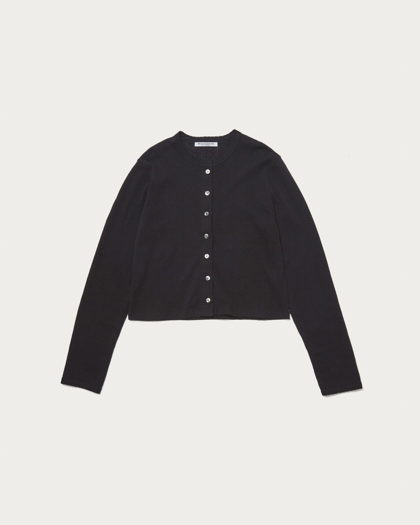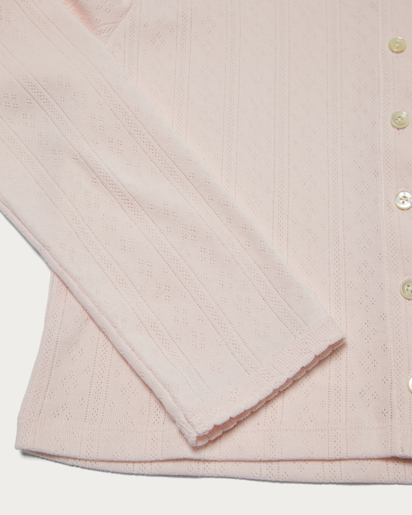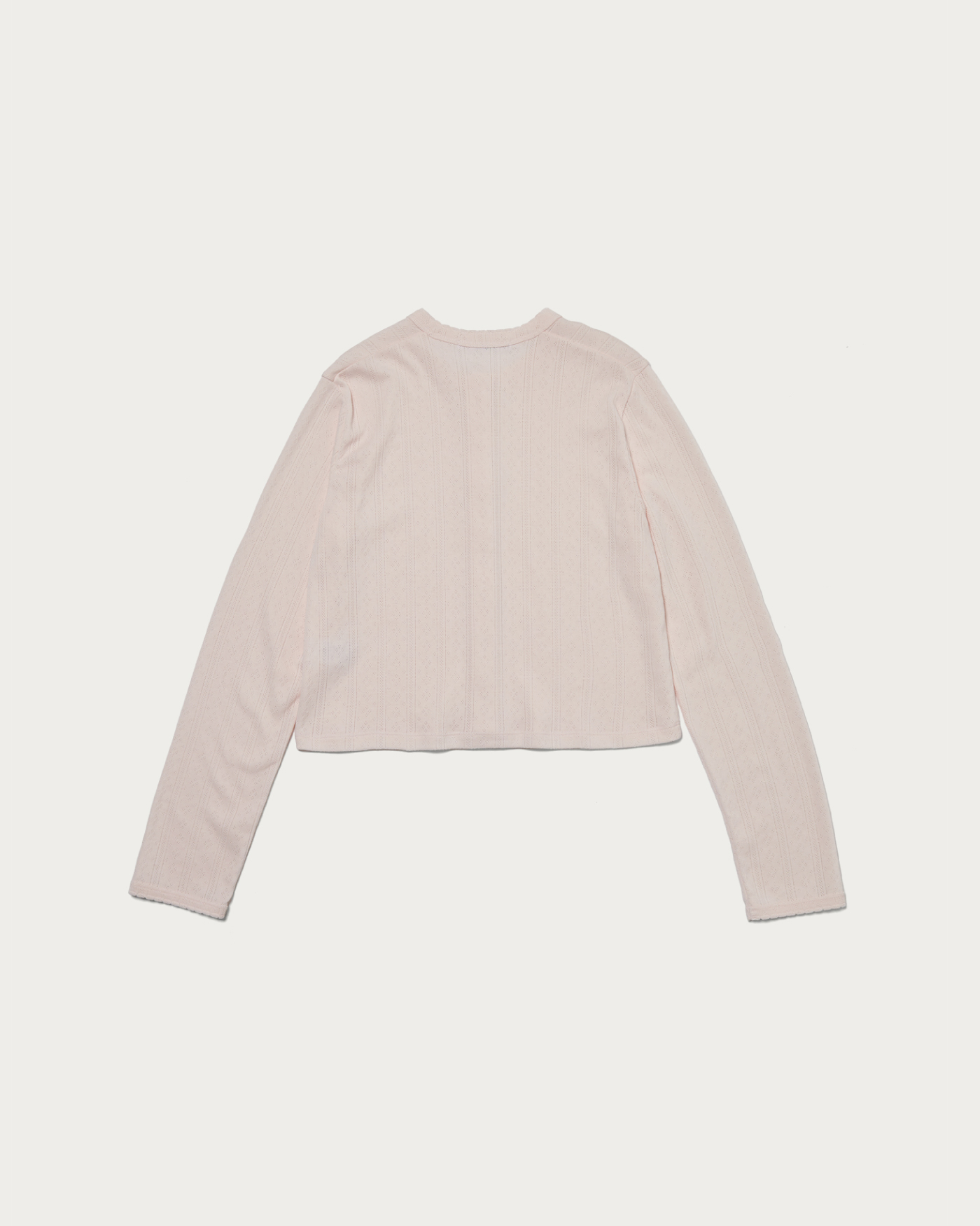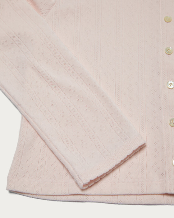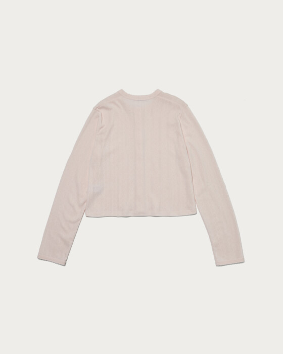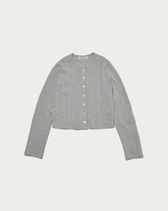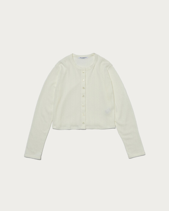 A compactly sized cut-and-sew cardigan designed to be worn as a single piece by closing the front. Special sewing machines were used on the neckline and cuffs to add scallop details, complementing the feminine fabric. The cotton pattern mesh offers excellent stretch, with a soft texture and comfortable fit that are truly appealing.
