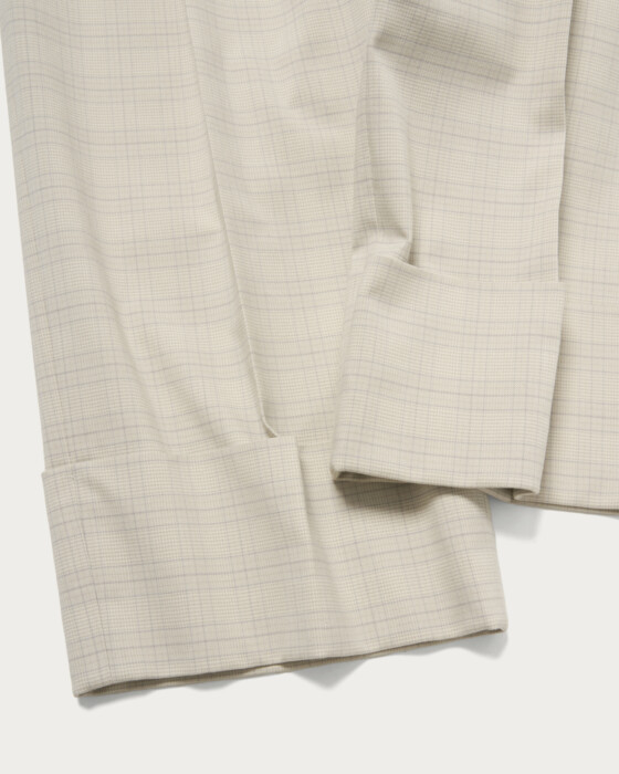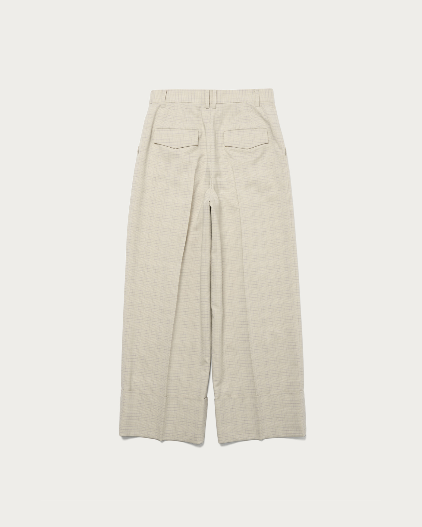 We created a check pattern by mixing soft colors with a moderately voluminous material. The key features are the simple and clean impression around the waist and the wide cuff details at the hem. We recommend a spring-like set-up styling by pairing the wide-hem pants made from the same material with a frill blouse.