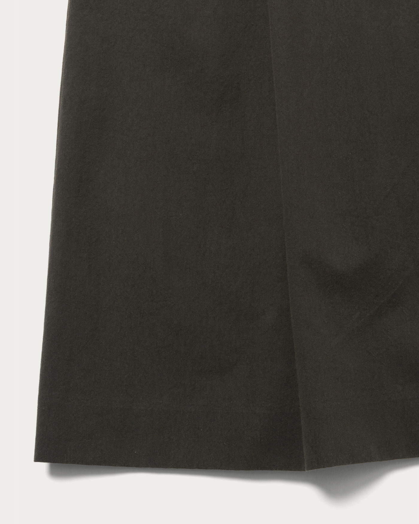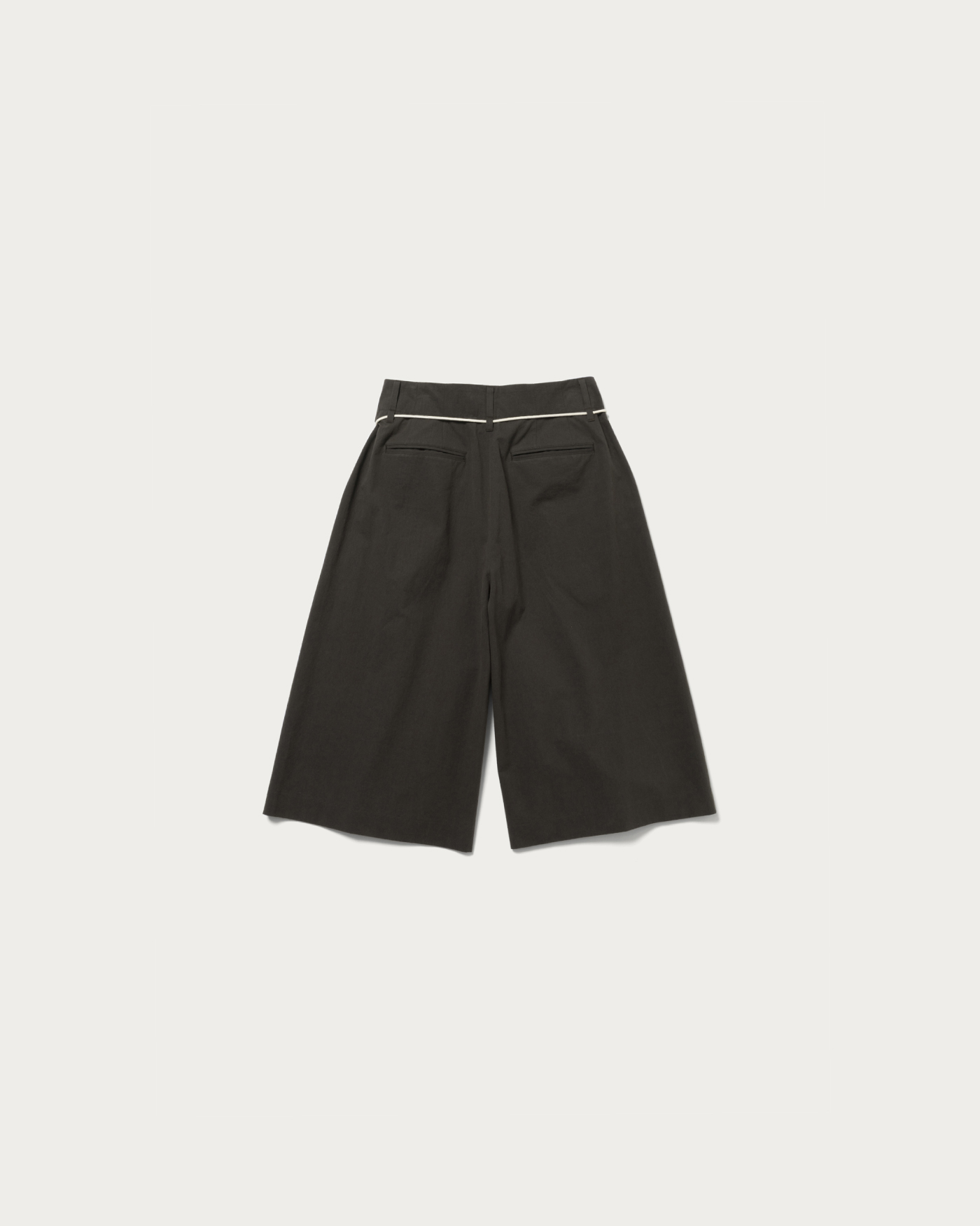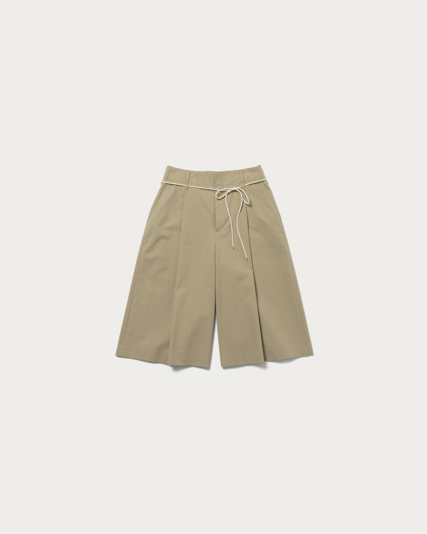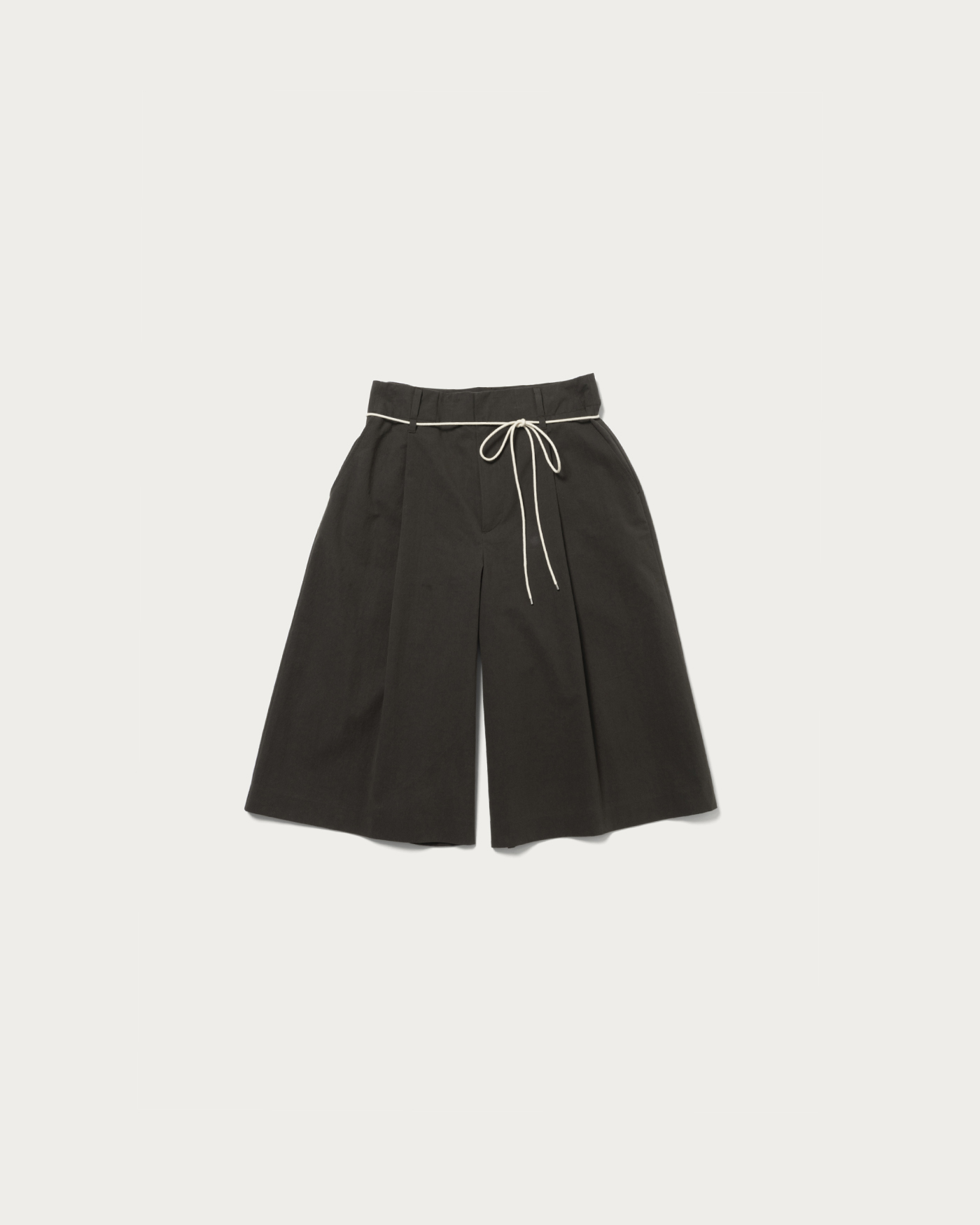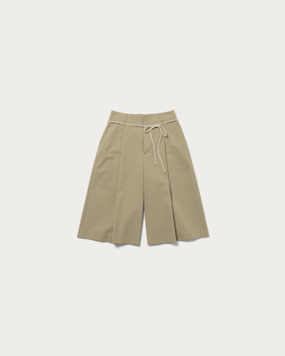 Wide silhouette knee-length shorts. The A-line silhouette creates a sleek look for your legs. Made from 100% cotton twill, the fabric is crafted from compact organic cotton with minimal fuzz, and a special treatment gives it a vintage texture. The highlight is the contrasting thin cord belt at the waist.