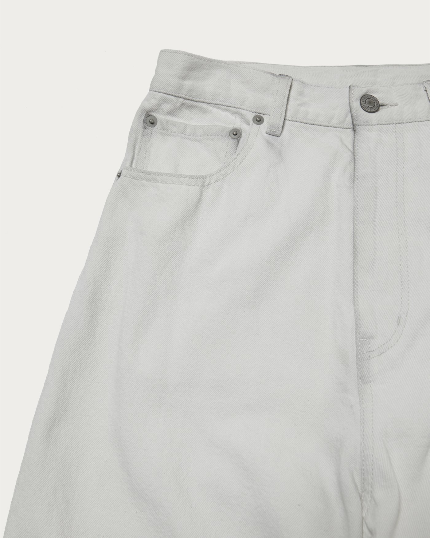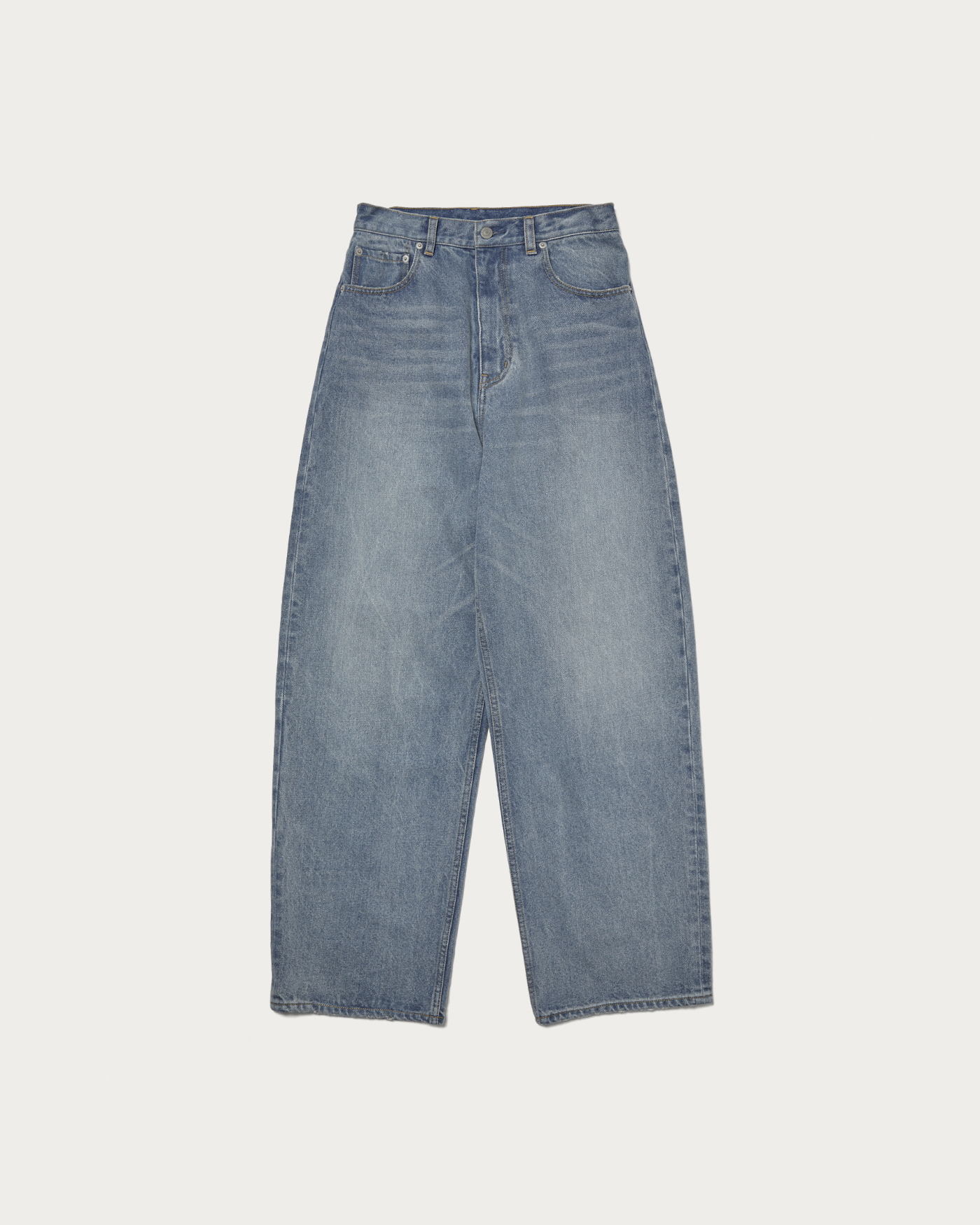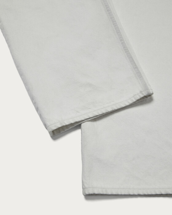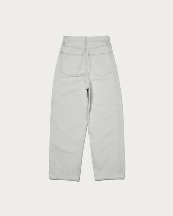 The loose silhouette denim is designed to be worn slightly low on the hips, with a deeper rise than usual. It is available in three colors: indigo, white, and beige, which is expressed through garment dyeing. The beige option undergoes a stone bio wash after dyeing to add a worn-in feel. We recommend pairing it with hand-knitted or faded knitwear from the same collection for a casual yet trendy look.