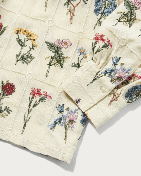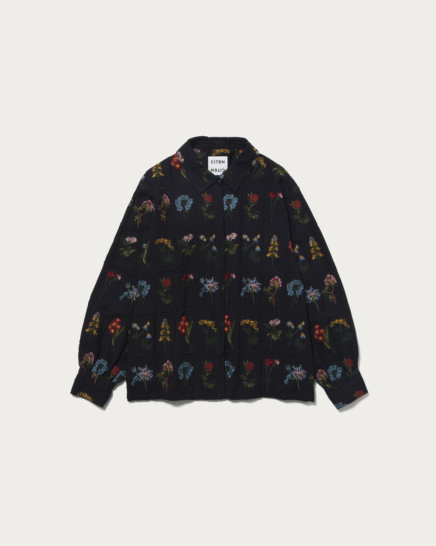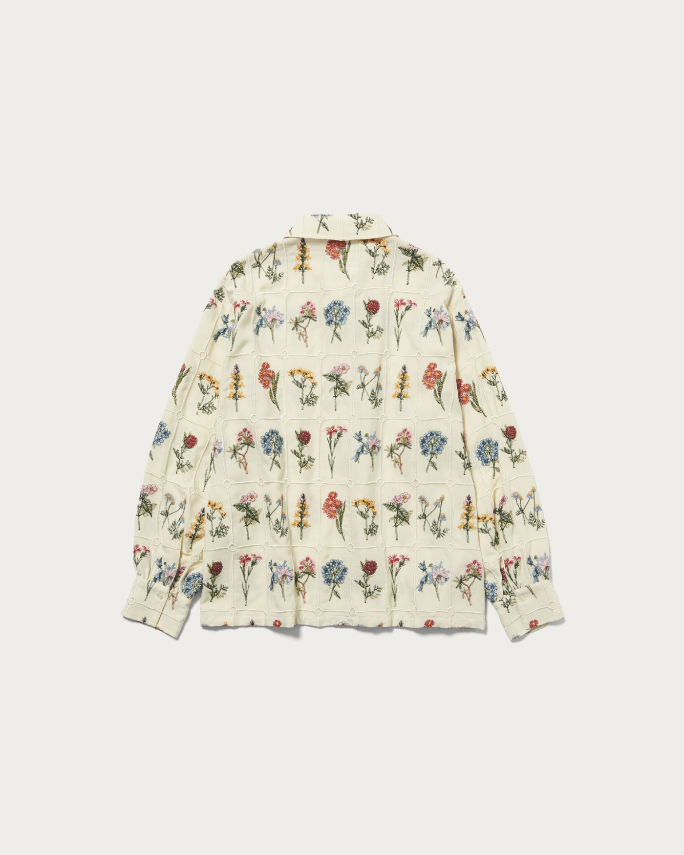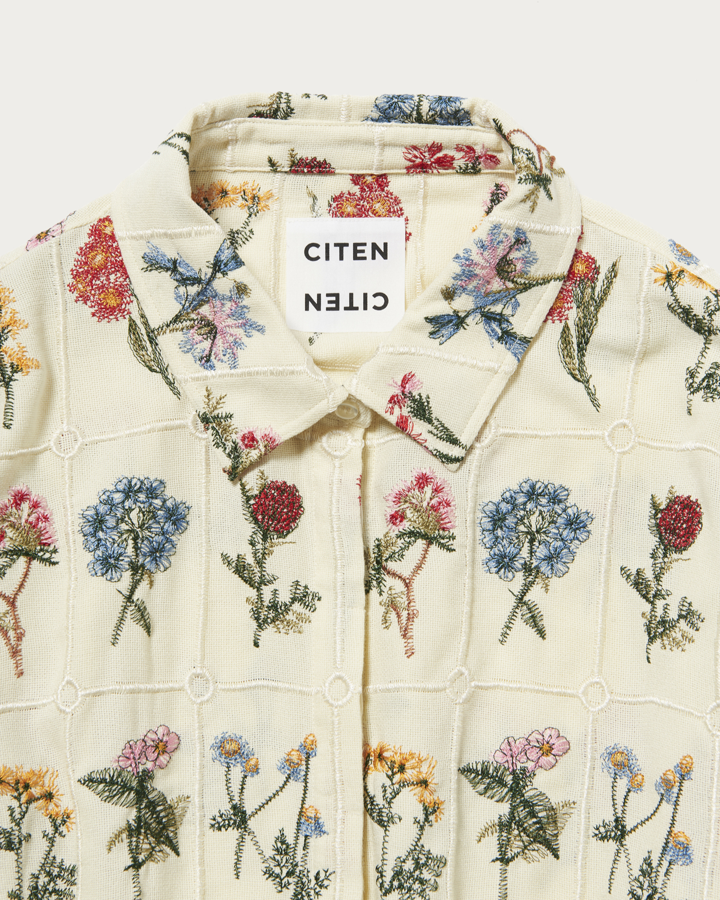 An item adorned with block-style floral embroidery all over. This piece stands out on its own, making it a catchy trend item that completes your styling effortlessly. There are also pants and vest items available in the same material.
