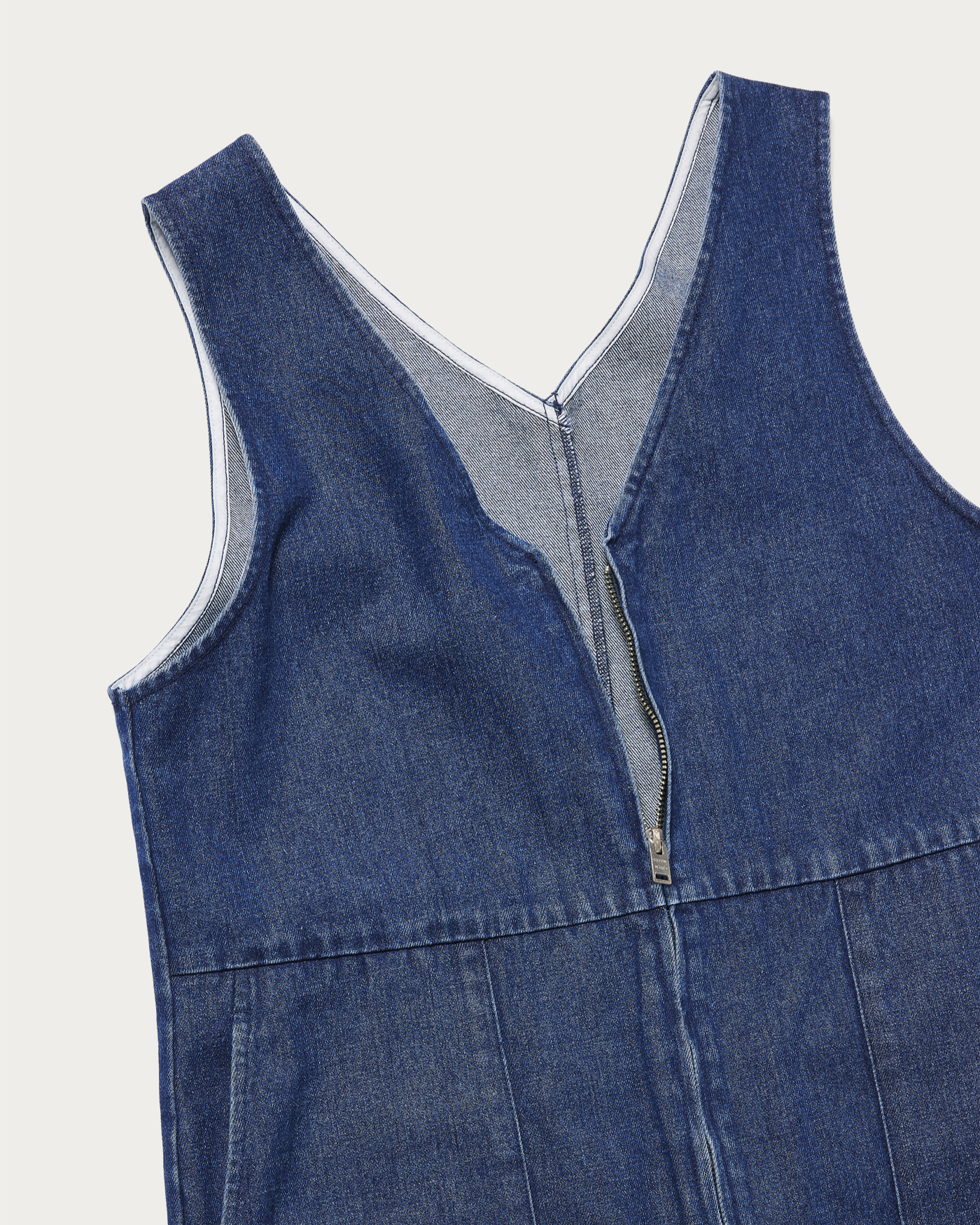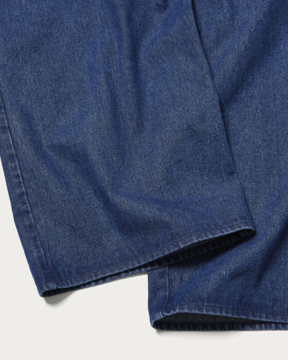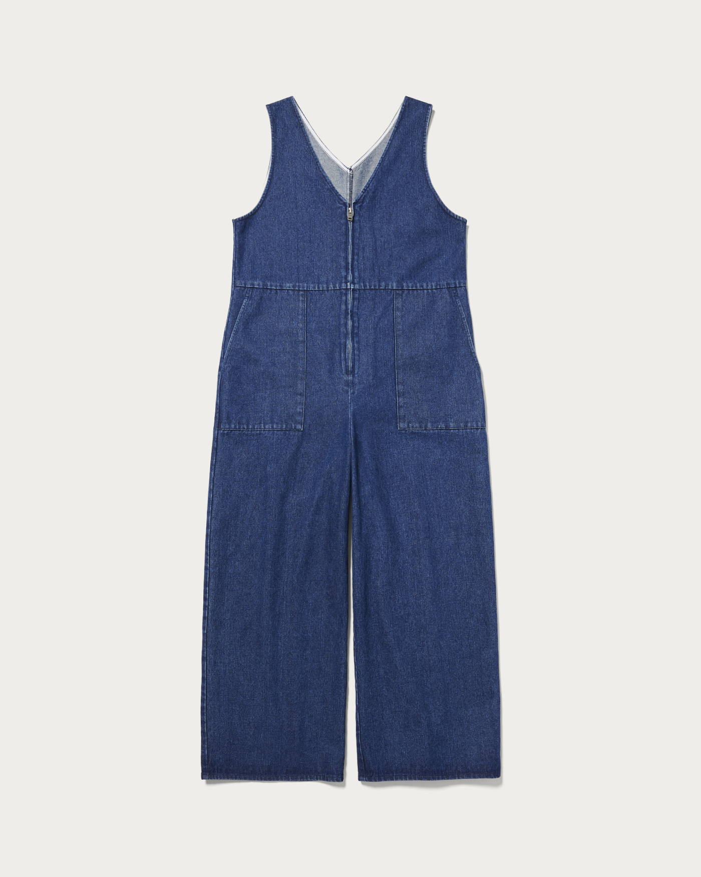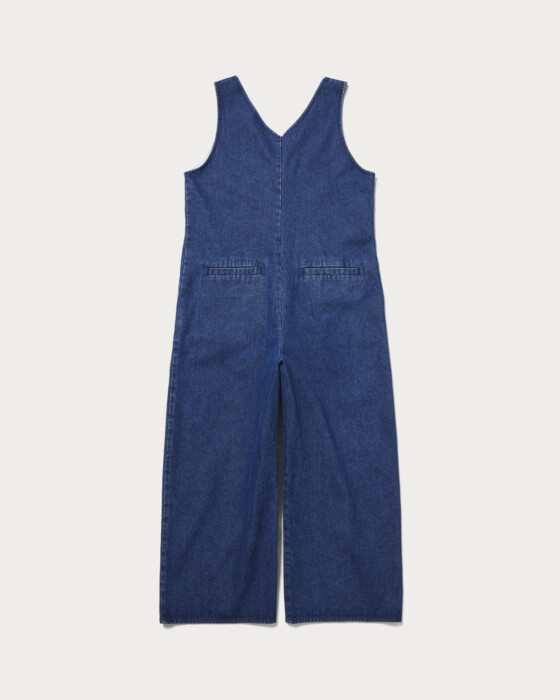 The deep V-neck creates a sleek look around the face, and with the right inner layer, you can enjoy a wide range of styling options with this versatile denim all-in-one. Its moderately wide silhouette offers a relaxed fit that doesn't cling to the body, providing comfortable wear. Equipped with side pockets for added practicality, this piece is perfect for all seasons, making it a versatile addition to your wardrobe.