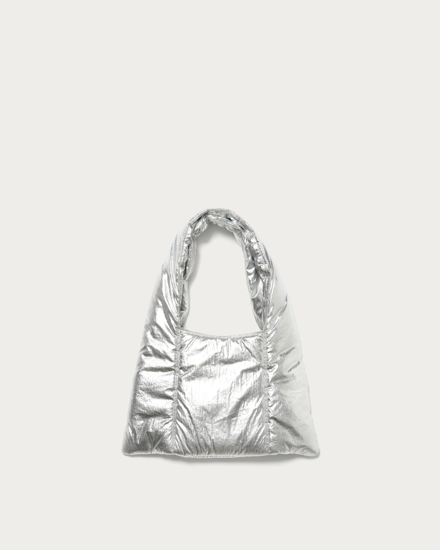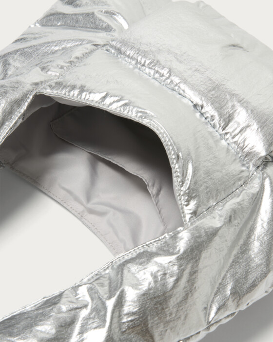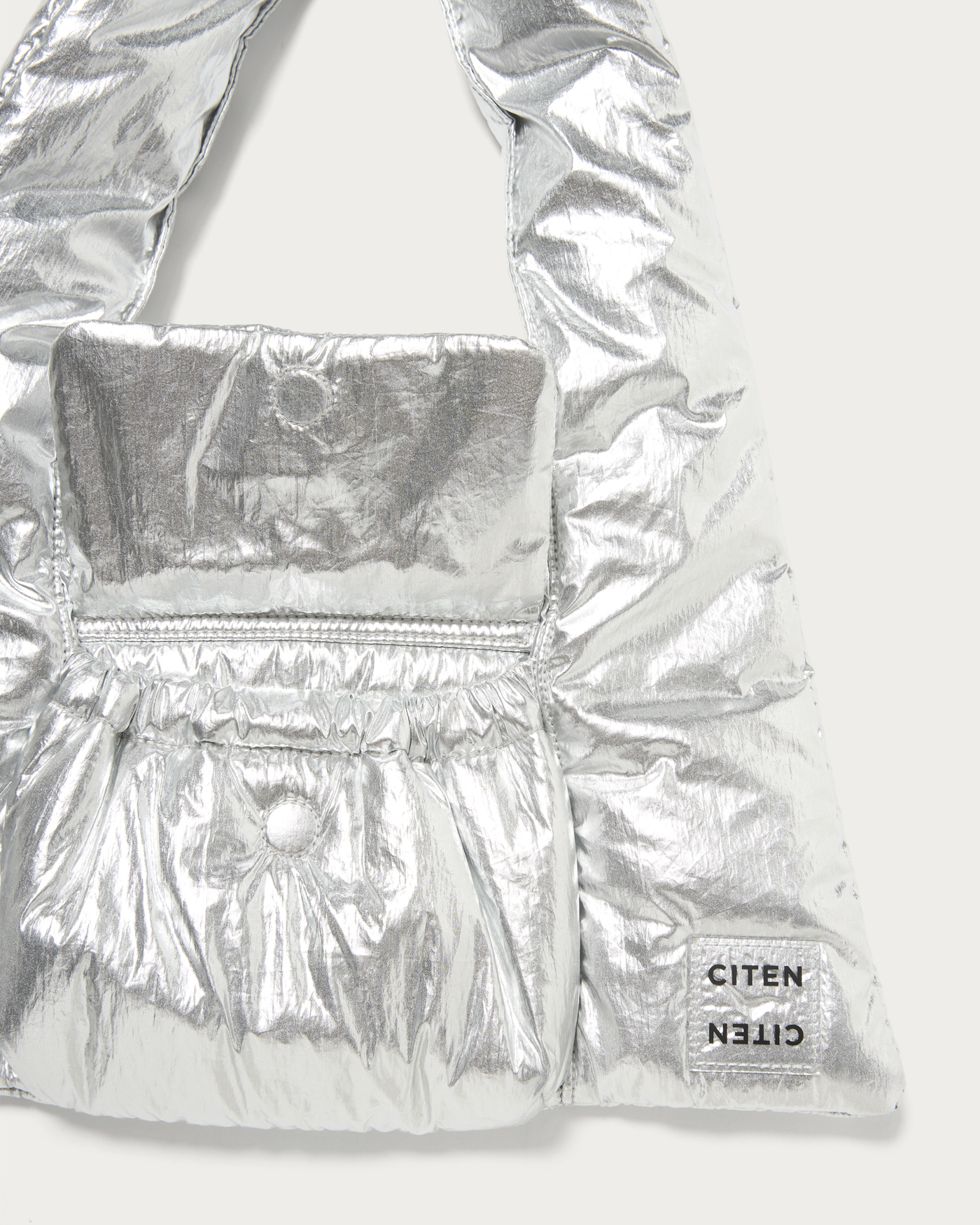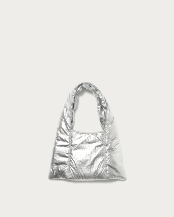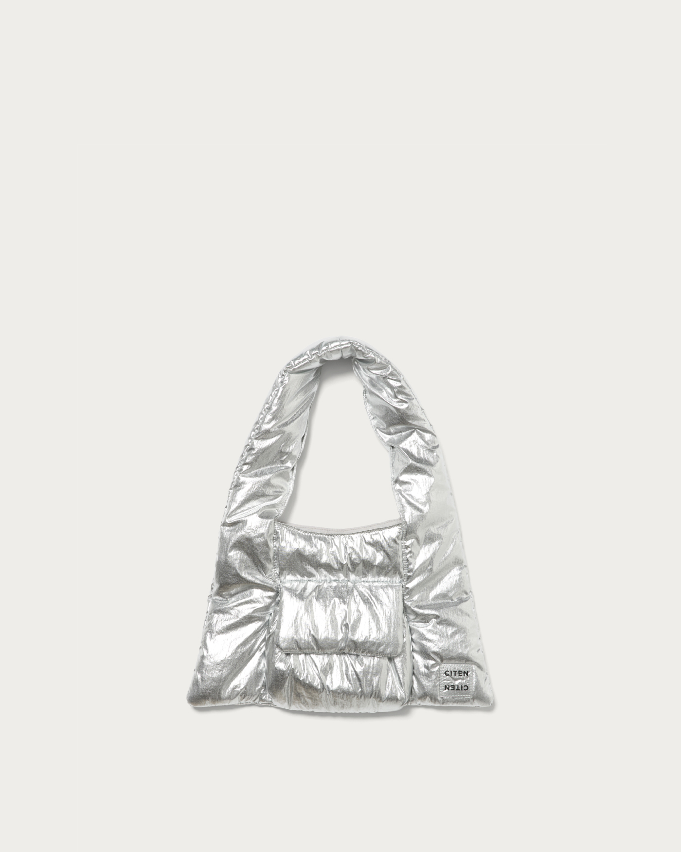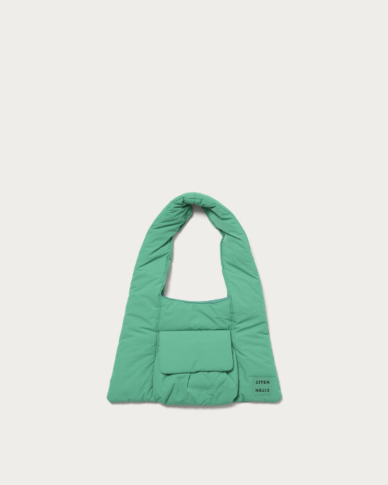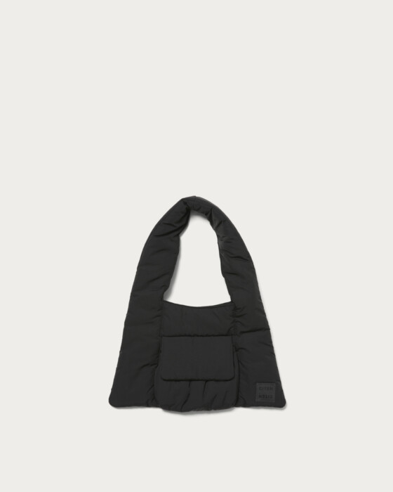A tote bag with a striking triangle silhouette and a plump, puffer-like feel. The design point is the front pocket with a puffy, three-dimensional flap. Made from a light and soft material, it's appealing for everyday use without any fuss. It has a size that can securely store all the essentials you need for going out. This item adds a playful touch to simple styling.