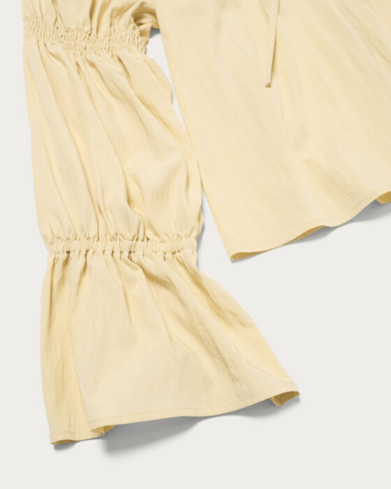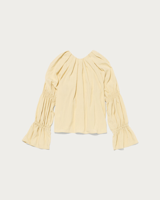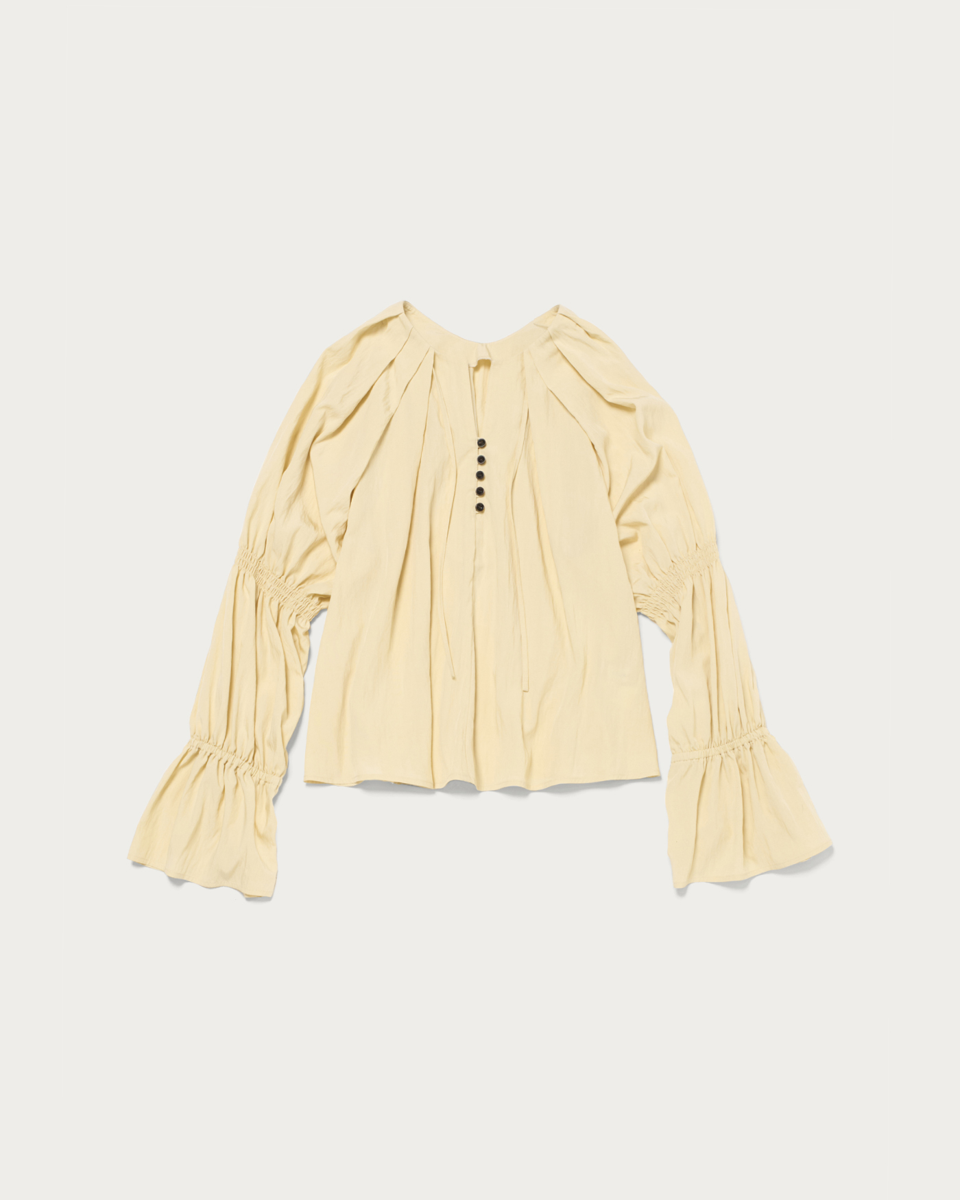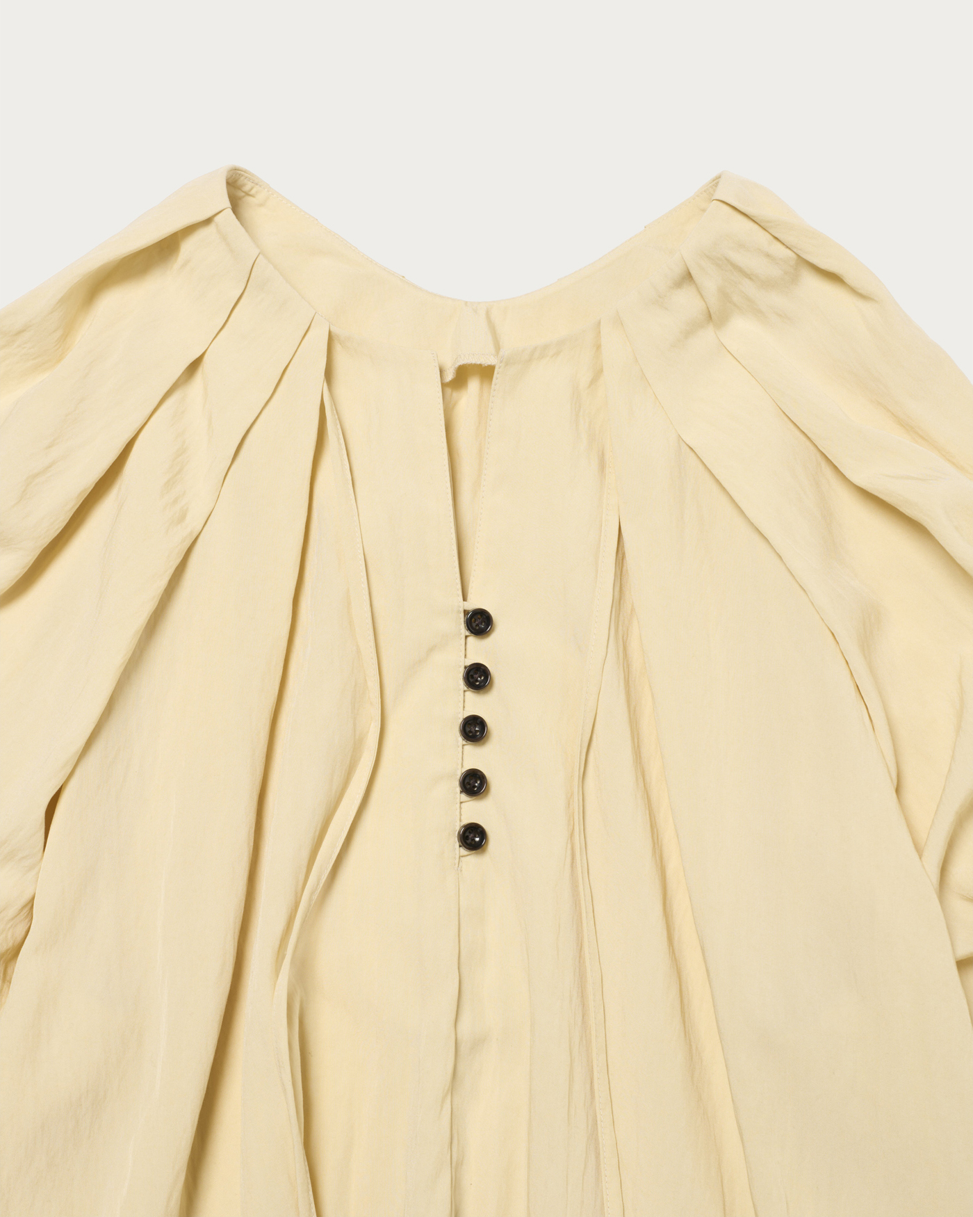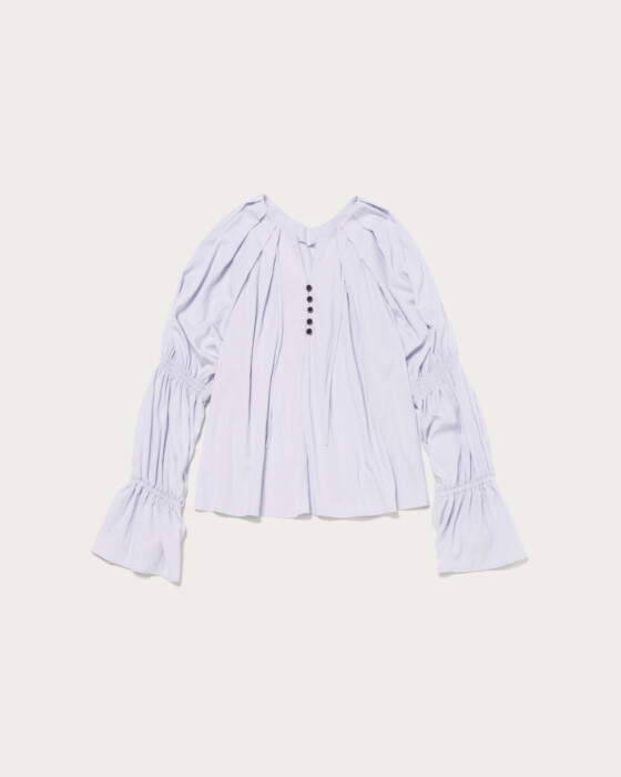 A spring-colored blouse with elegant tucks around the face, perfect for both on and off-duty wear. This blouse, with its attractive spring hues, features front buttons and elastic gathered sleeves as key design elements. The generous tucks from the shoulders to the neck create a three-dimensional shape that adds a touch of elegance around the face. The combination of a skipper and buttoned collar gives it a relaxed and effortlessly chic look.