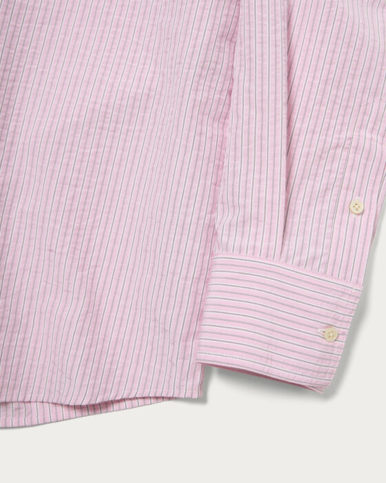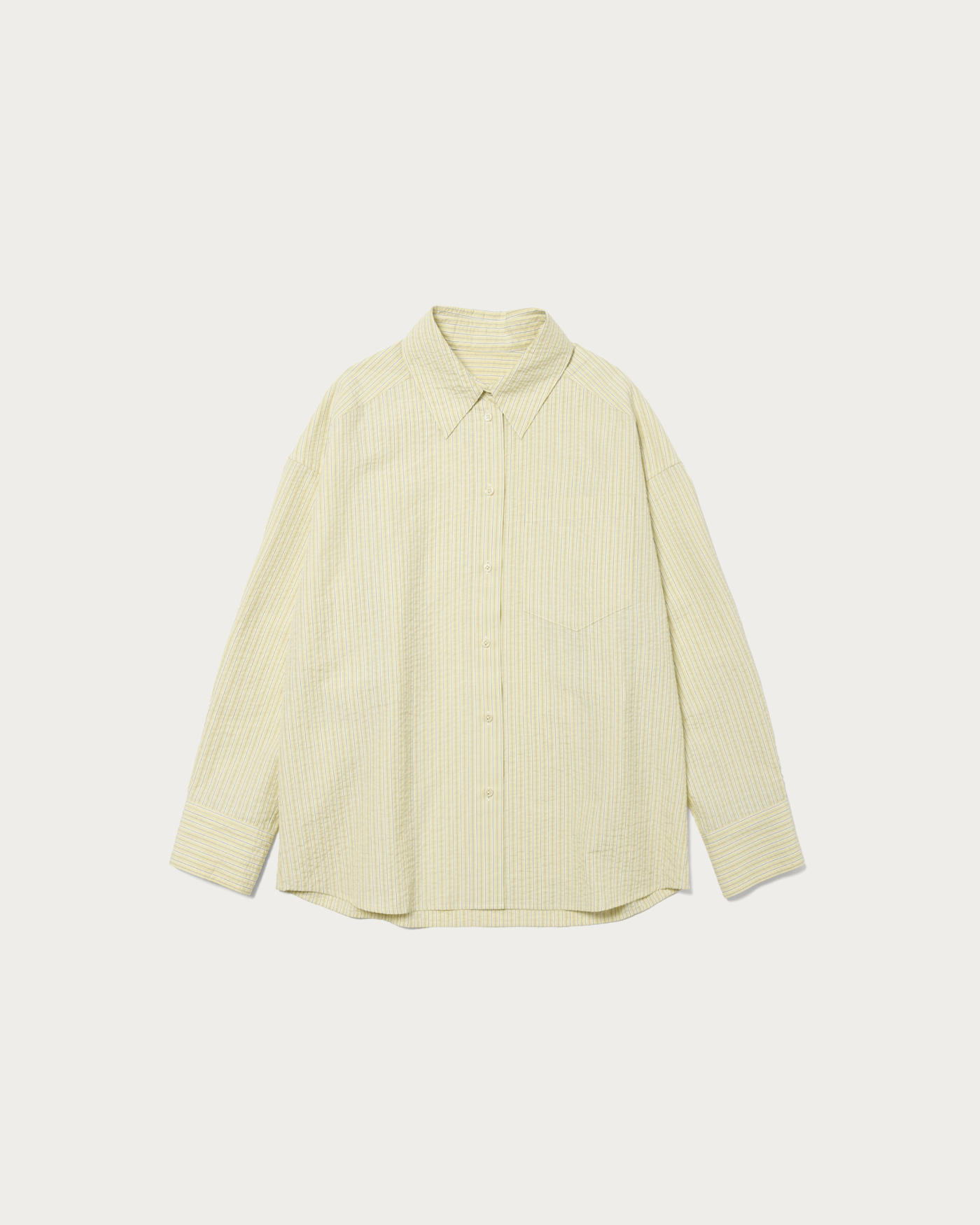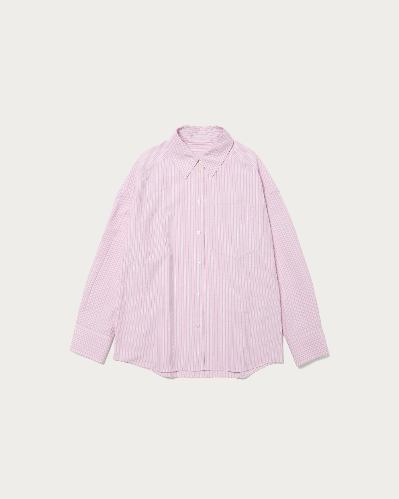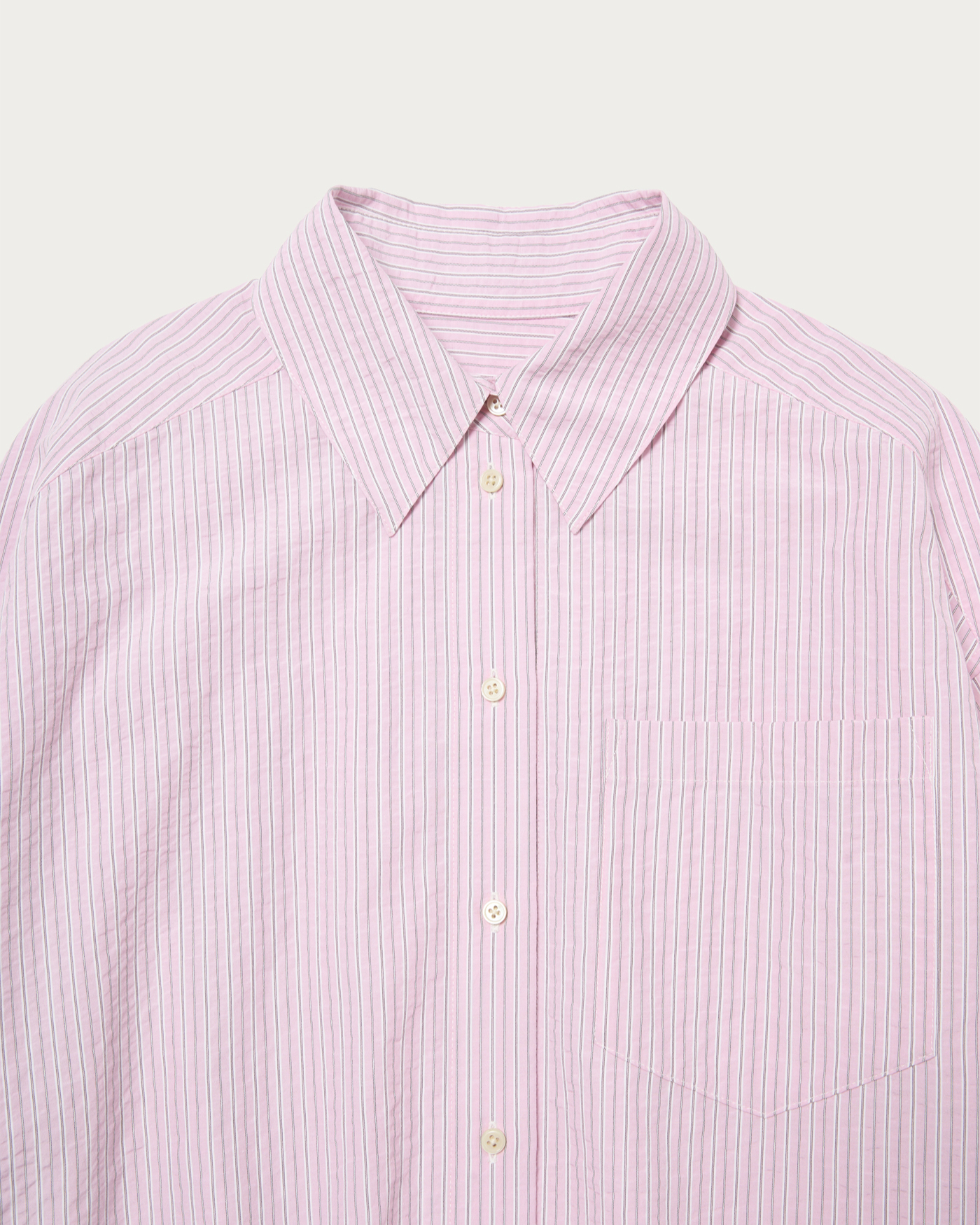 A casually draped striped shirt that you can throw on effortlessly. It features an oversized design with a relaxed vibe. The tucks on the sides create a gathered look when worn loosely, enhancing its sophisticated appeal. The pockets also serve as a key detail to keep the area around the face from looking too plain.